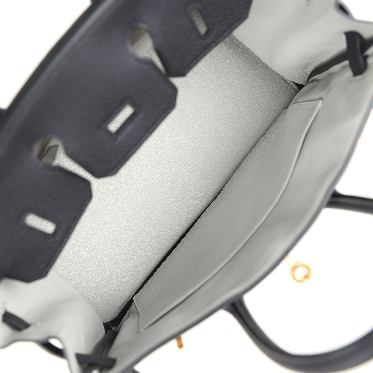 The interior is lined with Gris Perle chevre and has one zip pocket with an Hermes engraved zipper pull and an open pocket on the opposite side.