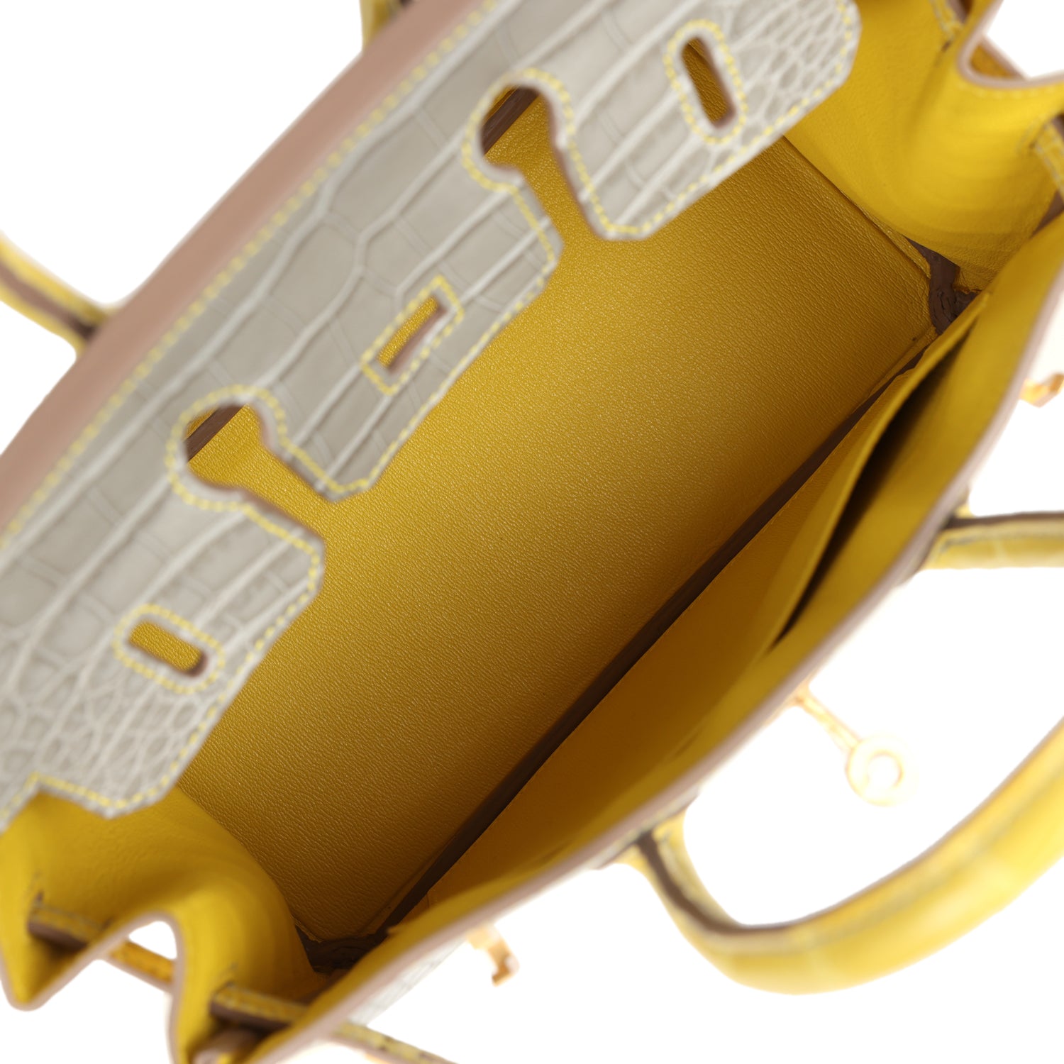 This Special Order Birkin is in Gris Perle and Mimosa matte Mississippienis alligator leather with brushed gold hardware and has contrast stitching, front strap, two straps with center toggle closure, clochette with lock and two keys and double rolled handles.