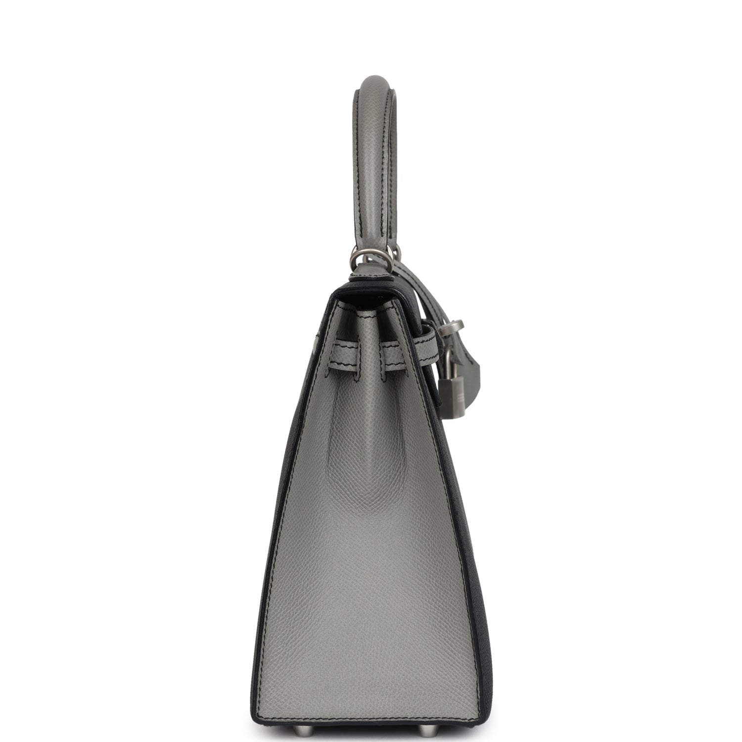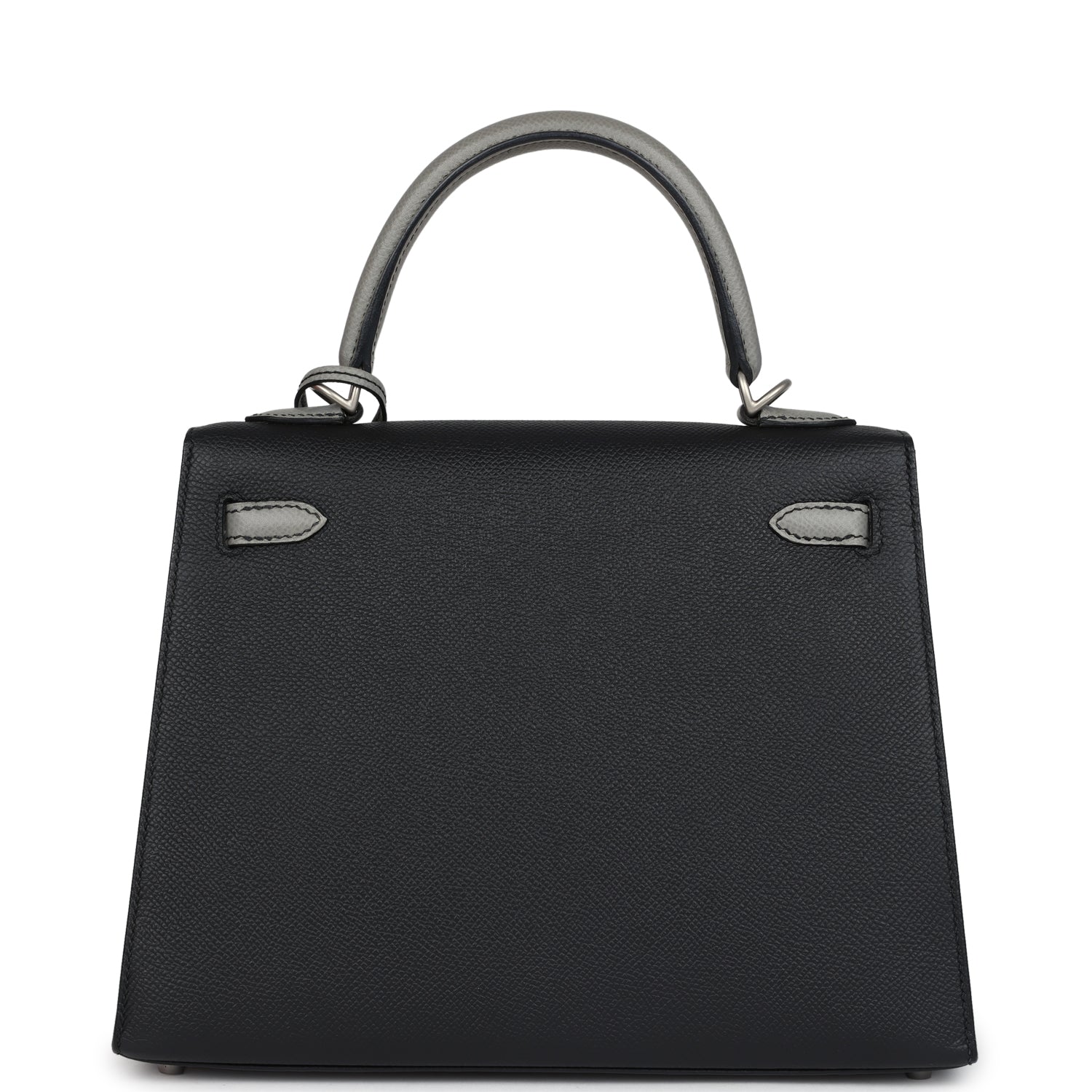 • Hermes Special Order (HSS) Kelly Sellier 25 Black and Gris Mouette Epsom Brushed Gold Hardware