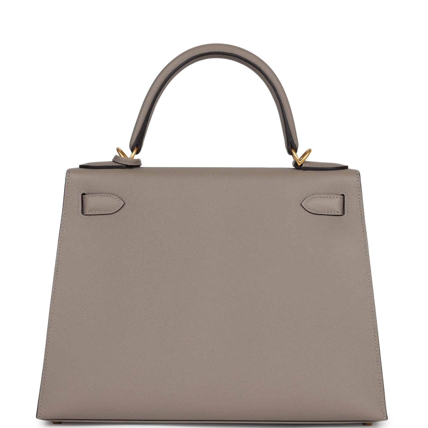This Special Order Kelly, in the Sellier style, is in Gris Asphalte and Rose Pourpre epsom leather with brushed gold hardware and has tonal stitching, front flap, two straps with center toggle closure, clochette with lock and two keys, single rolled handle and removable shoulder strap.