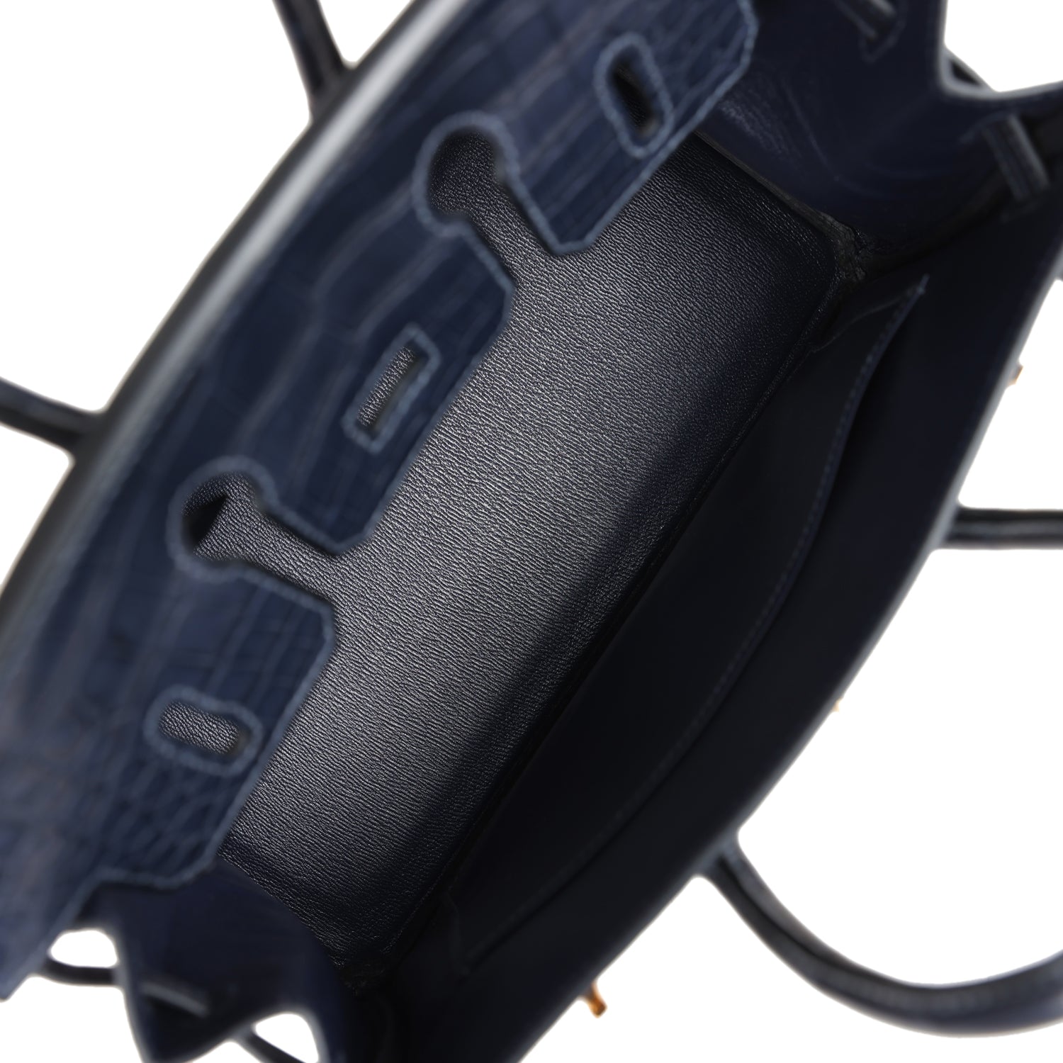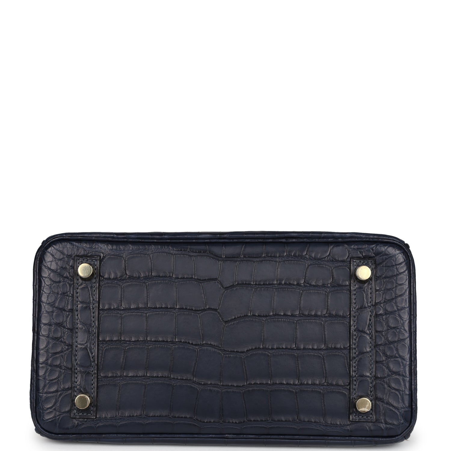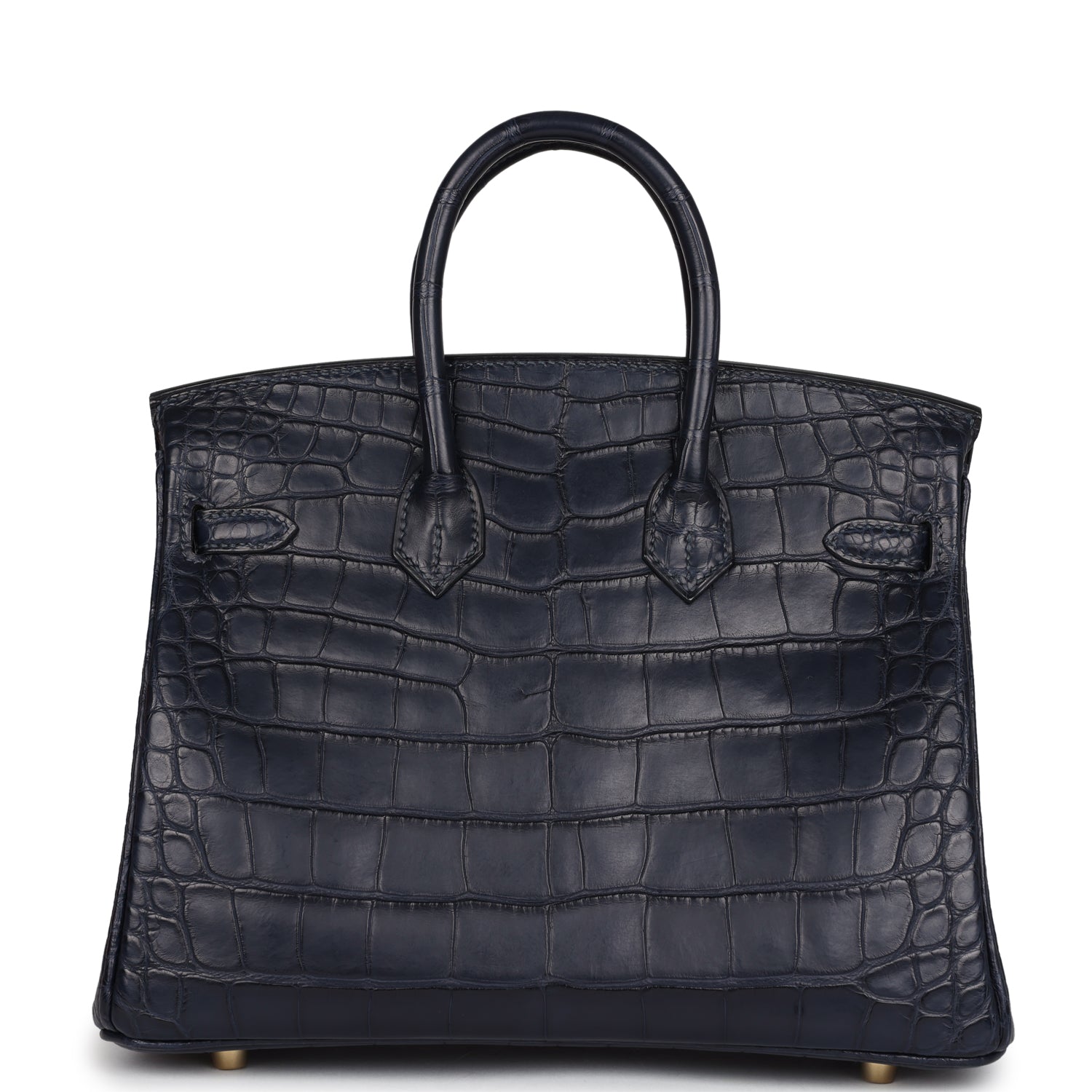This Birkin 25 is in Bleu Indigo Mississippiensis Matte Alligator leather with gold hardware, tonal stitching, front flap with two straps, front toggle closure, clochette with lock and two keys, and double rolled handles.