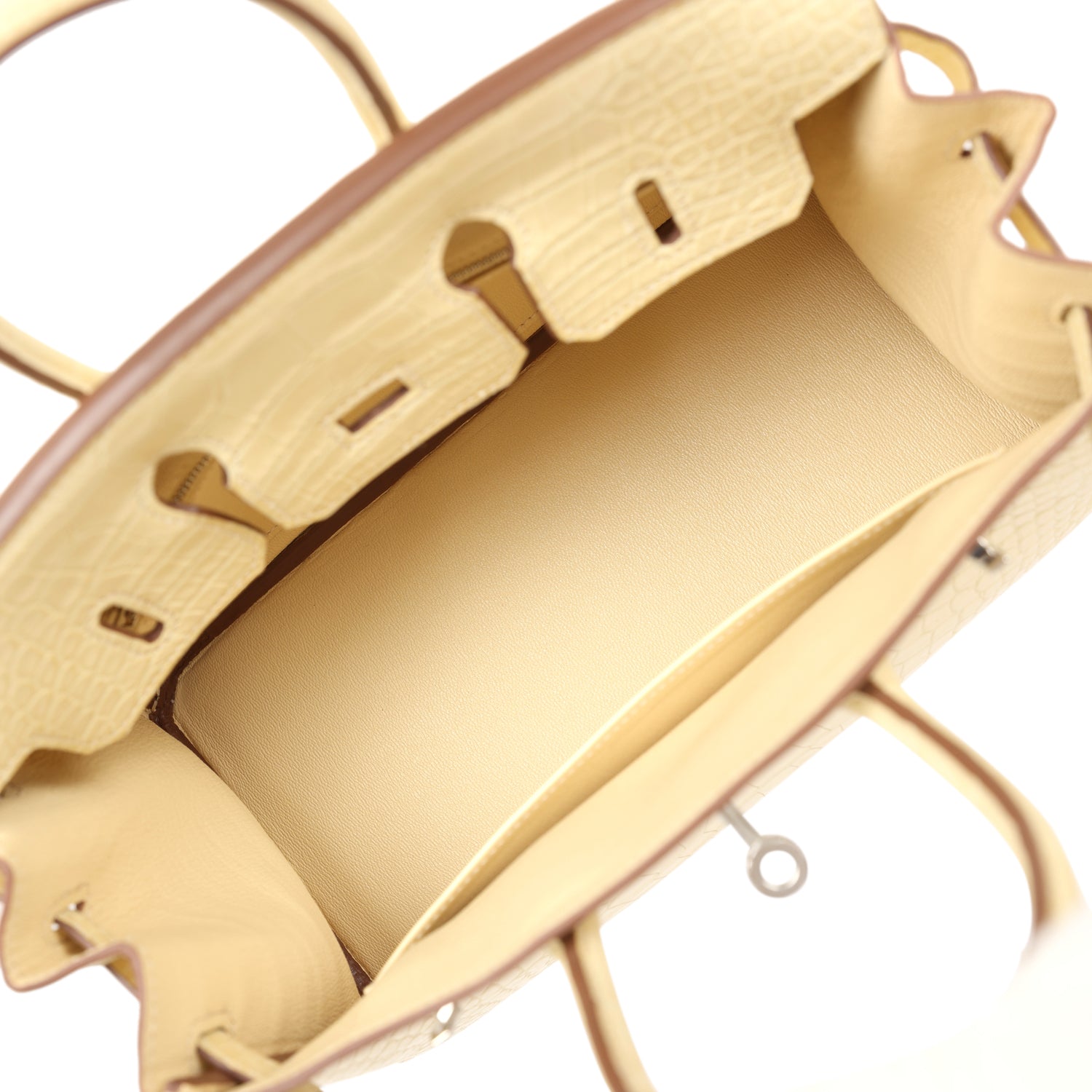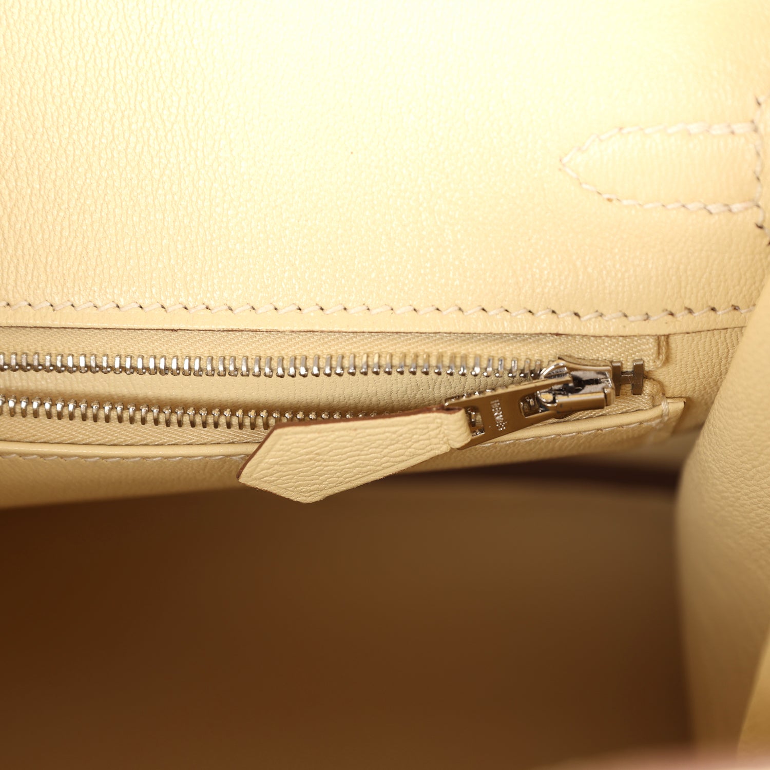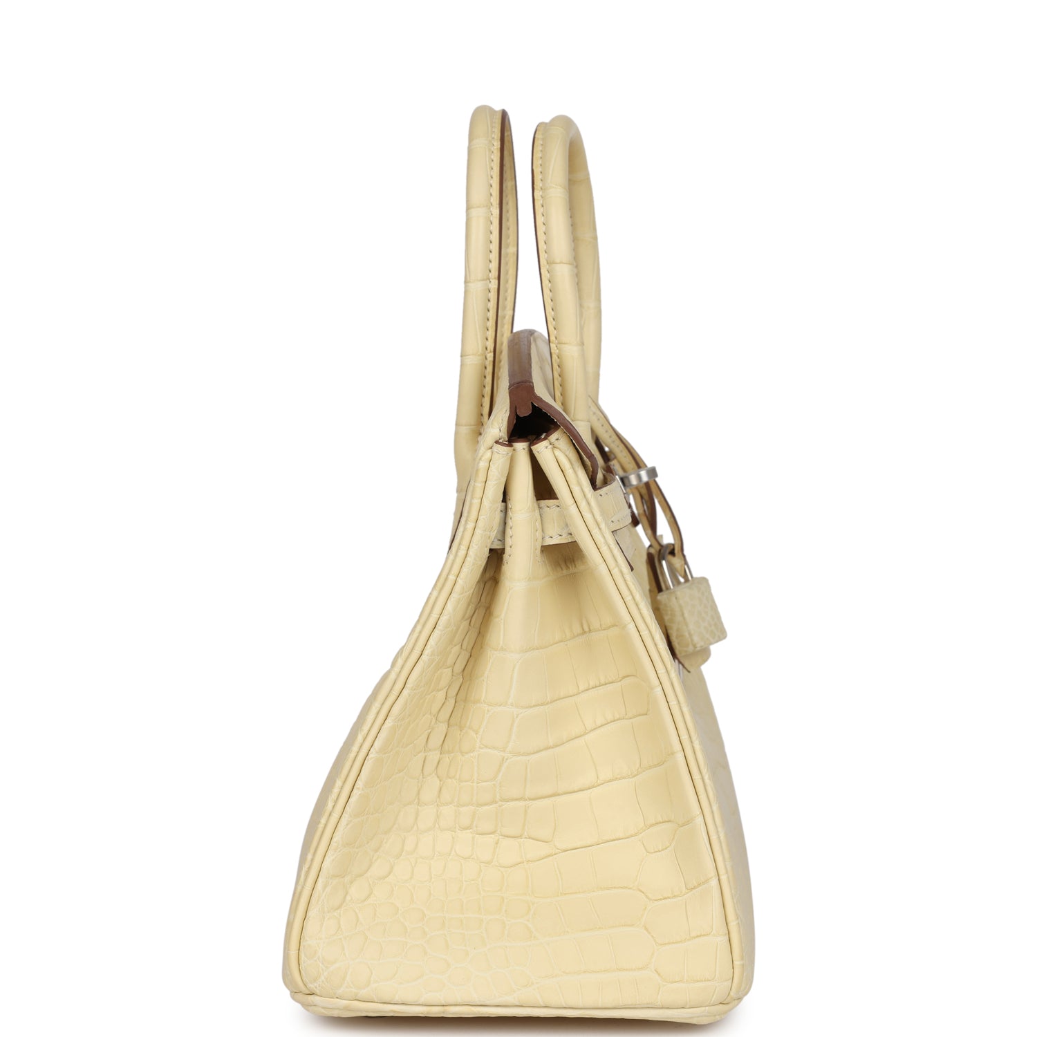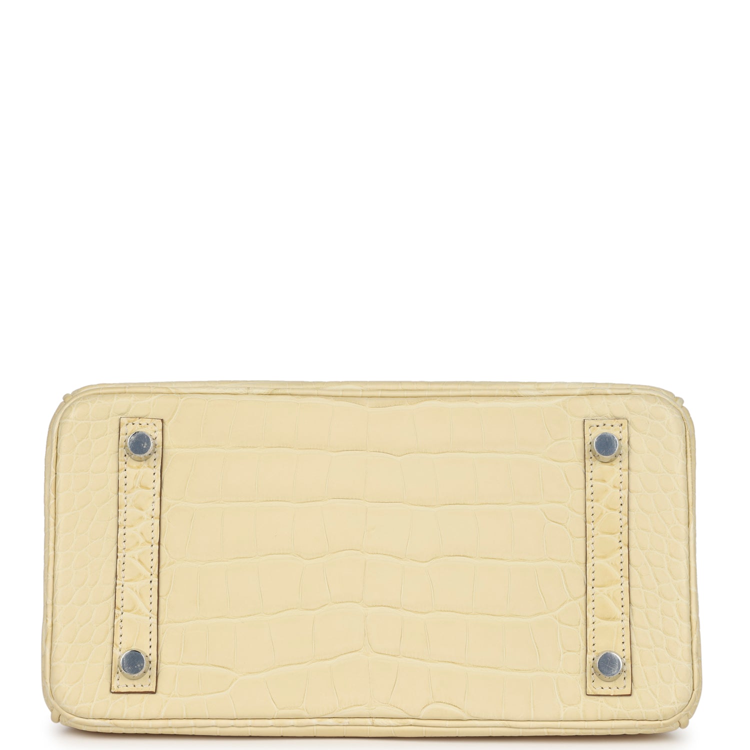 This Birkin, is in Vanille matte Mississippiensis alligator with palladium hardware and has tonal stitching, front strap, two straps with center toggle closure, clochette with lock and two keys and double rolled handles.