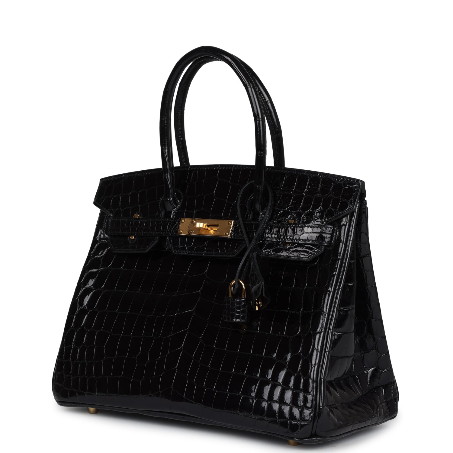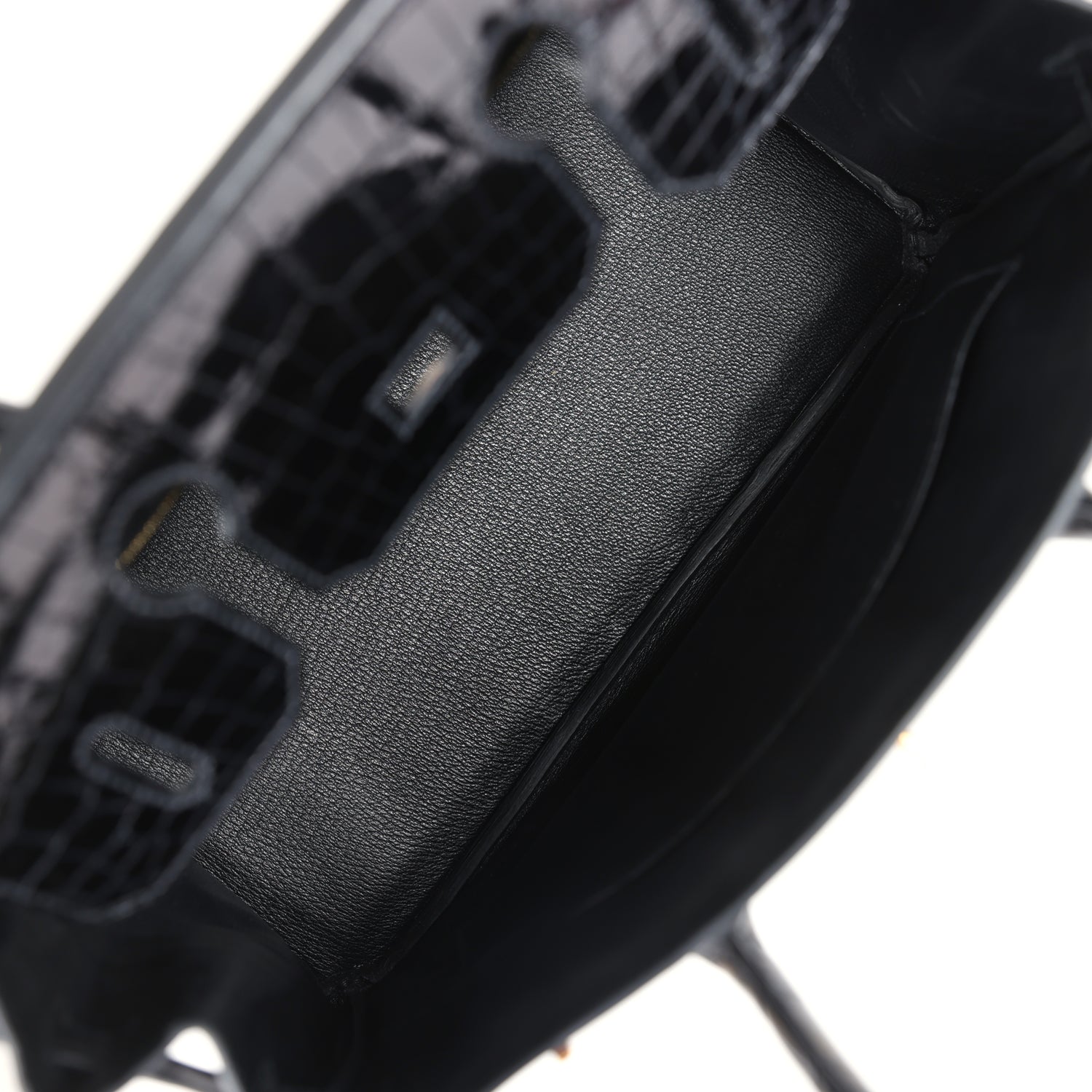 This Birkin is in Black Shiny Niloticus Crocodile leather with gold hardware, tonal stitching, front flap with two straps, front toggle closure, clochette with lock and two keys, double rolled handles.