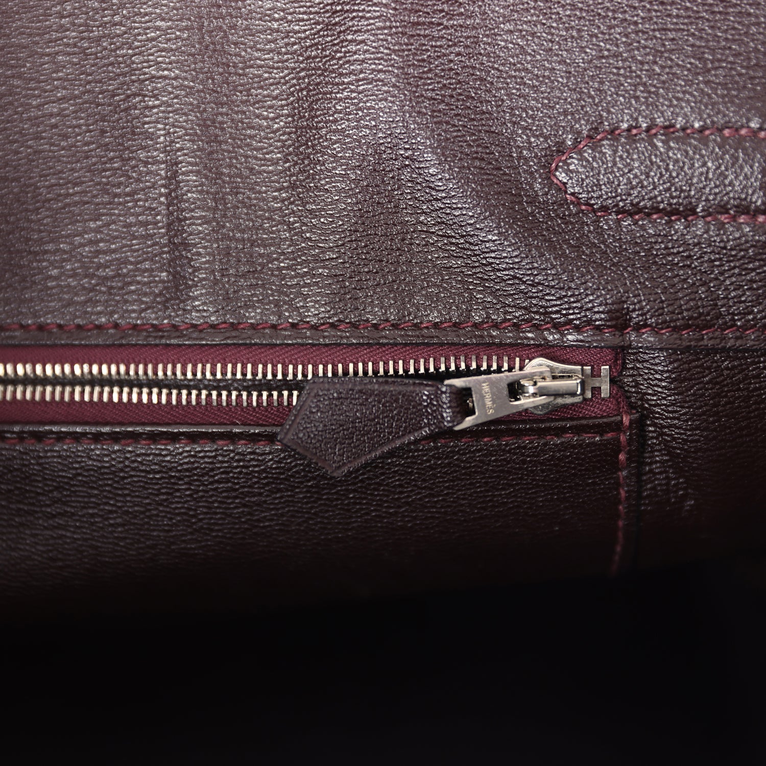 The interior is lined with Bordeaux chevre and has one zip pocket with an Hermes engraved zipper pull and an open pocket on the opposite side.