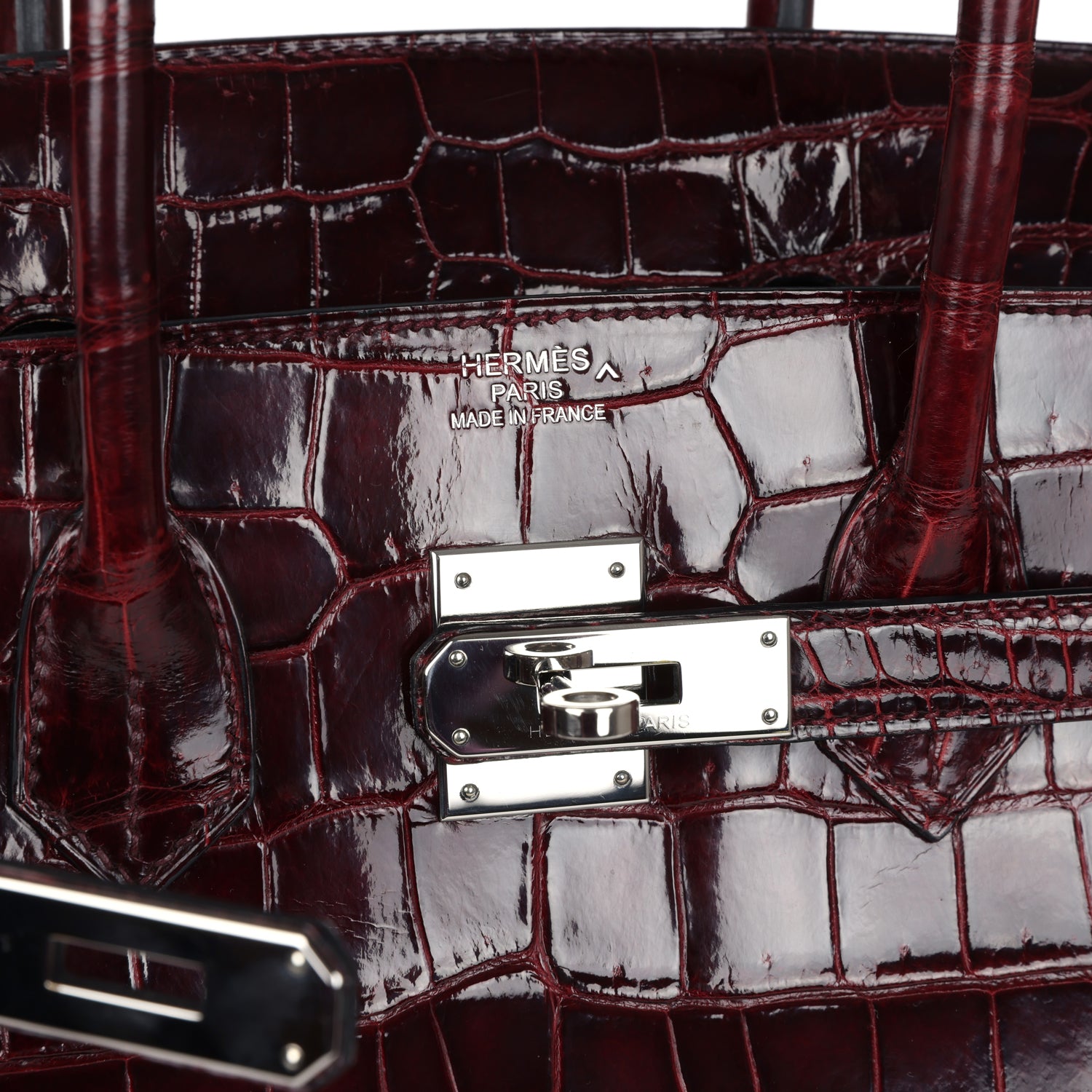 ThisBirkin is of Bordeaux Shiny Porosus Crocodile leather with palladium hardware and features tonal stitching, front flap, two straps with center toggle closure, clochette with lock and two keys, and double rolled handles.