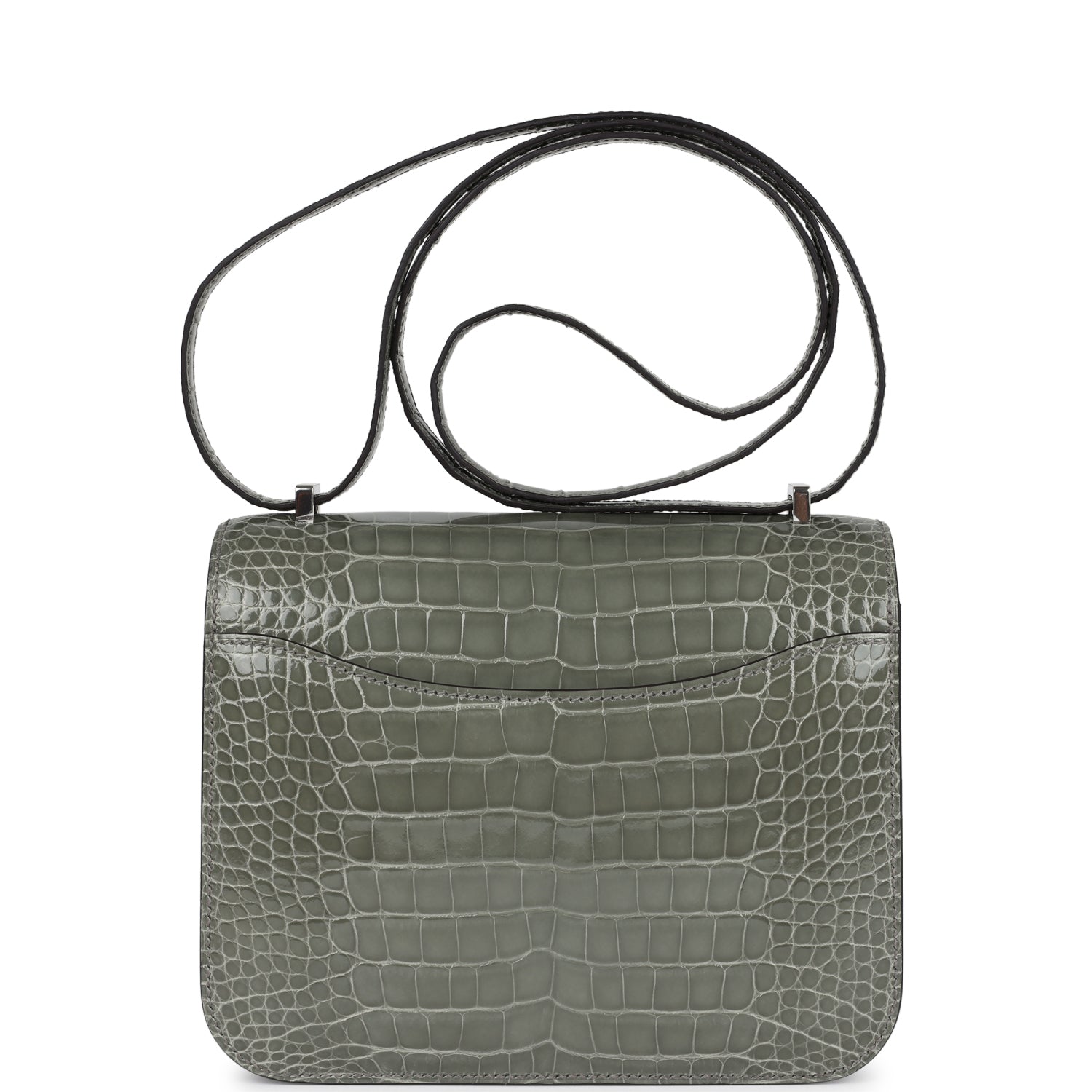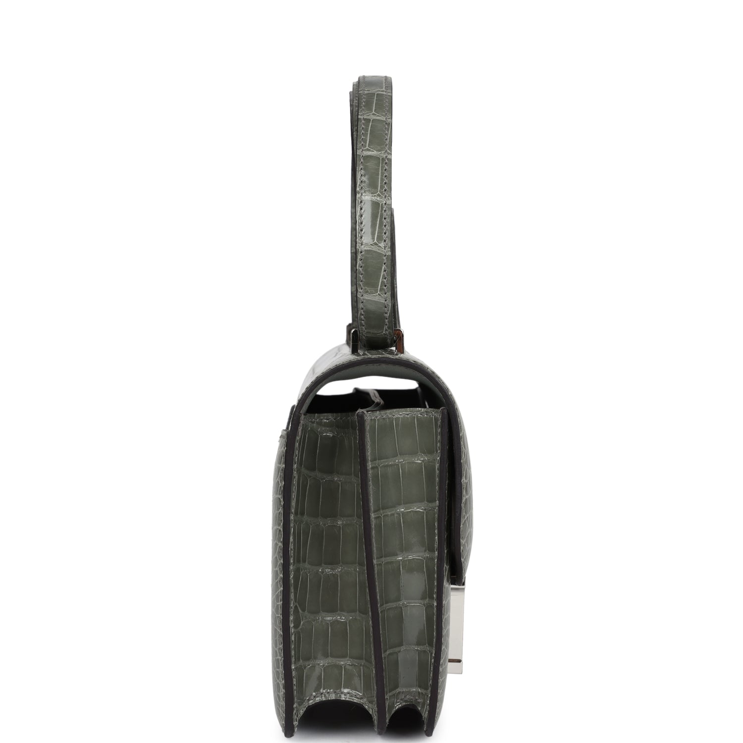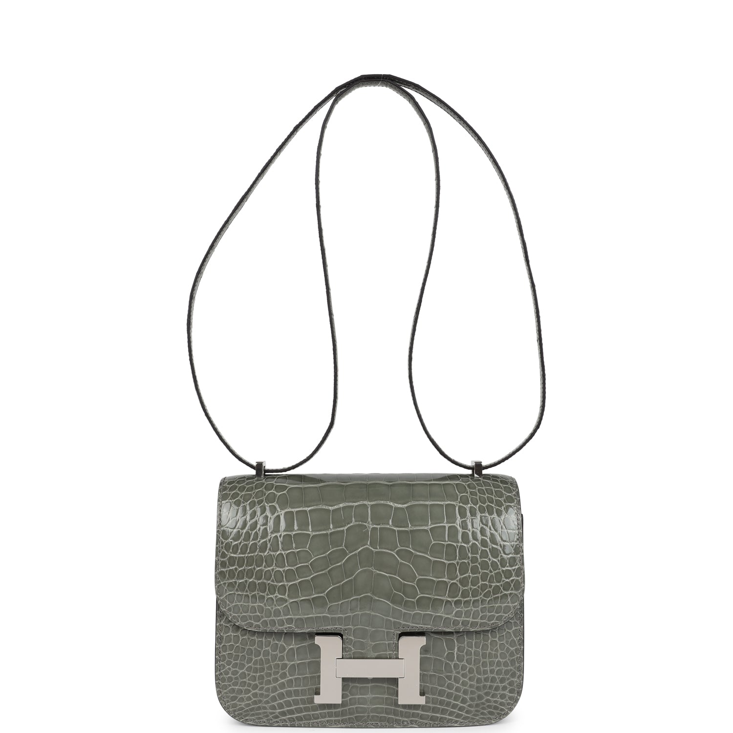 This Constance 1-18 Gris Ciment Shiny Alligator Mississippiensis leather with palladium hardware, tonal stitching, metal "H" snap closure, and an adjustable strap.