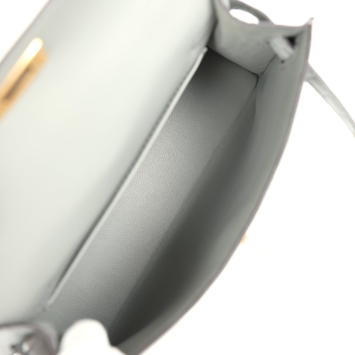 This Kelly, in the Sellier style, is in Gris Ciment Matte Alligator Mississippiensis leather with gold hardware and has tonal stitching, two straps with front toggle closure, single rolled handle and removable shoulder strap.