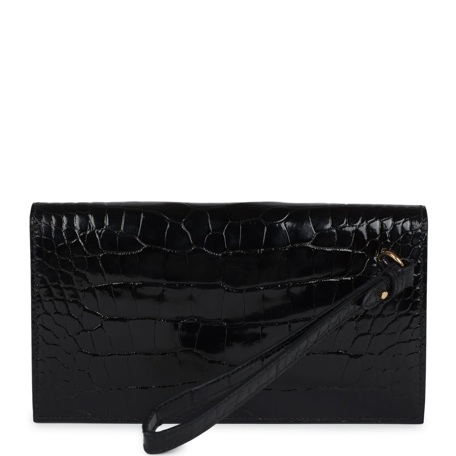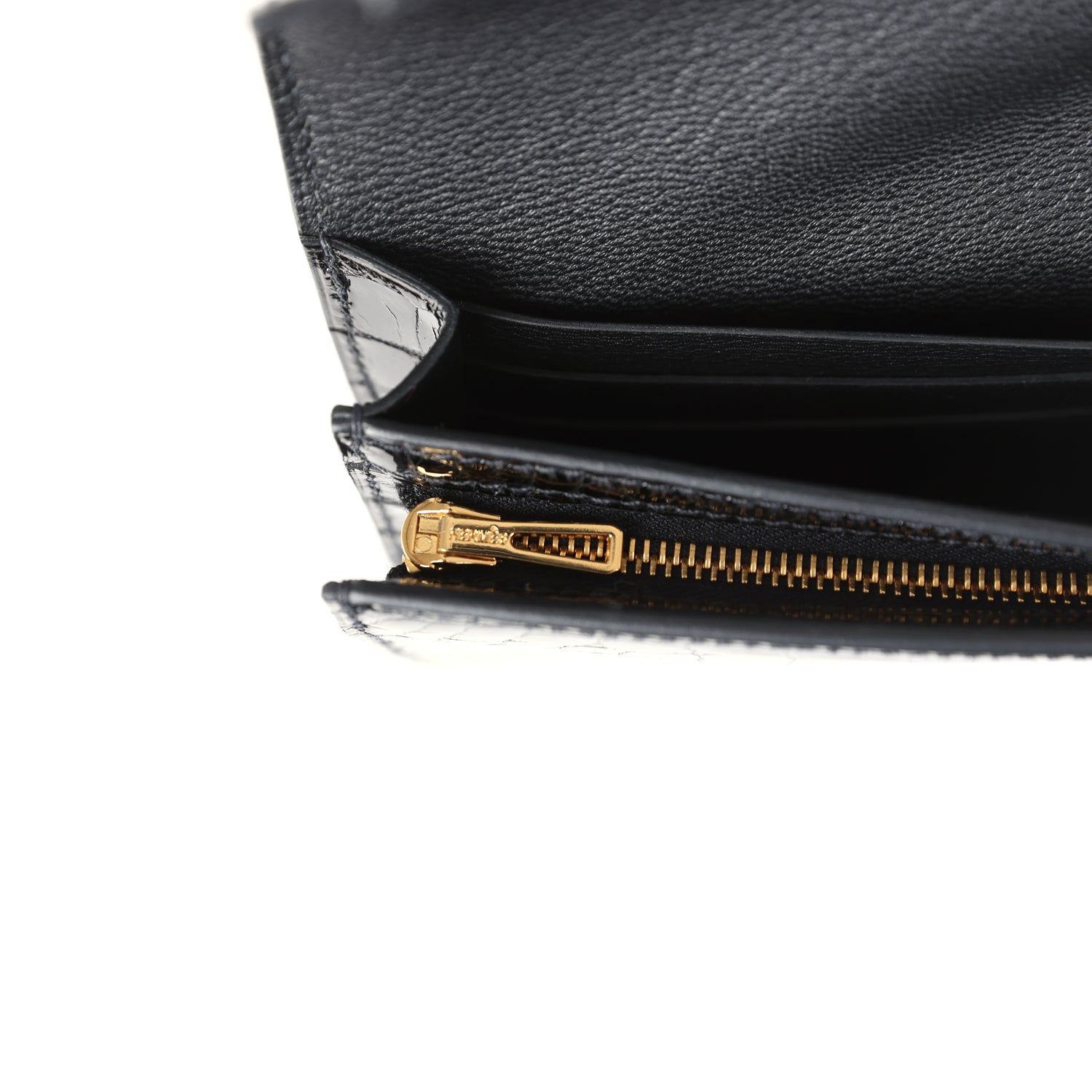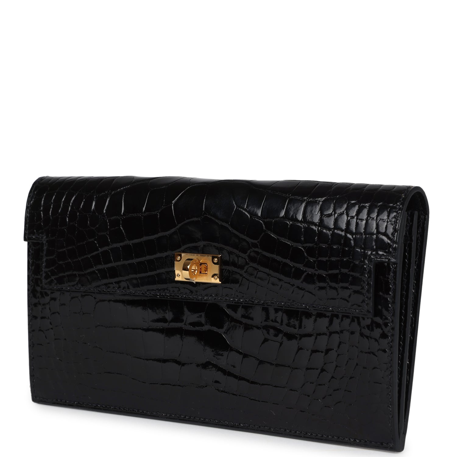 This Kelly Pocket Long Wallet is in Black Shiny Alligator Mississipiensis leather with gold hardware and has tonal stitching, turnlock closure and a detachable wristlet strap.