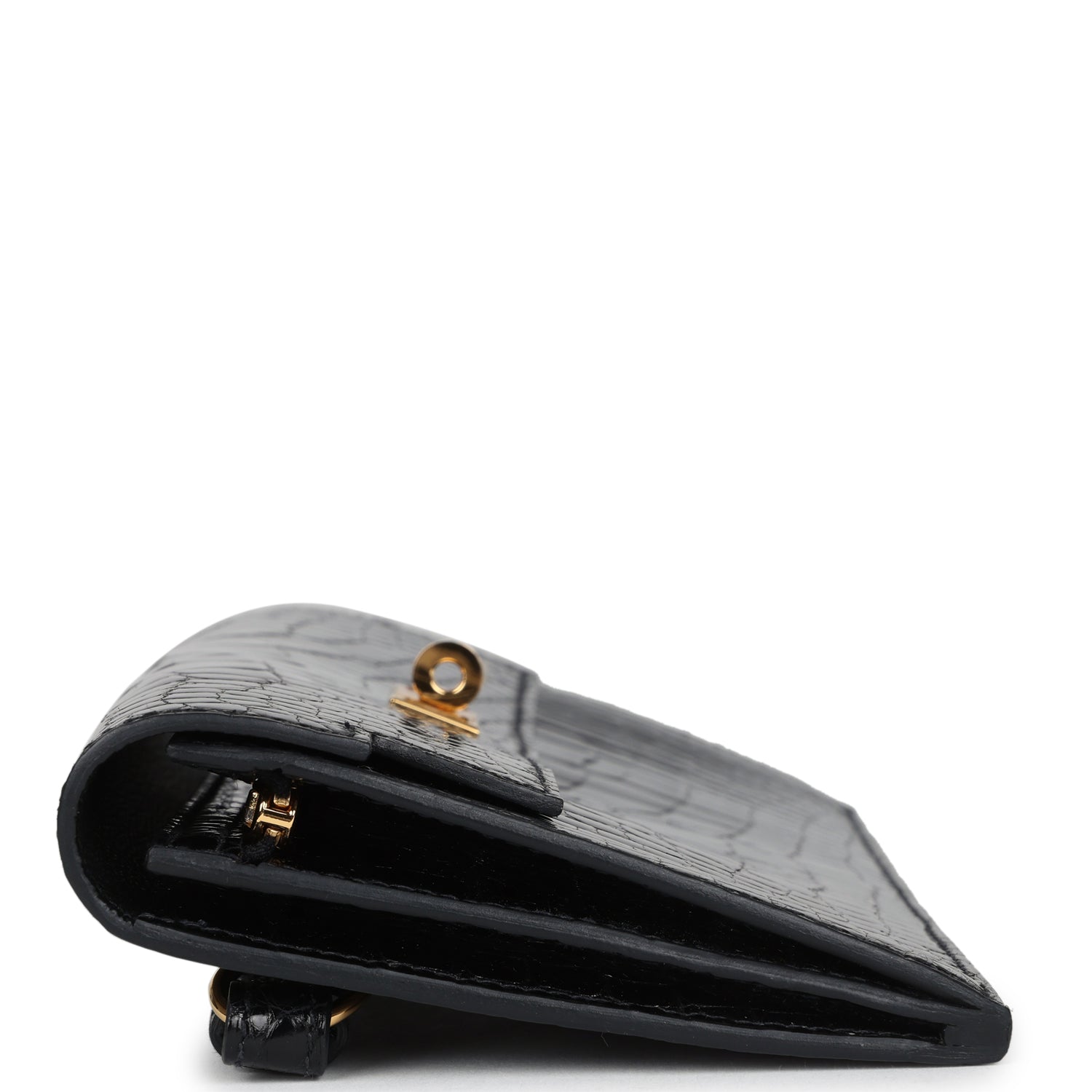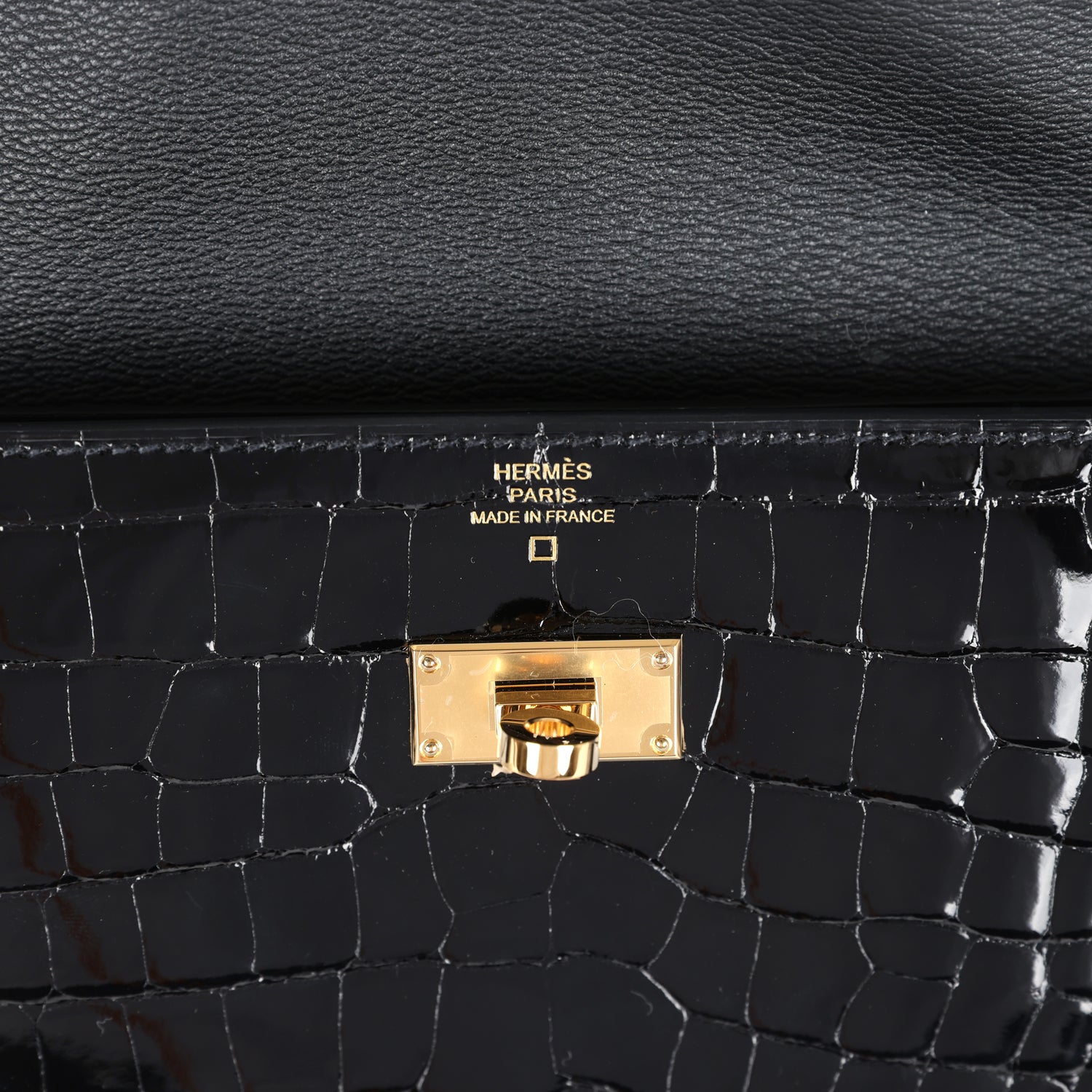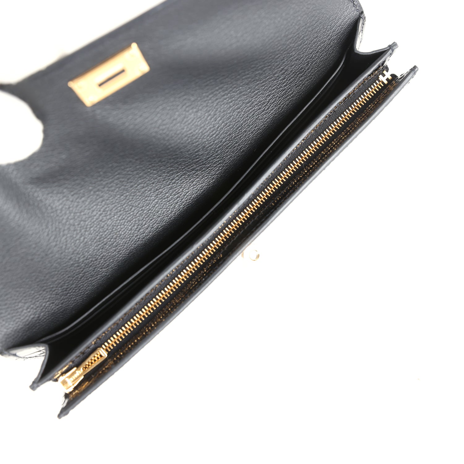 This Kelly Pocket Long Wallet is in Black Shiny Alligator Mississipiensis leather with gold hardware and has tonal stitching, turnlock closure and a detachable wristlet strap.