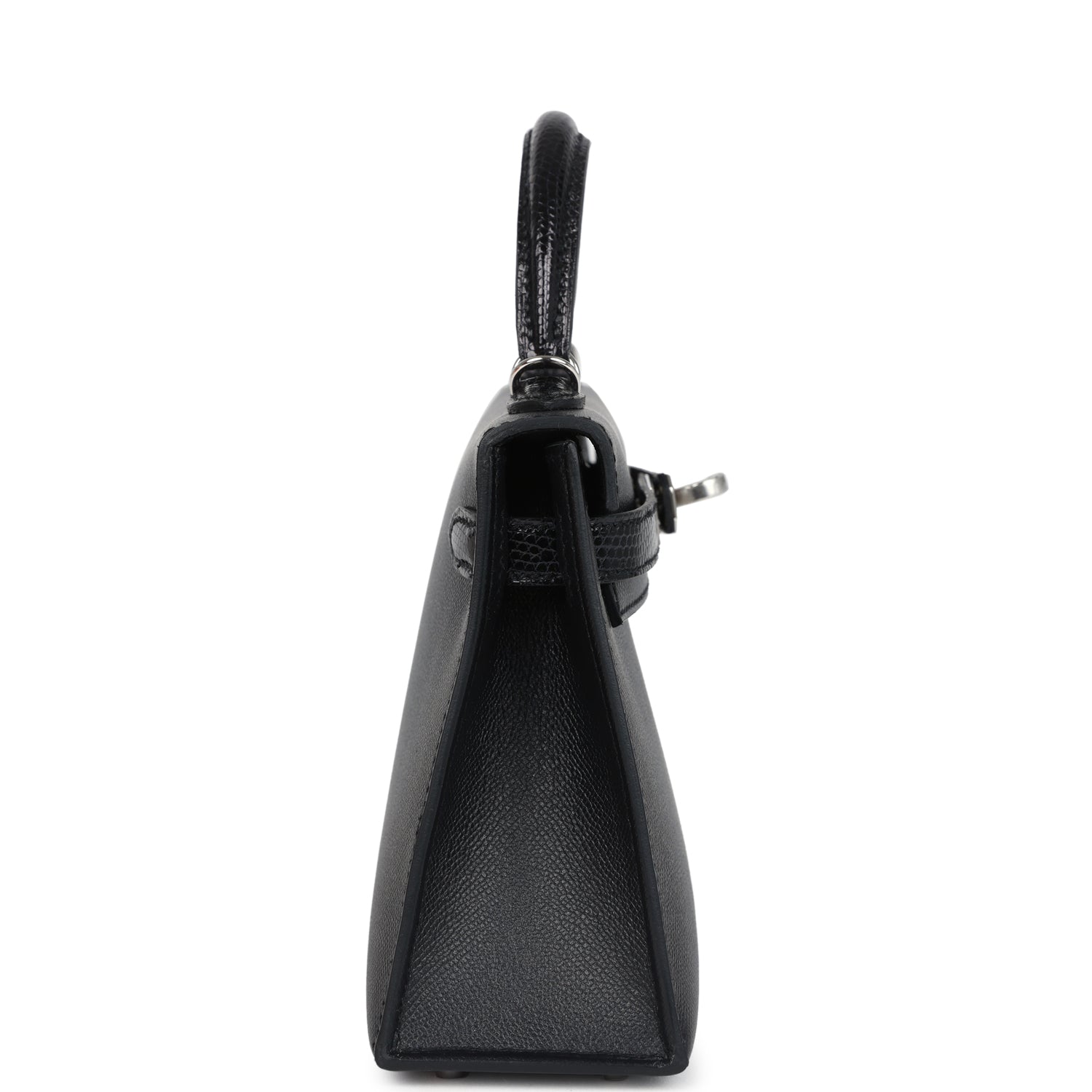 This Kelly Touch, in the Sellier style, is in Black Madame and Shiny Varanus Niloticus Lizard leather with palladium hardware and has tonal stitching, two straps with front toggle closure, single rolled handle and removable shoulder strap.
