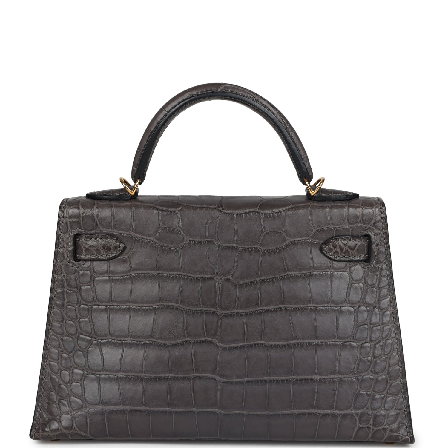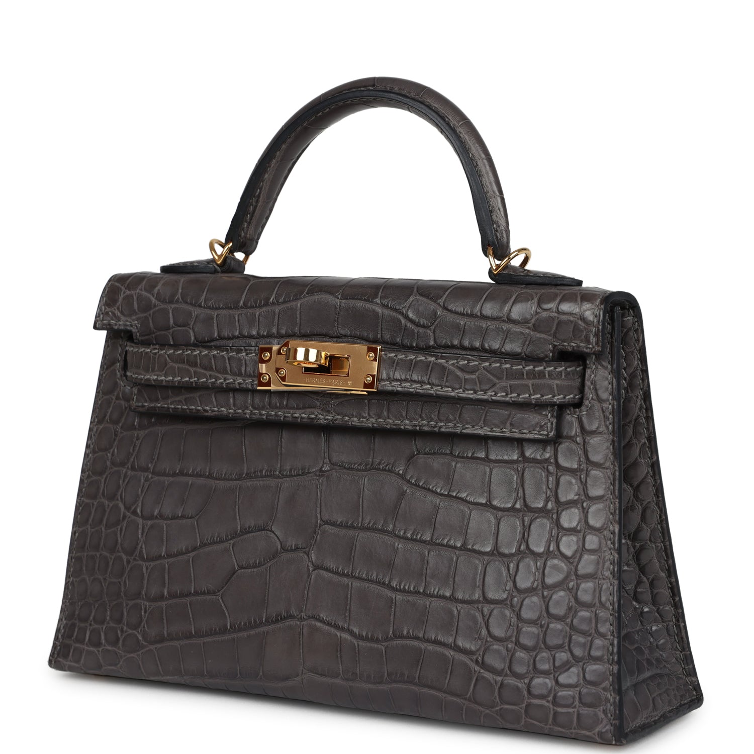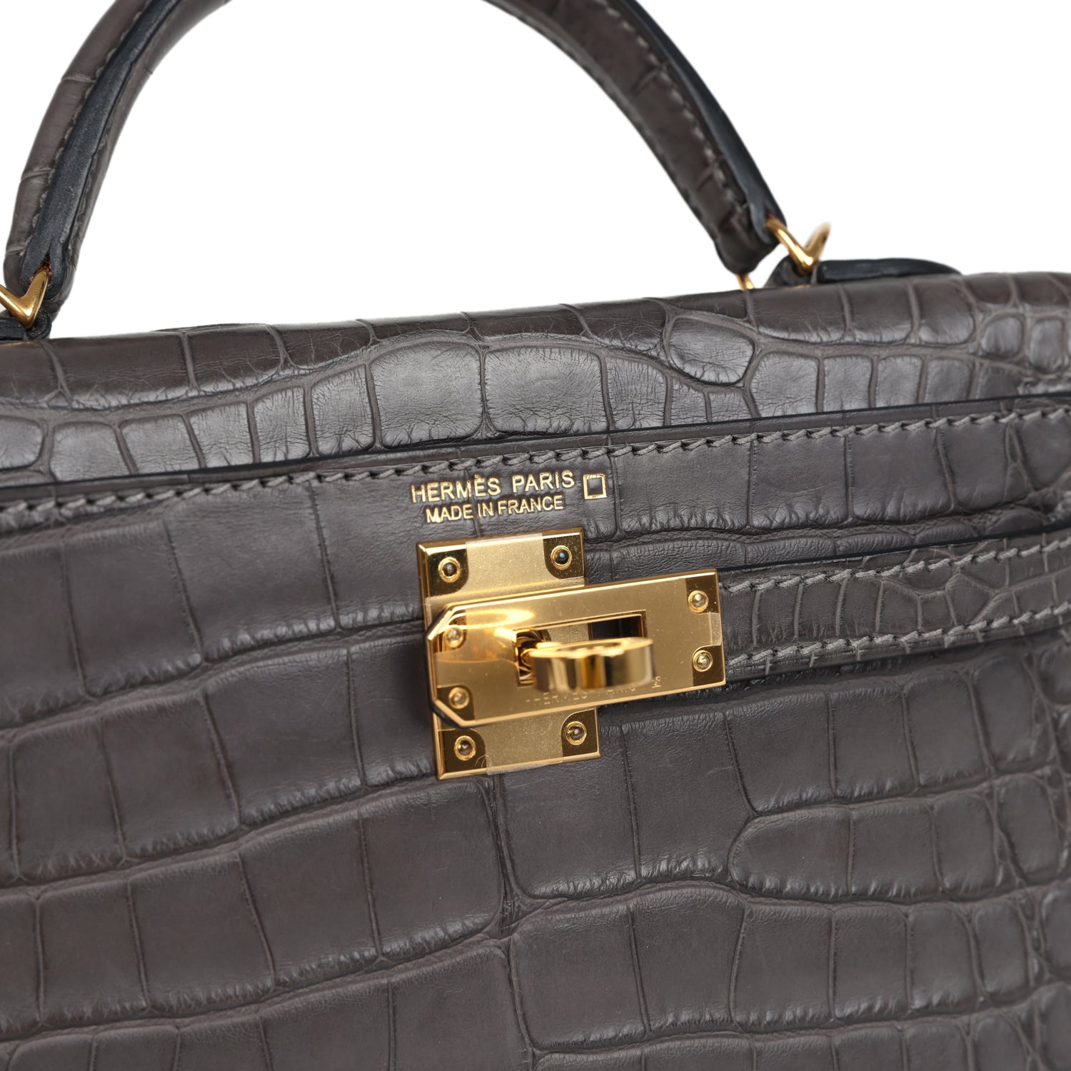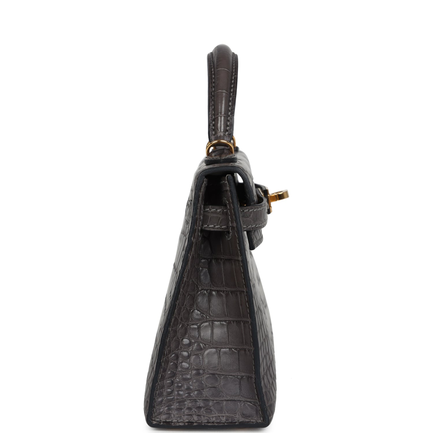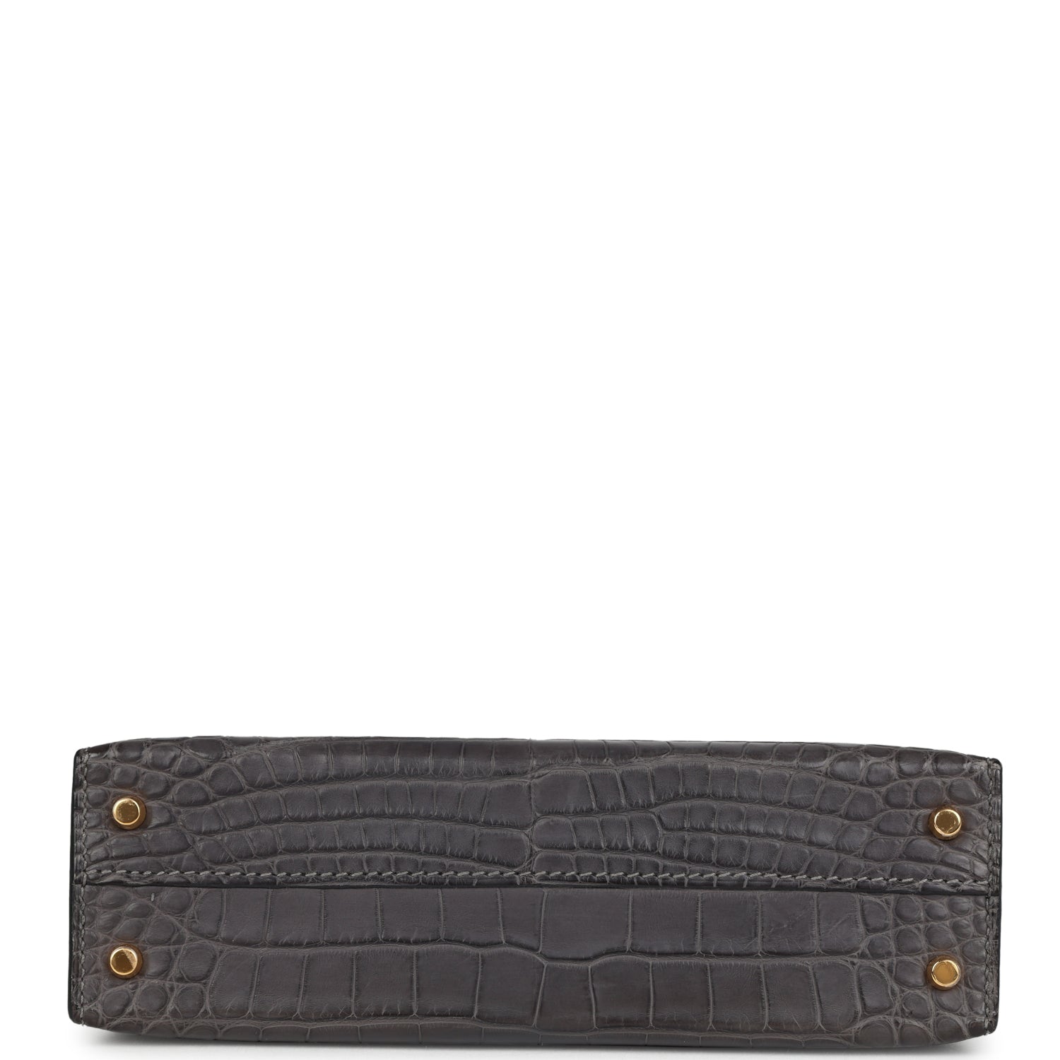This Kelly, in the Sellier style, is in Graphite Matte Alligator Mississipiensis leather with gold hardware, has tonal stitching, two straps with front toggle closure, a single rolled handle, and a removable shoulder strap.