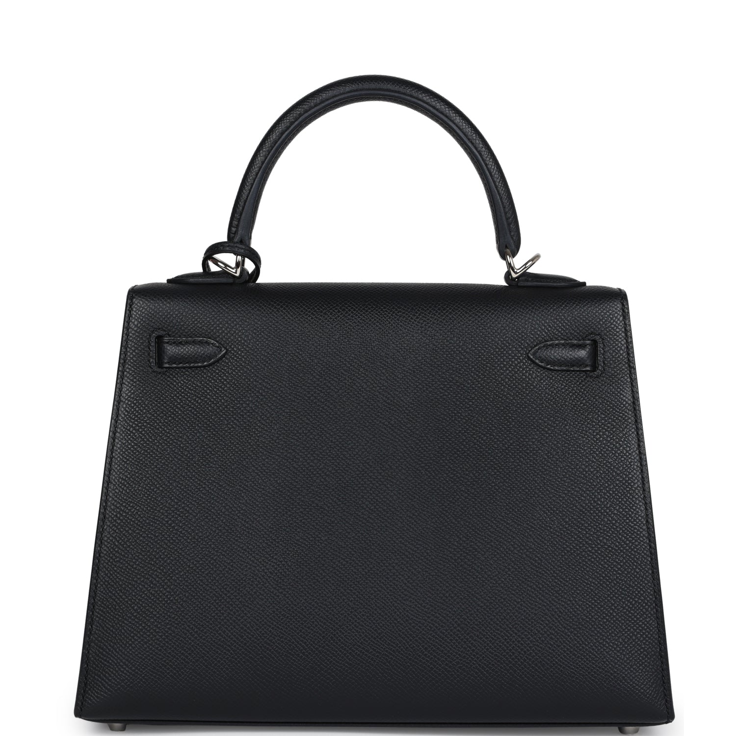This Kelly, in the Sellier style, in Black epsom leather with palladium hardware, has tonal stitching, front flap, two straps with center toggle closure, clochette with lock and two keys, single rolled handle and a removable shoulder strap.