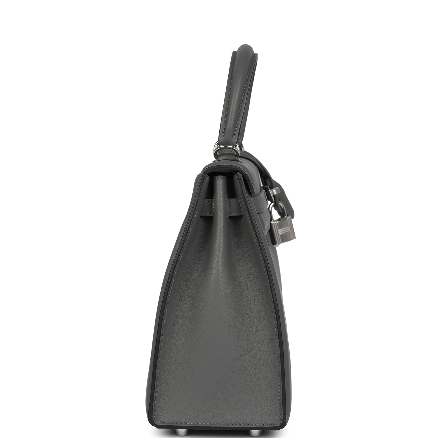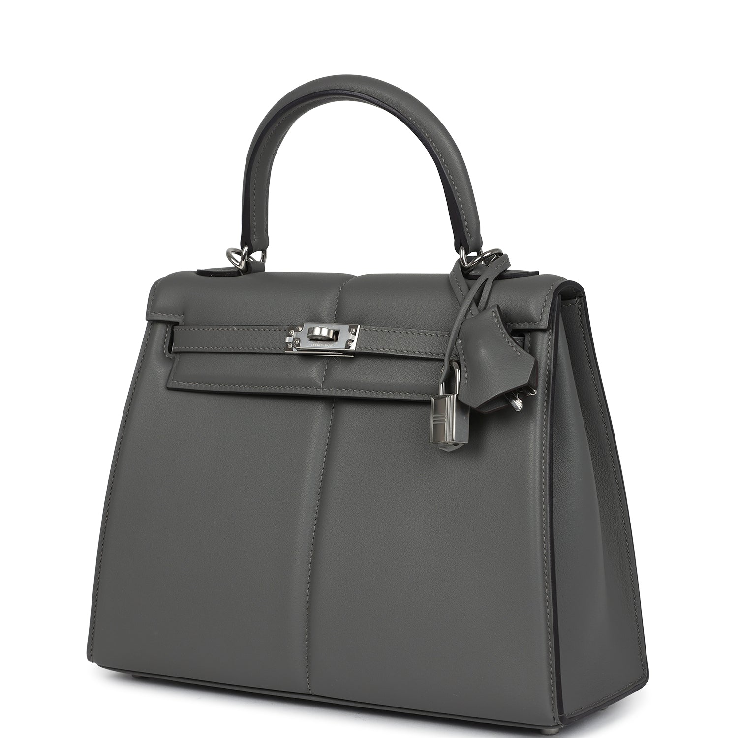 This Padded Kelly, in the Sellier style, is in Gris Meyer swift leather with palladium hardware and has tonal stitching, two padded panels on the front and back of bag, two straps with front toggle closure, clochette with lock and two keys, single rolled handle and removable shoulder strap.