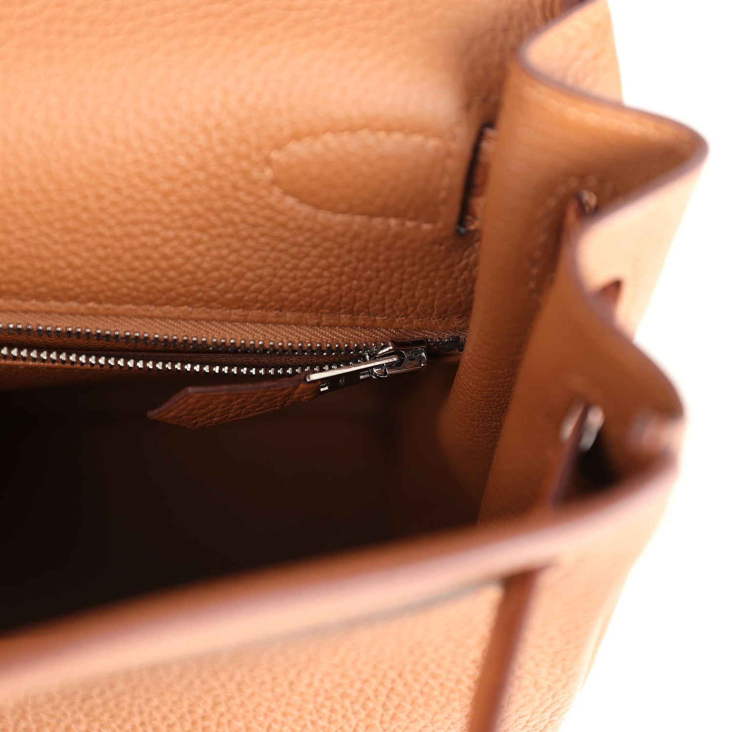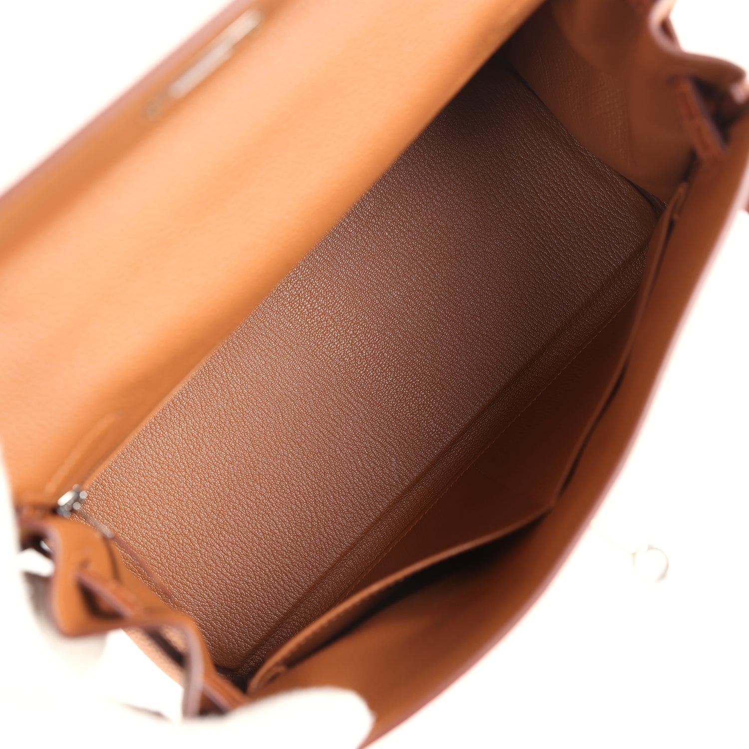 The interior is lined in Gold chevre and has one zip pocket with Hermes engraved pull and two open pockets on the opposite side.
