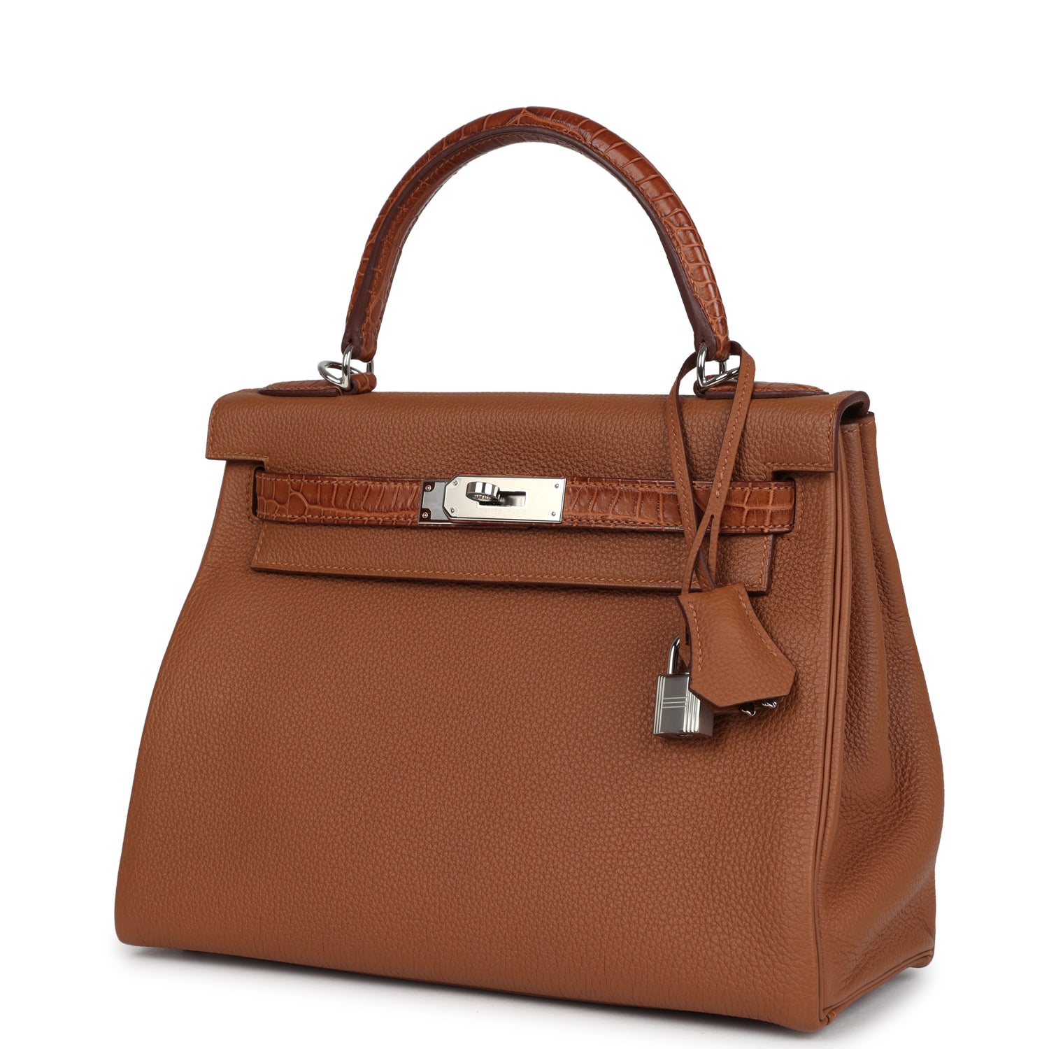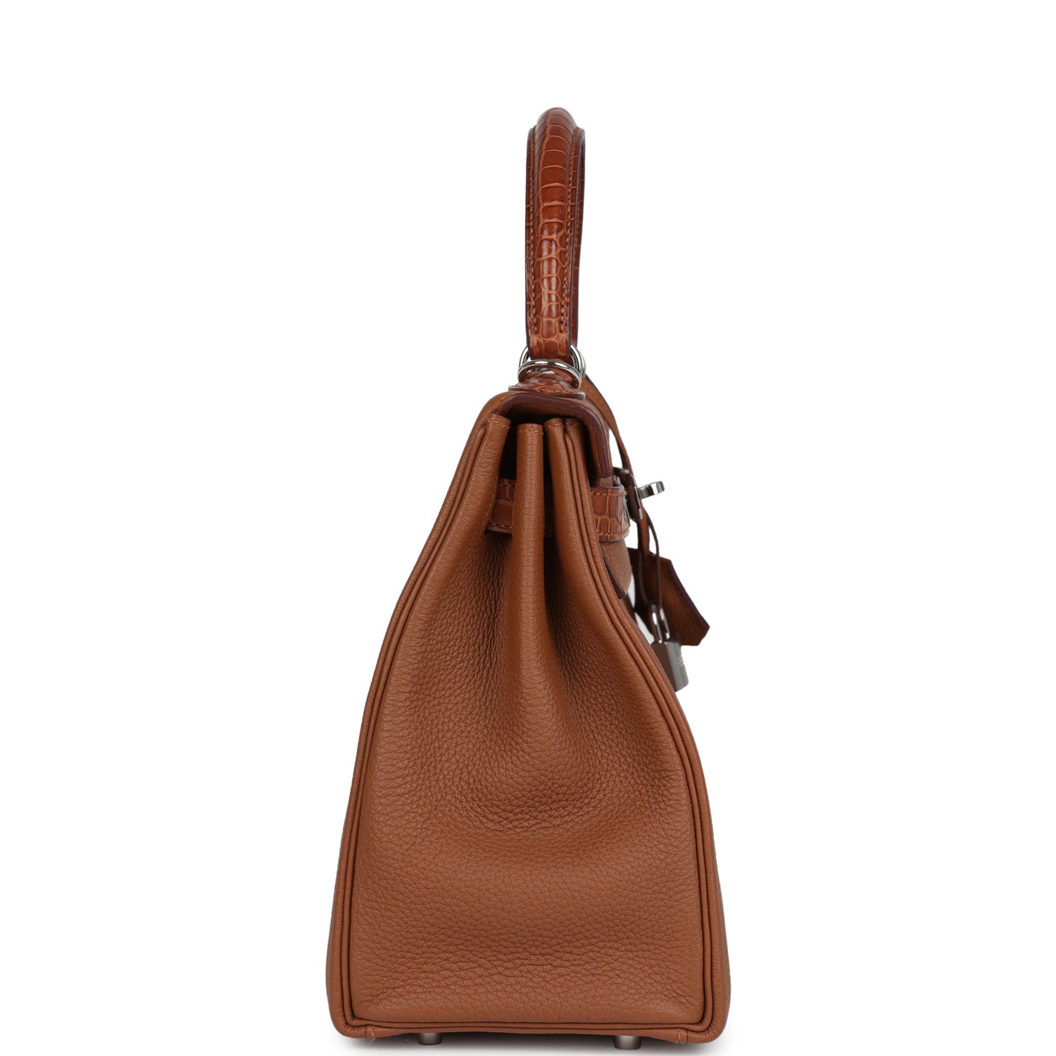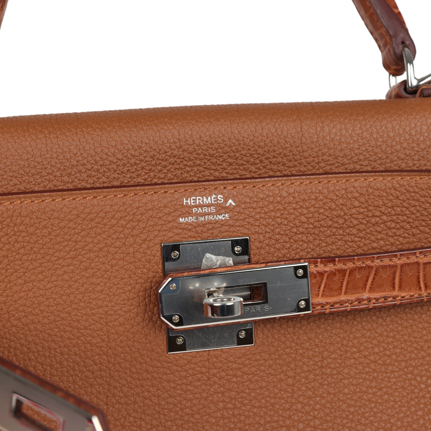 This Kelly Touch, in the Retourne style, is in Gold togo and Matte Porosus Crocodile leather with palladium hardware and has tonal stitching, front flap, two straps with center toggle closure, clochette with lock and two keys, single rolled handle and removable shoulder strap.