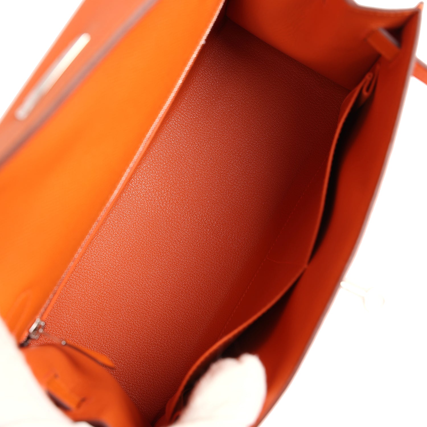 This Kelly, in the Sellier style, is in Orange epsom leather with palladium hardware, has tonal stitching, front flap, two straps with center toggle closure, clochette with lock and two keys, single rolled handle and removable shoulder strap.
