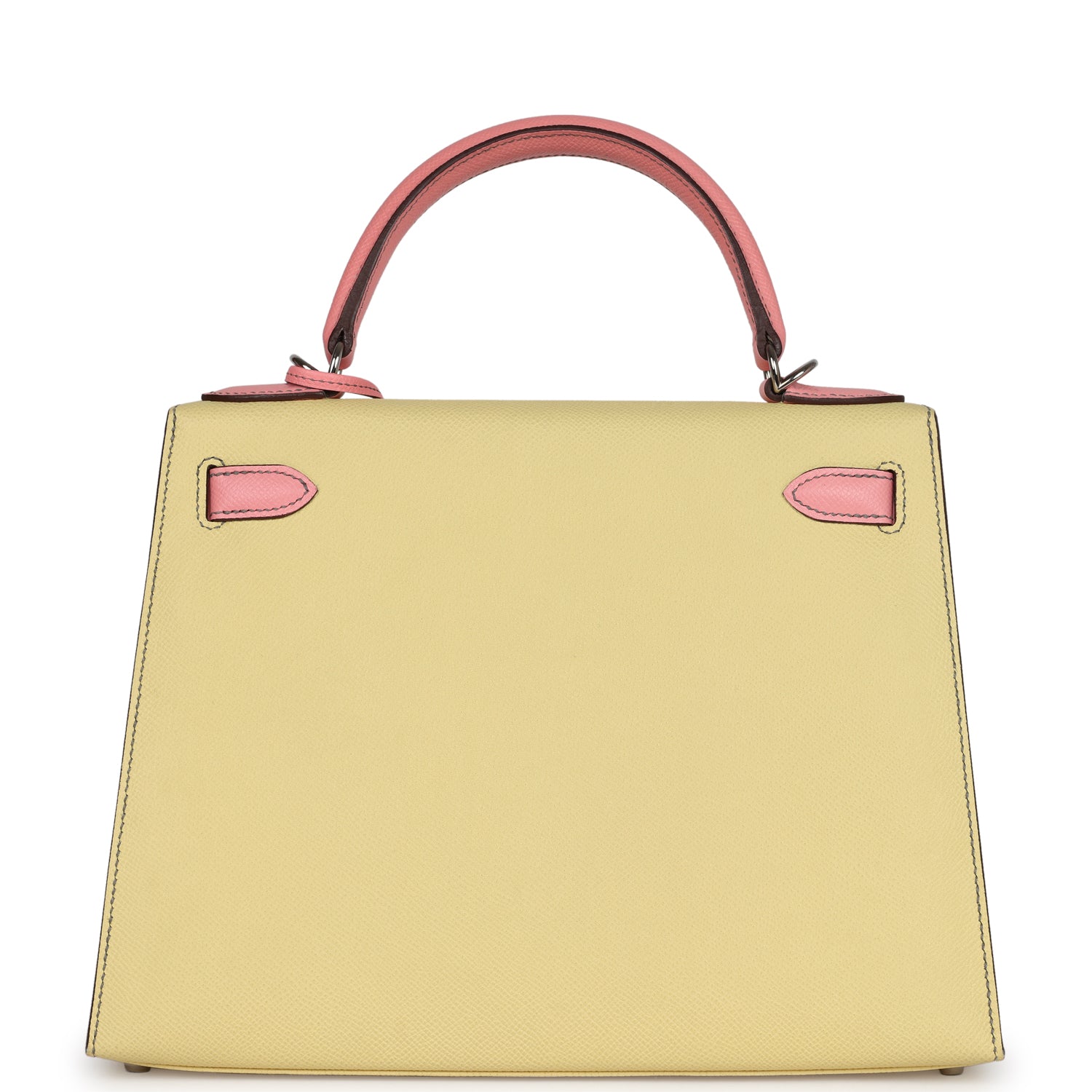 ThisSpecial Order Kelly, in the Sellier style, is in Rose Confetti and Jaune Poussin Epsom leather with palladium hardware featuring contrast stitching, front flap with two straps, front toggle closure, clochette with lock and two keys, single rolled handle, and a removable shoulder strap.