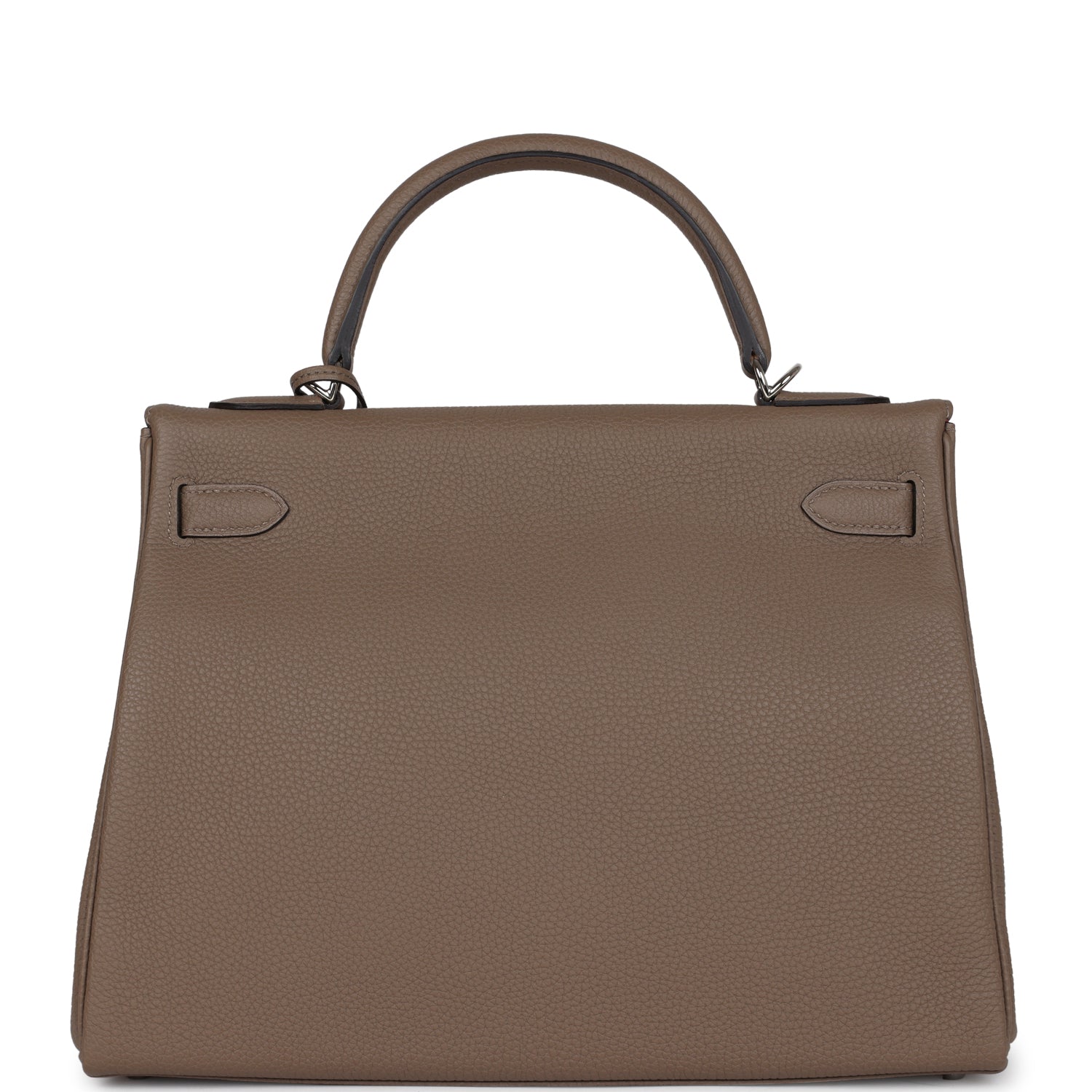 This Special Order Kelly, in the Retourne style, is in Etoupe togo leather with palladium hardware and features tonal stitching, front flap, two straps with center toggle closure, clochette with lock and two keys, single rolled handle and optional shoulder strap.