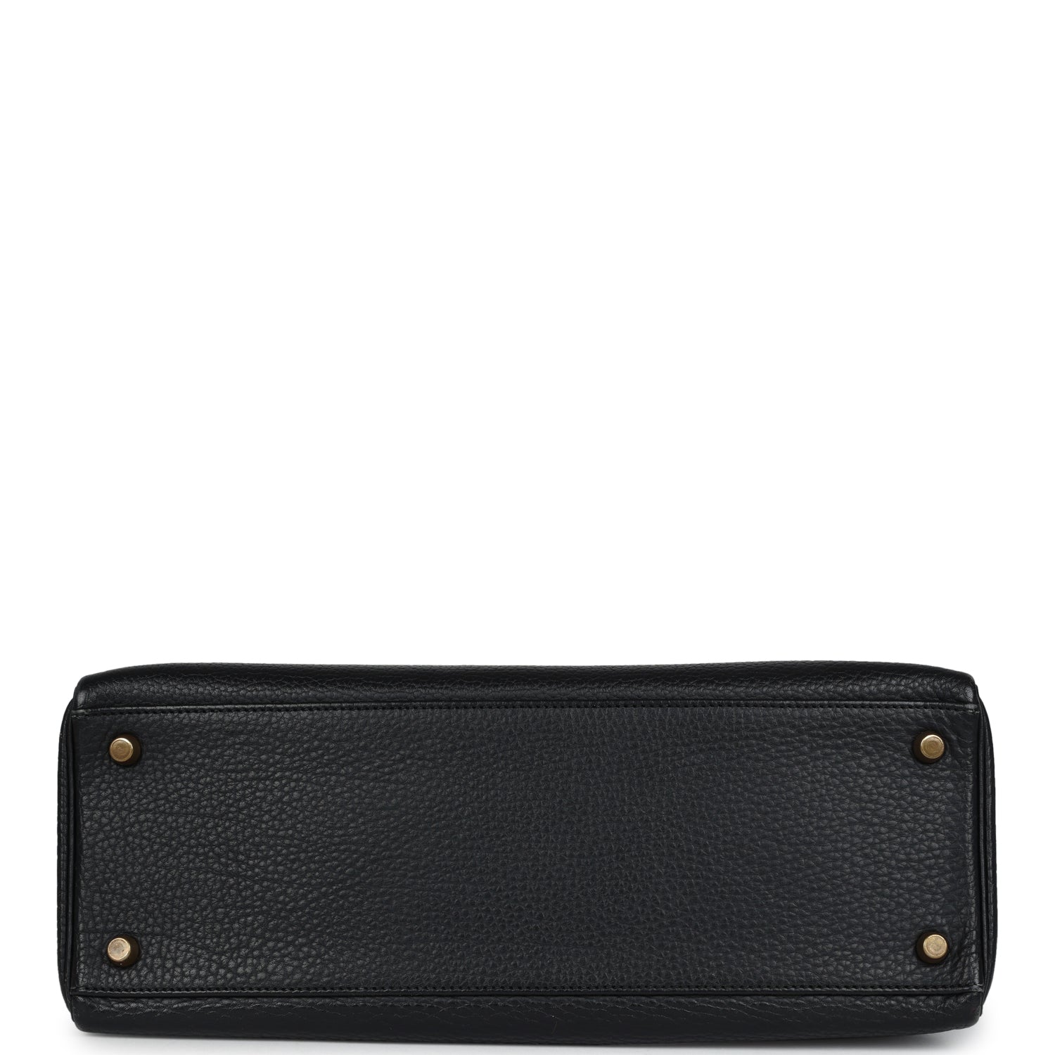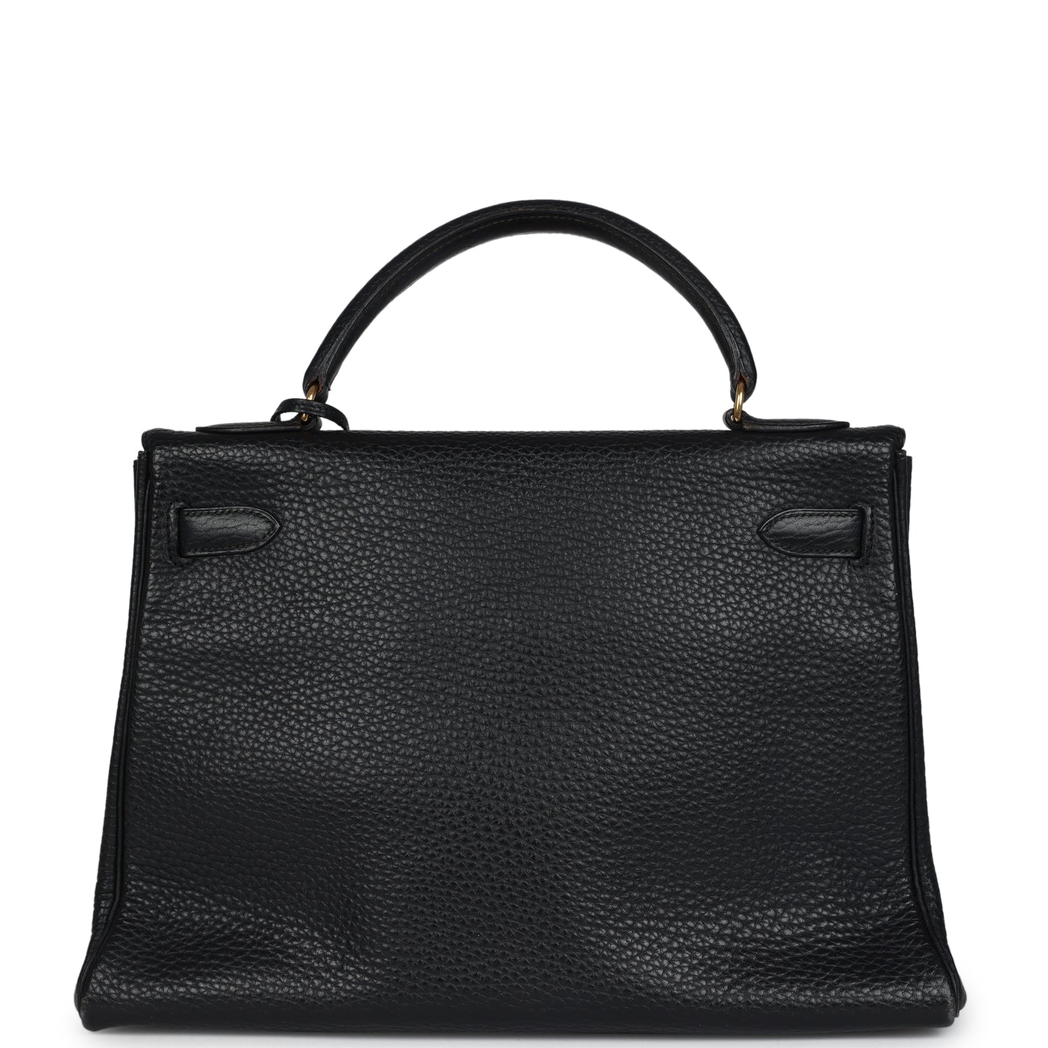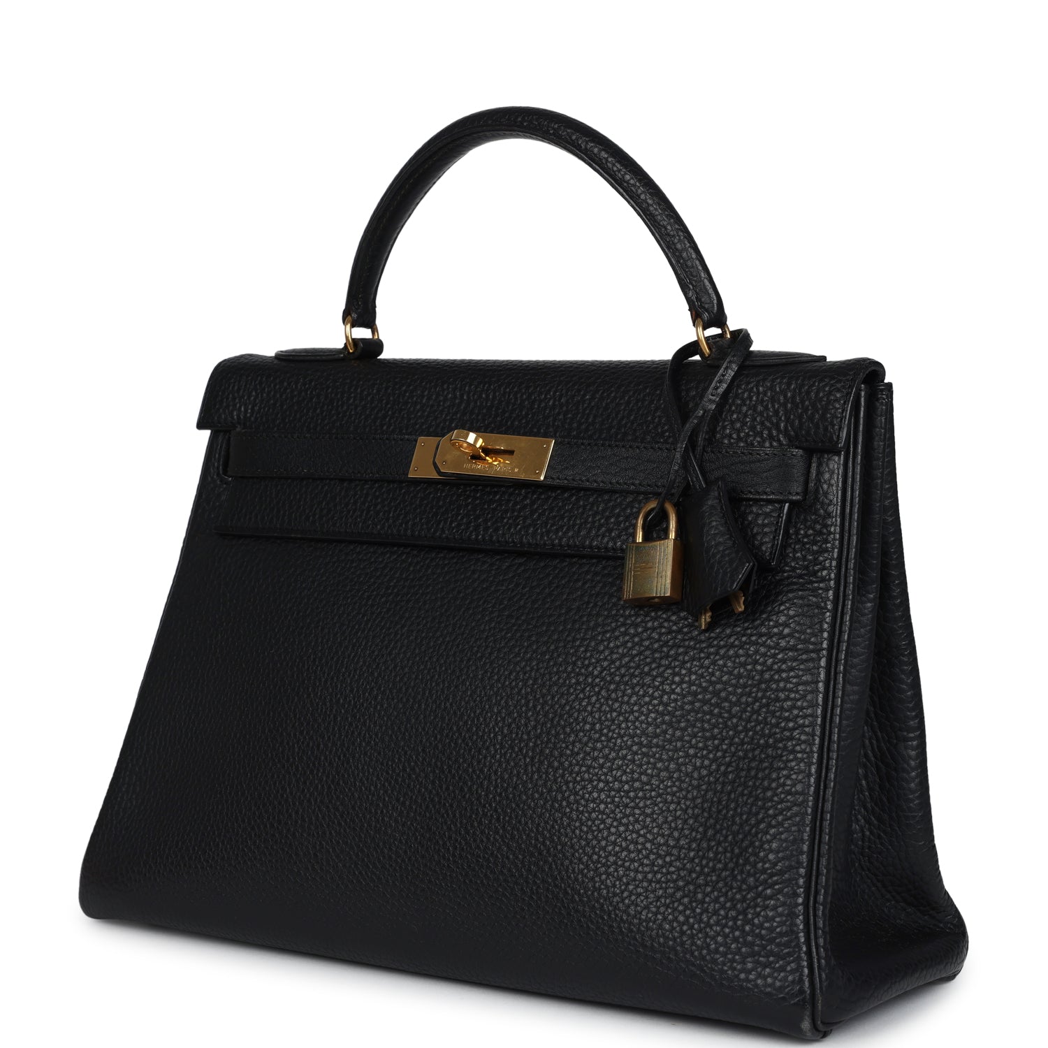 This vintage Kelly, in the Retourne style, is of Black Ardennes leather with gold hardware and has tonal stitching, a front toggle closure, a clochette with lock and two keys and a single rolled handle and a removable shoulder strap.