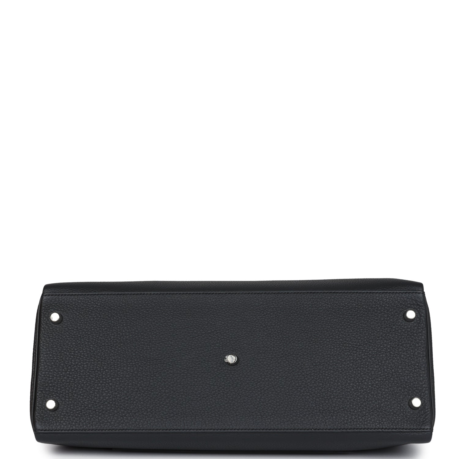 This Hermes Kelly 42 Maxi, in the Retourne style, is of Plomb togo leather with Palladium hardware and features tonal stitching, front flap with two straps, front toggle closure, clochette with lock and two keys, a single rolled handle and a detachable Plomb canvas shoulder strap.