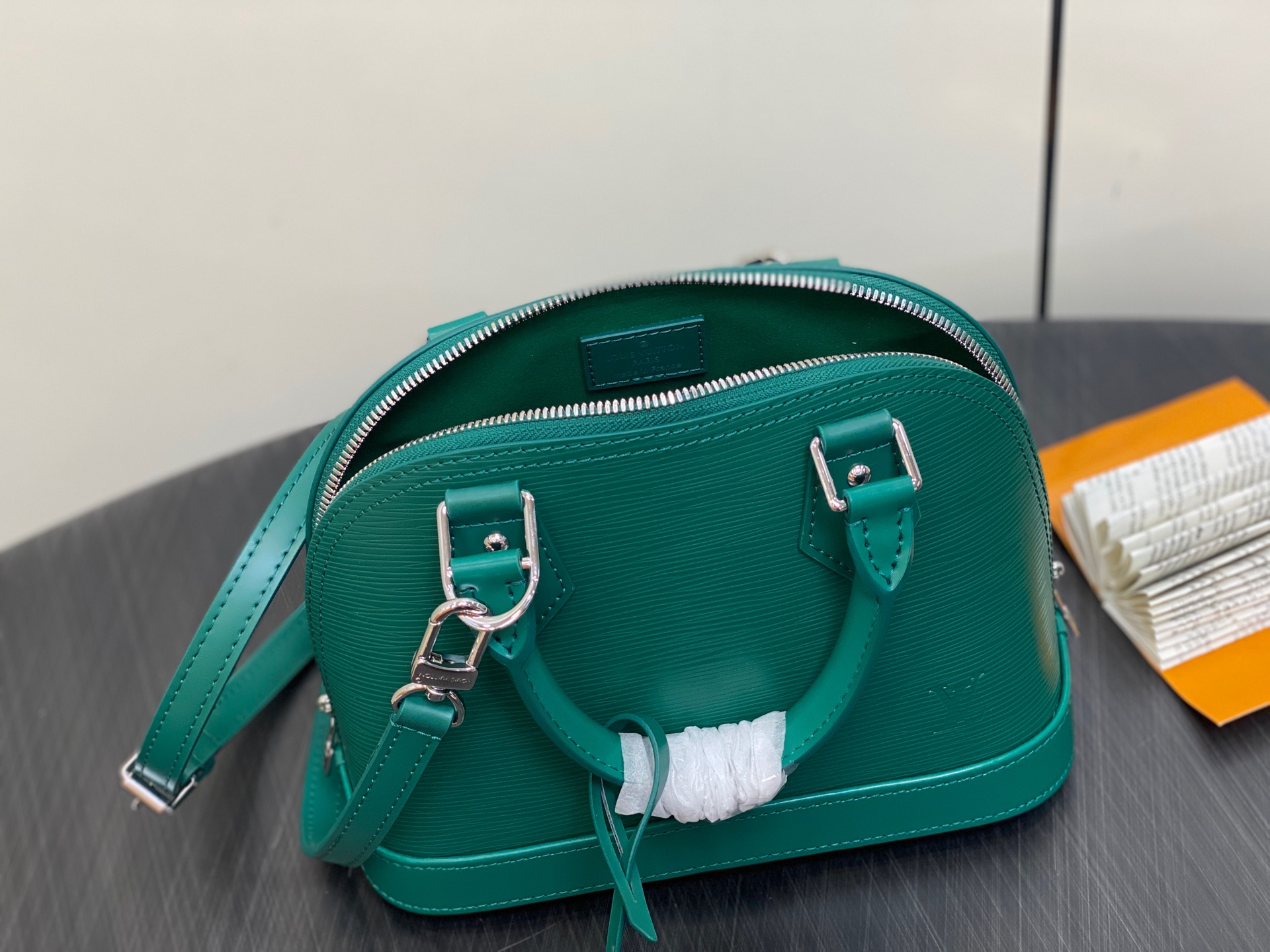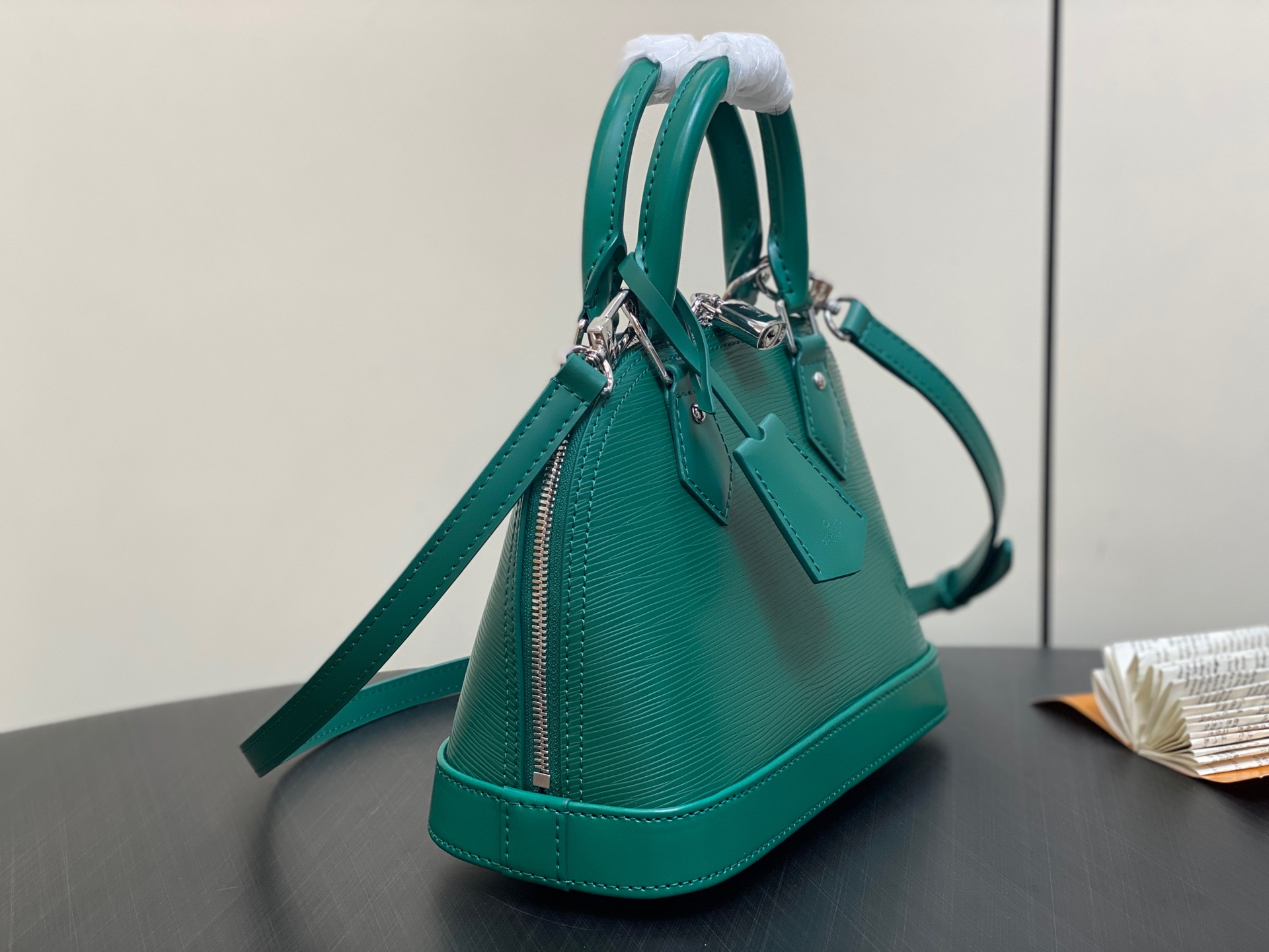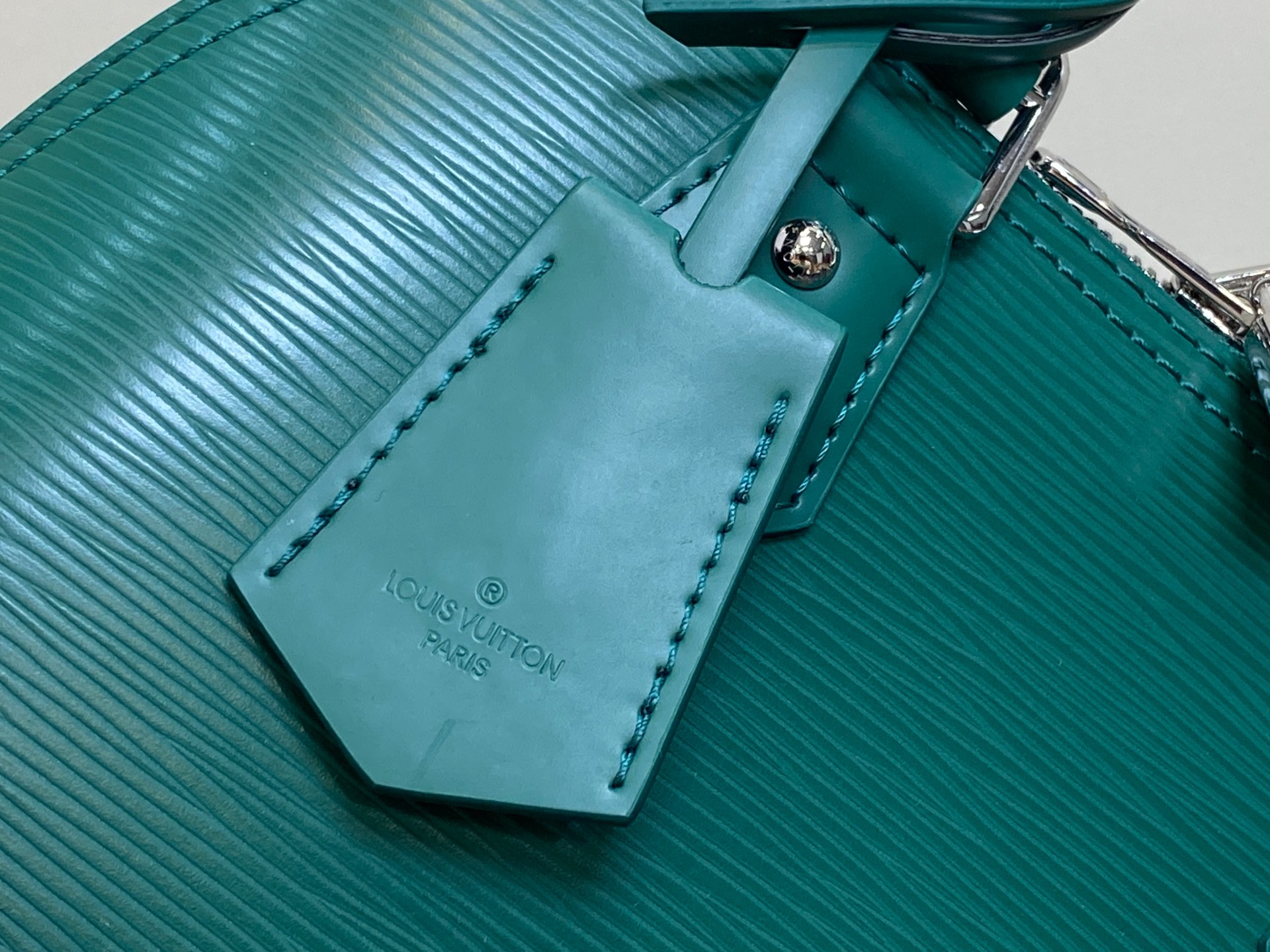 Drawing on the original design from 1934, this striking version of the Alma BB belongs to the Heritage Colors collection. The grained Epi leather makes a bold contrast against the smooth cowhide trim, which are both offset with sleek silver-toned hardware, including a signature padlock. Wear it cross-body using the removable strap or carry it by hand.