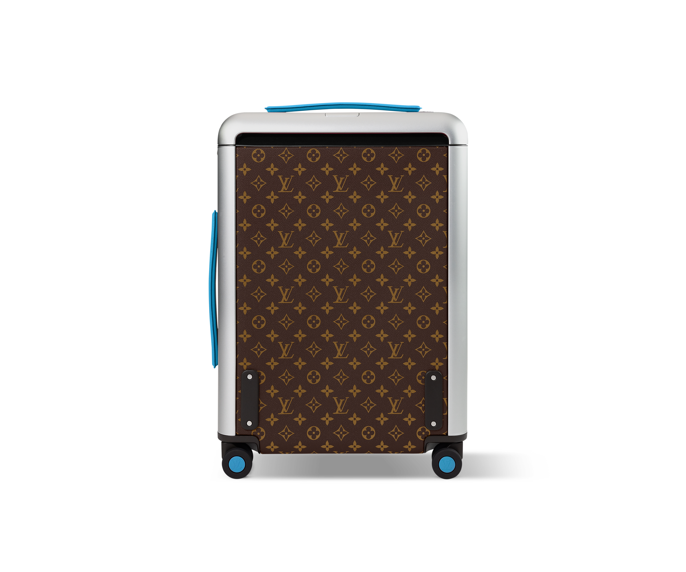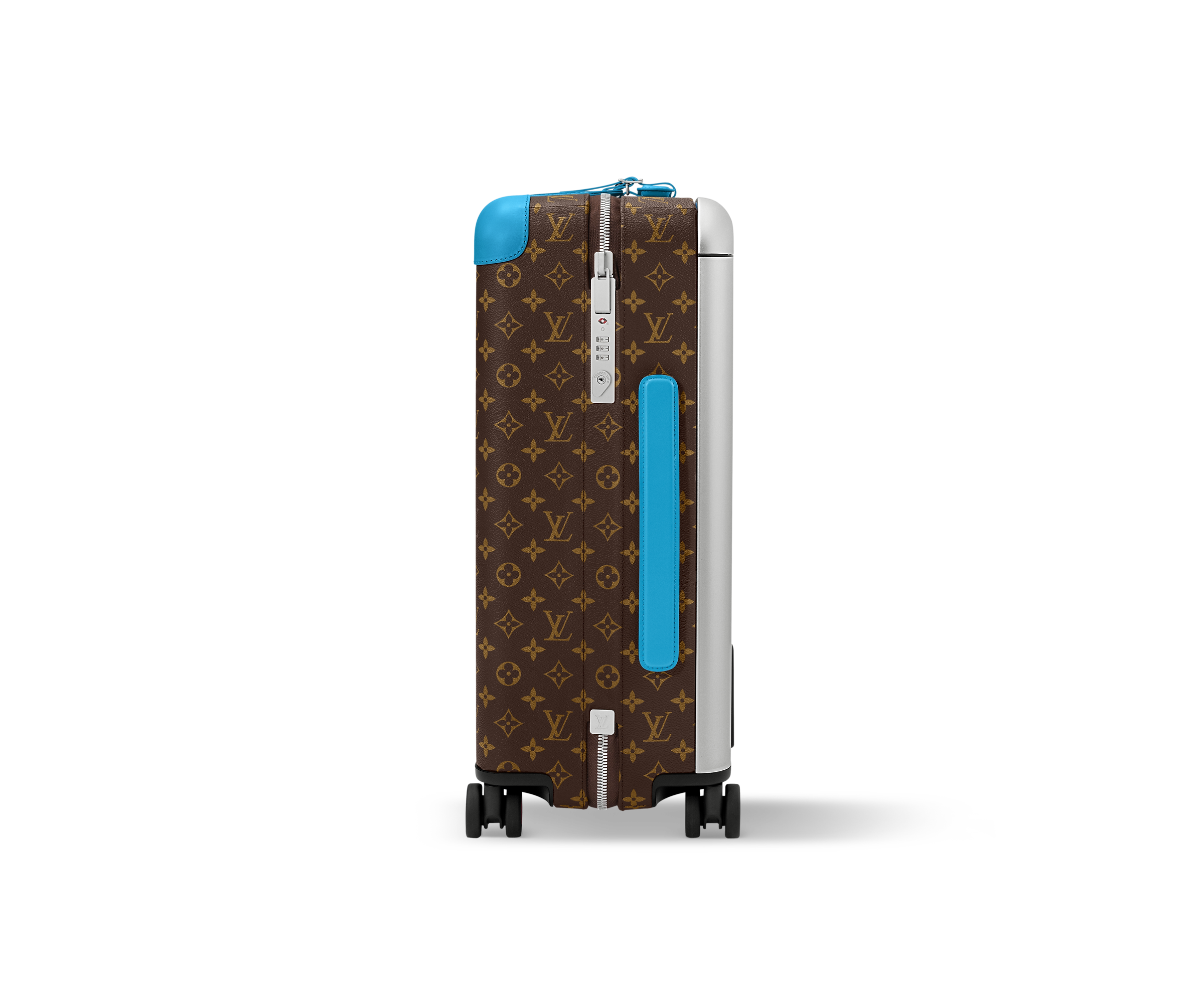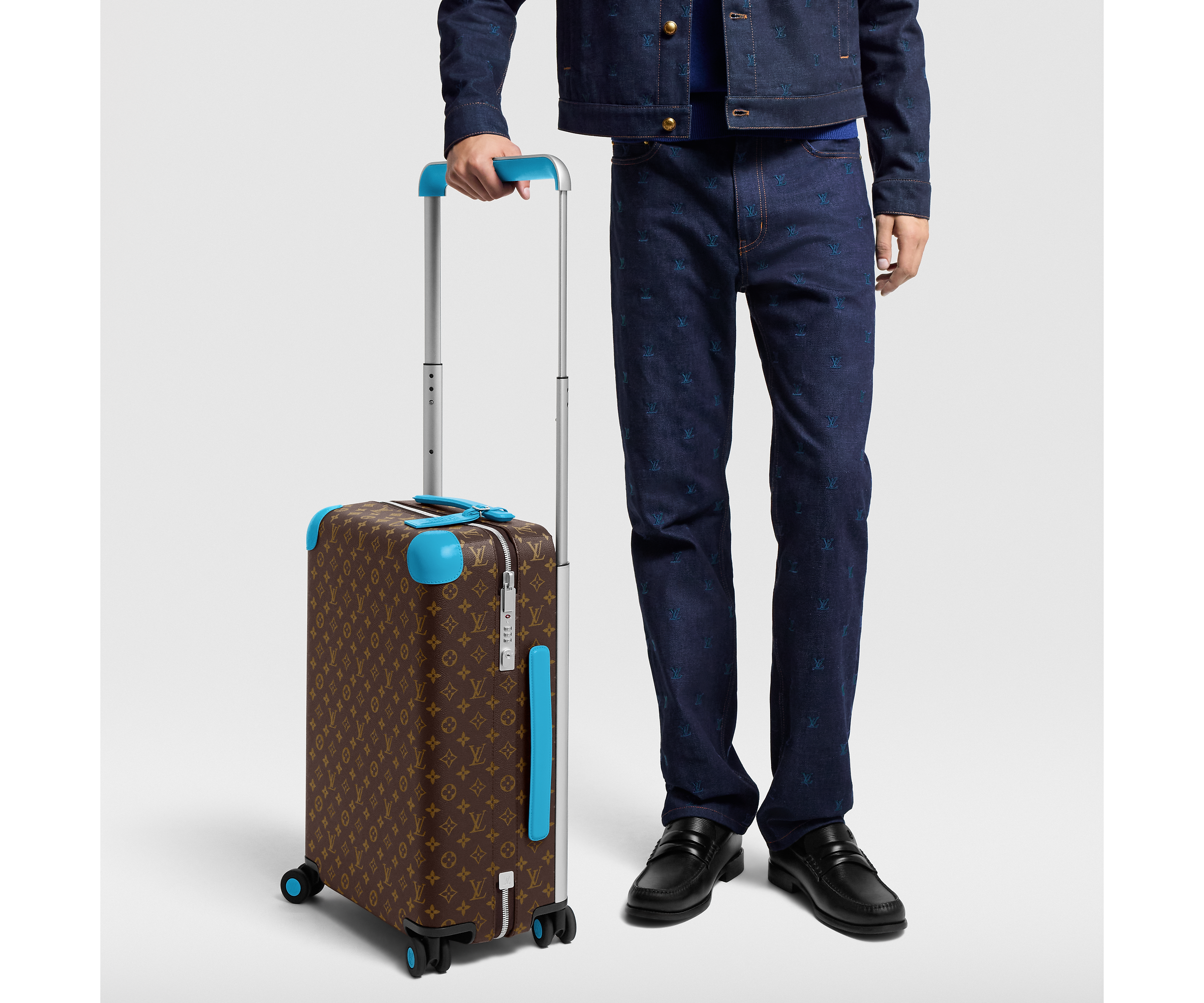 This Horizon 55 rolling suitcase in Monogram Macassar canvas, with touches of vibrant color on the reinforced corners, cane handle, and its compact wheels, is small enough to carry onto a plane. And yet its interior is remarkably roomy thanks to its external cane. The lining is in the same bright color as the exterior details.