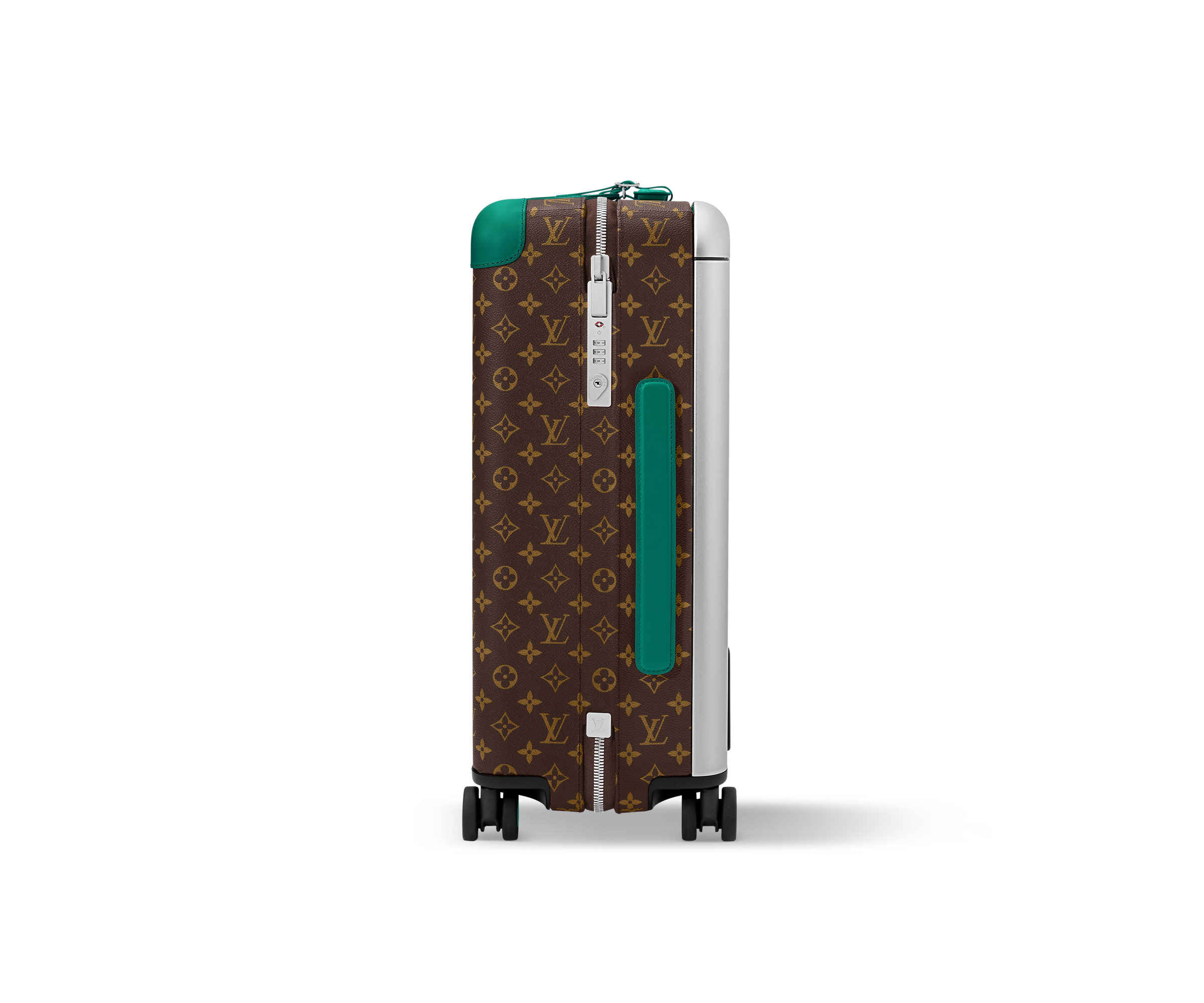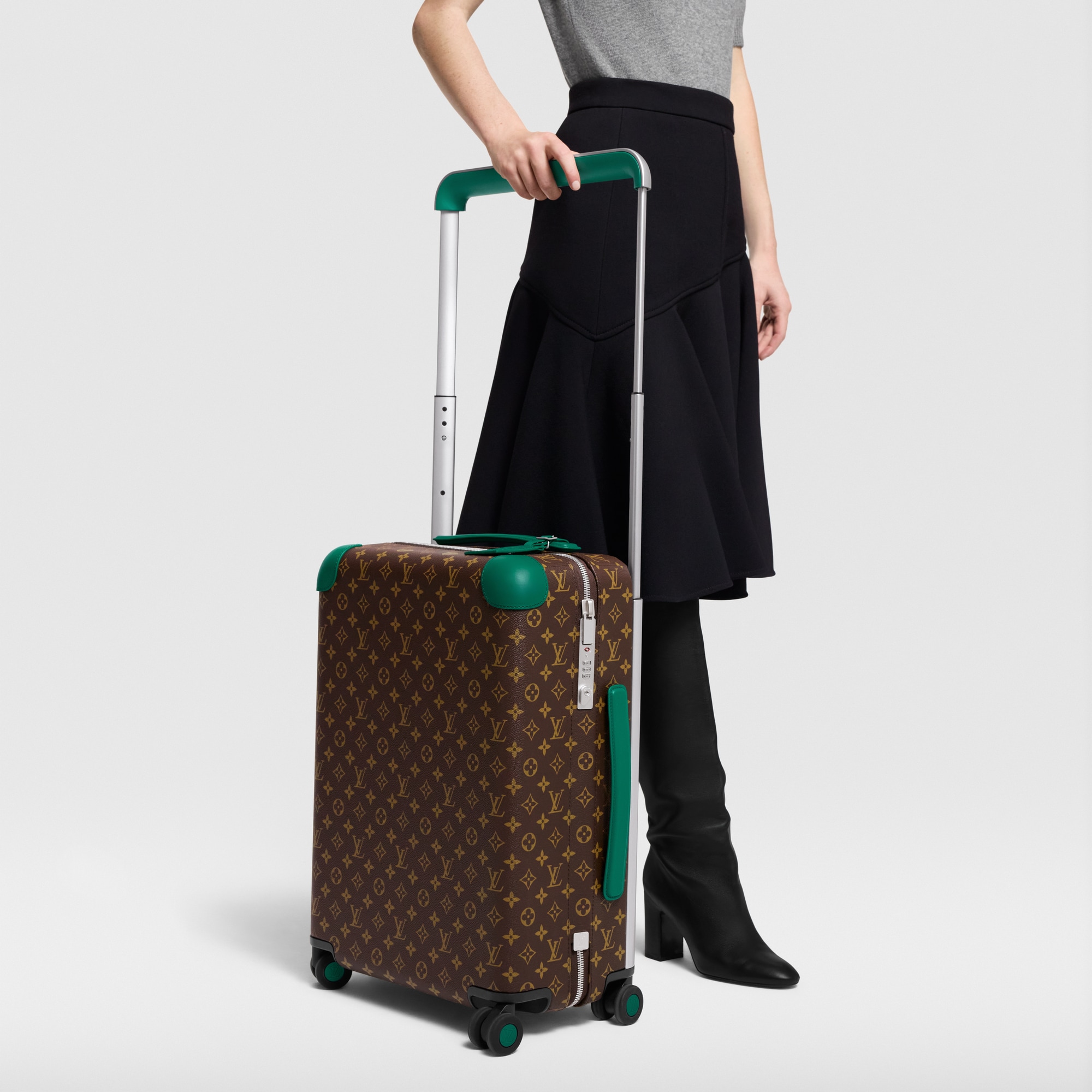 This Horizon 55 rolling suitcase in Monogram Macassar canvas, with touches of vibrant color on the reinforced corners, cane handle, and its compact wheels, is small enough to carry onto a plane. And yet its interior is remarkably roomy thanks to its external cane. The lining is in the same bright color as the exterior details.