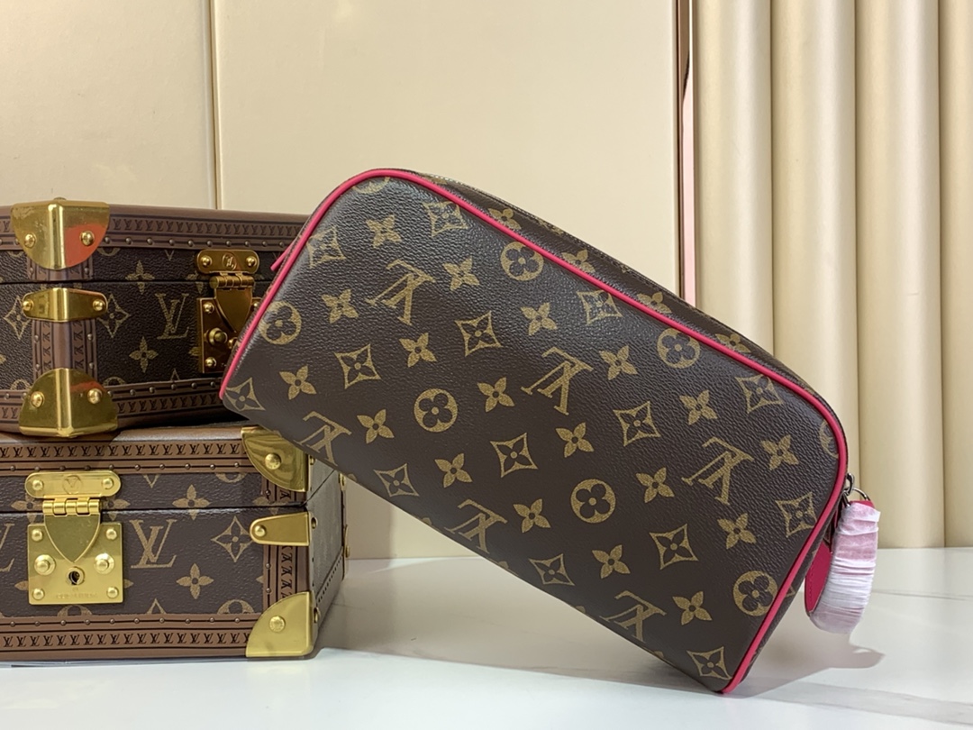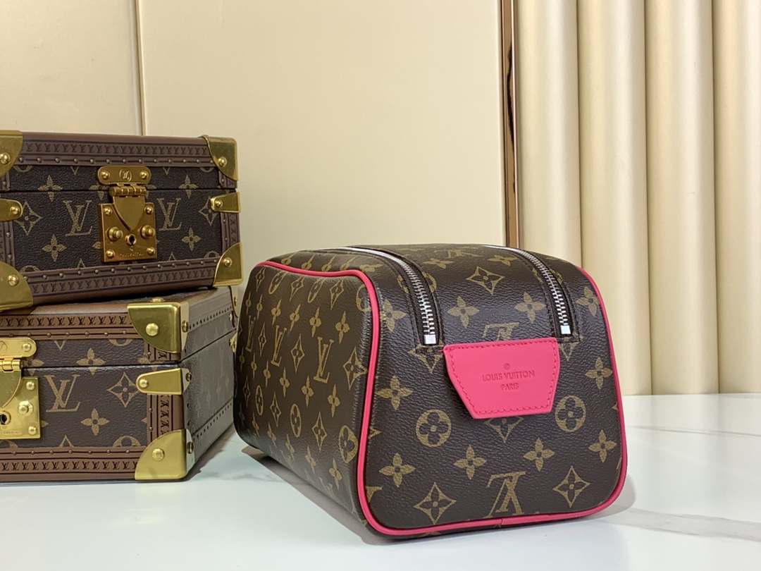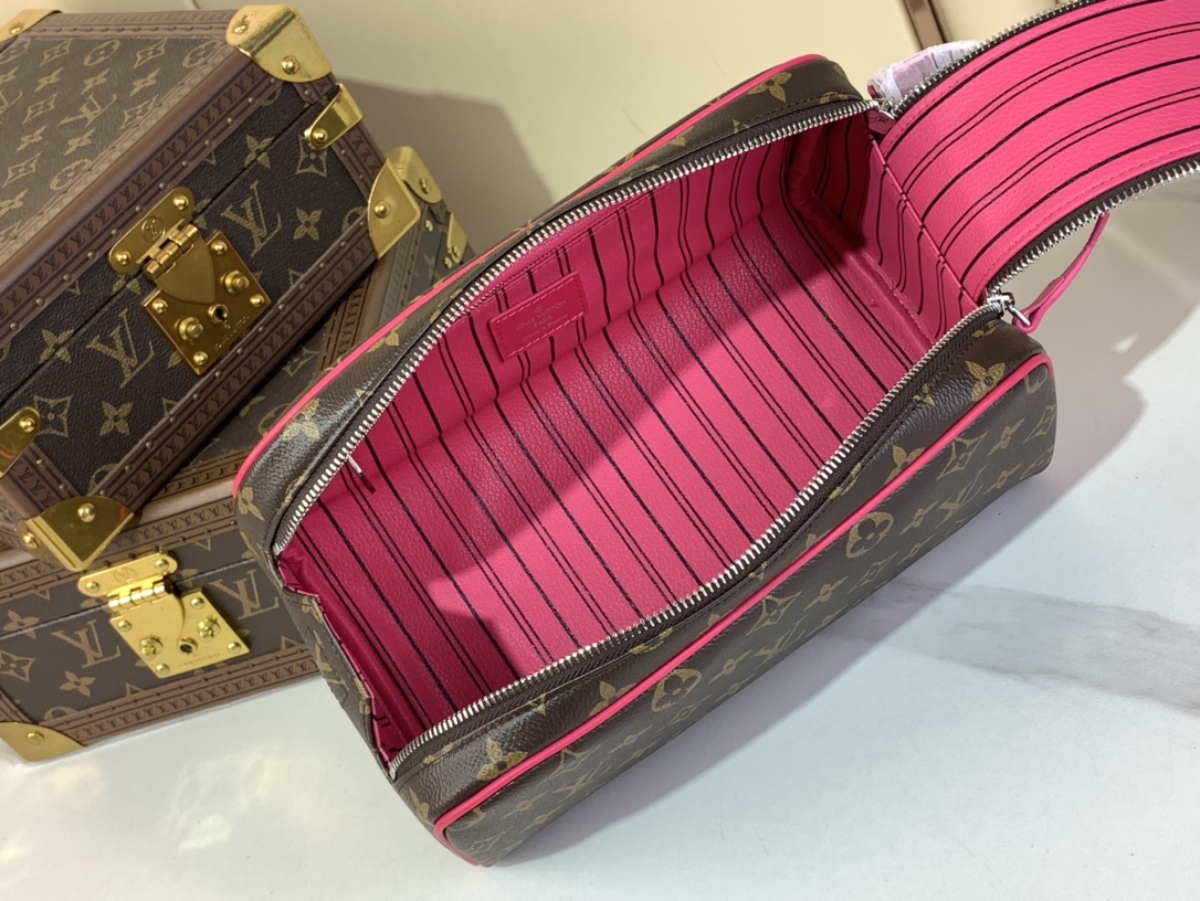 Sturdy and practical, the Dopp Kit in Monogram Macassar coated canvas is adorned with colored piping and colored leather on the handle attached to the double zipper. Designed for storing grooming essentials and toiletries, it has a washable lining in the same color as the color of the exterior details.