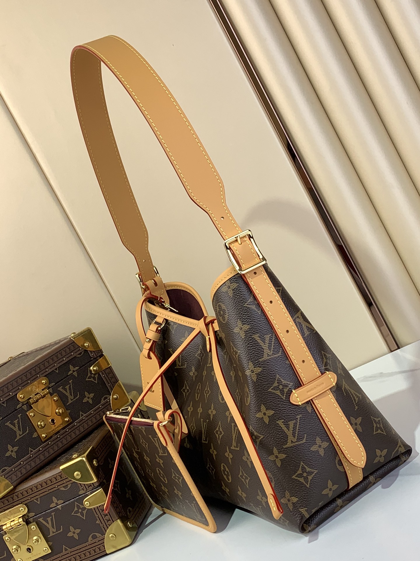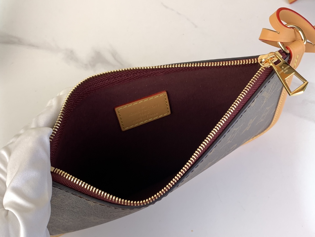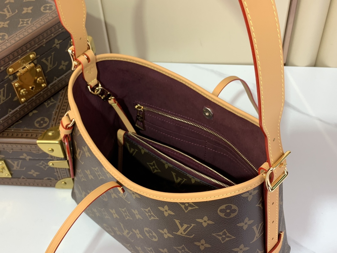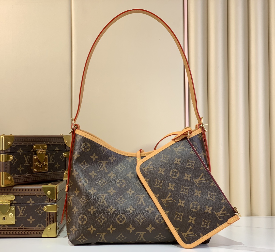 Combining allure with body-friendly design, the CarryAll PM bag in Monogram canvas with a natural leather trim is a go-everywhere city bag. Great storage capacity and a smartly designed interior with two large inside pockets make it practical. A detachable zipped pouch, also in Monogram canvas, is attached to the bag by a leather strap.