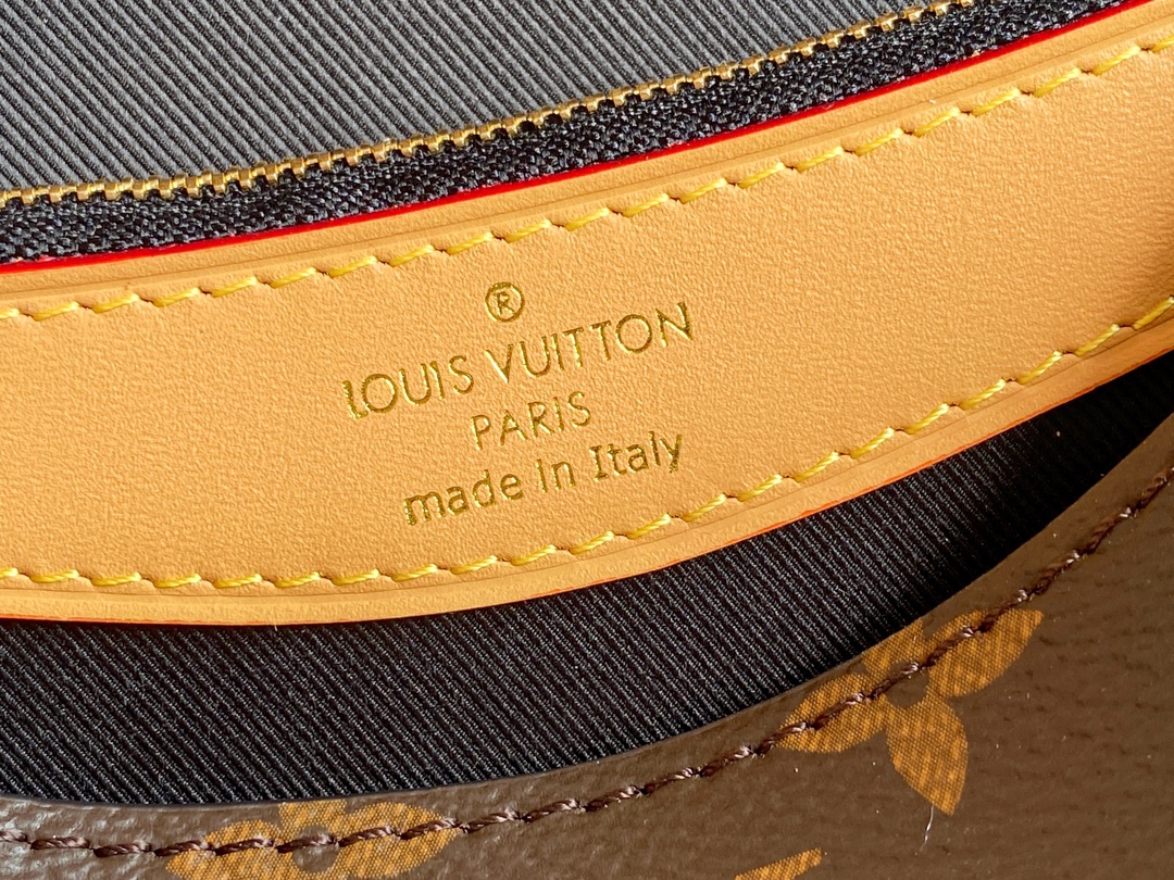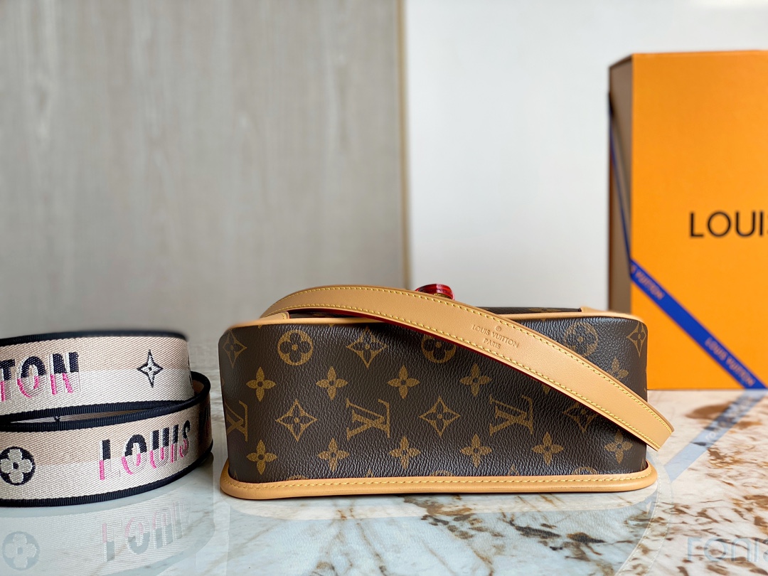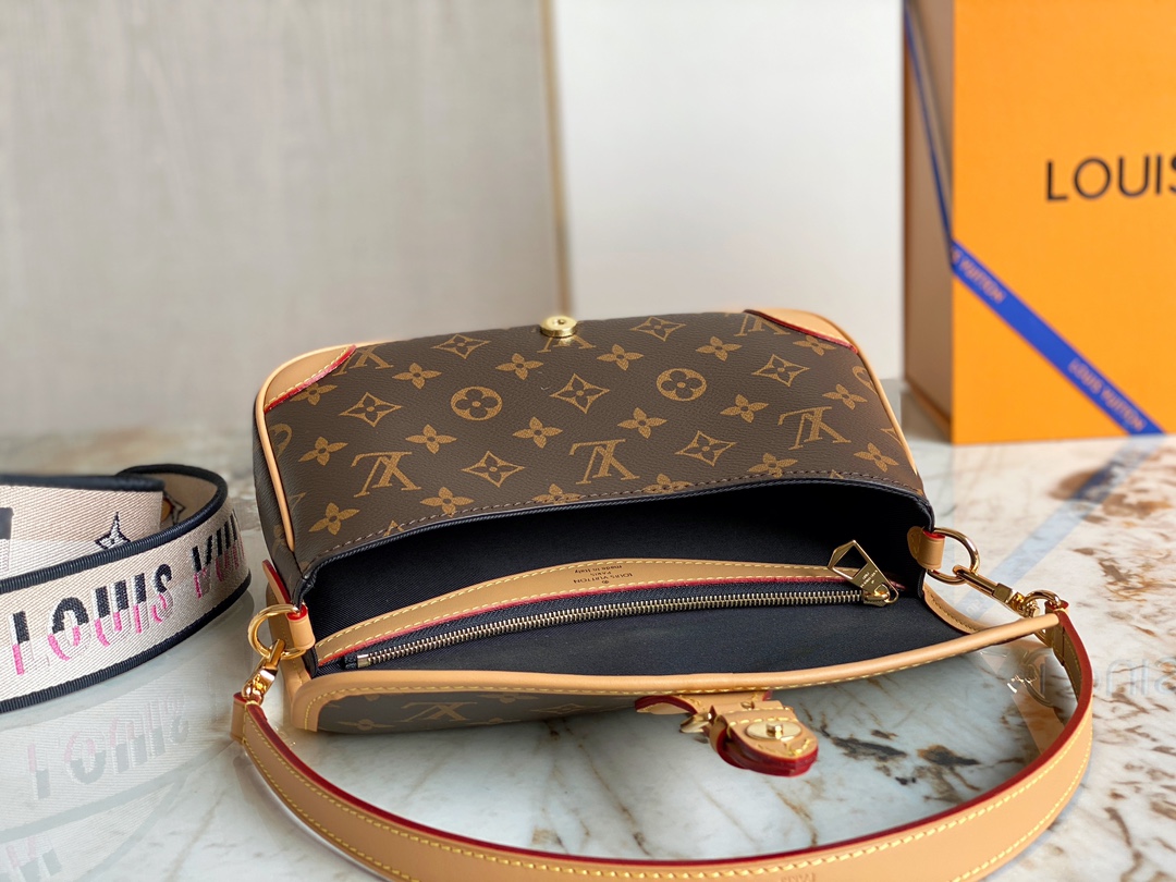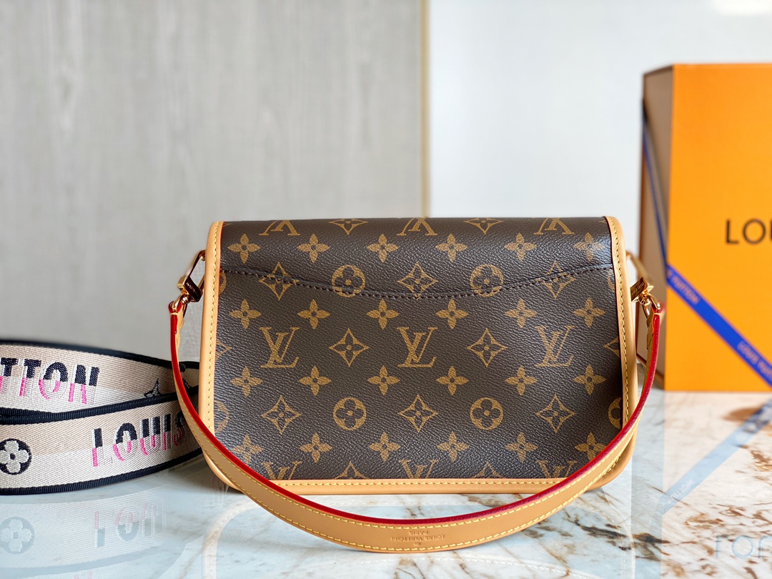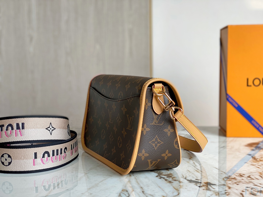 The Diane satchel in Monogram canvas revisits a classic model from the 90s, combining such vintage details as leather corners and an archival-inspired buckle with the modern functionality of smart pockets and a well-organised interior. The exclusive wide jacquard strap reverses from a bold Louis Vuitton signature to a subtle Monogram Flower motif.