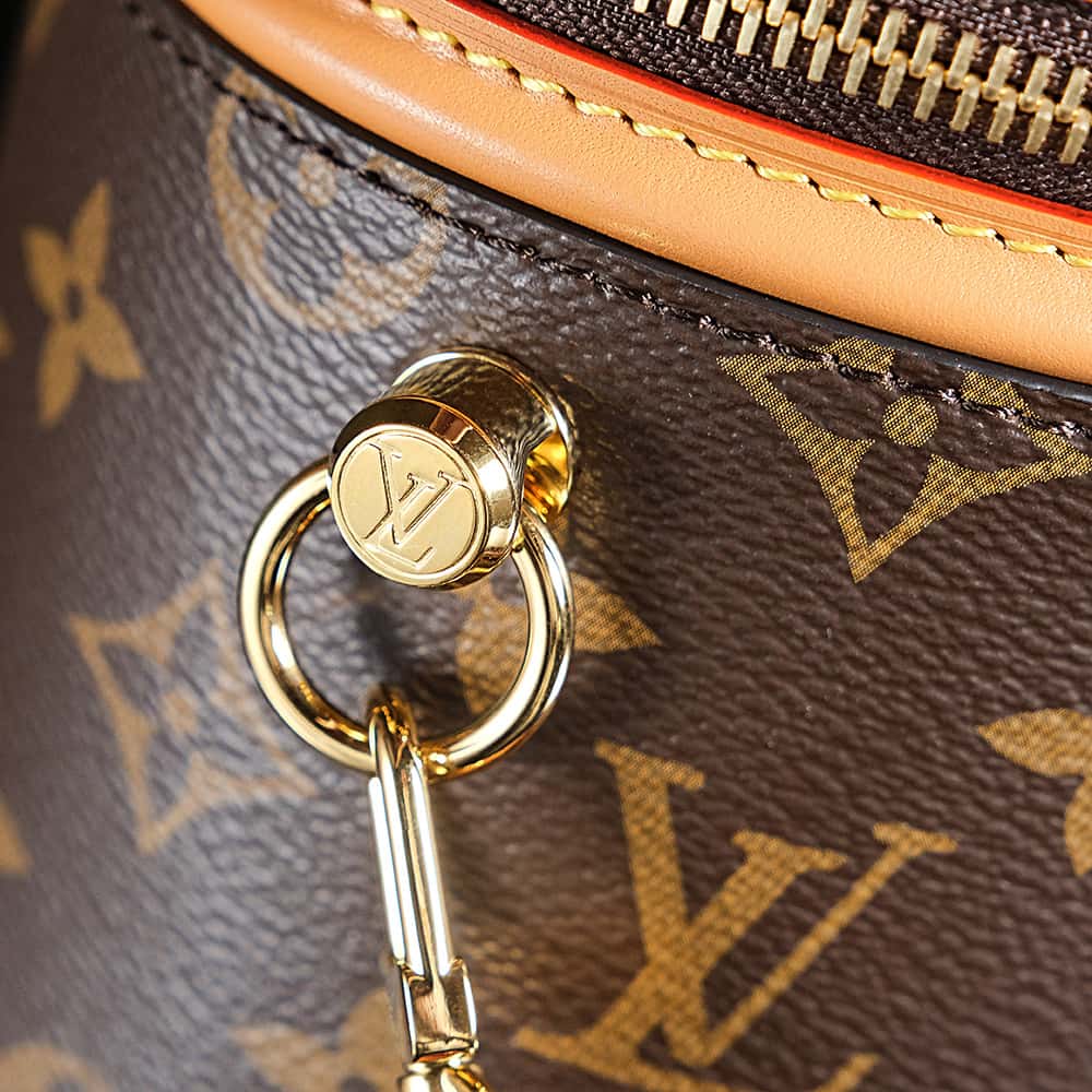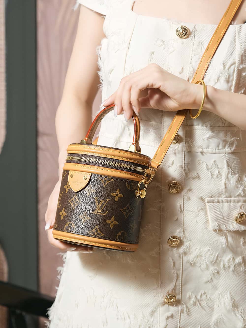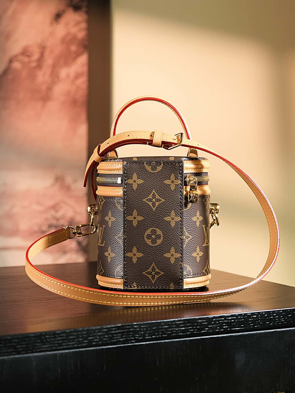 The Nano Cannes bag in Monogram canvas is notable for its cylindrical shape, which was inspired by a beauty case. This meticulously crafted piece is complemented by natural leather trim, including a tag embossed with the Louis Vuitton signature. Its top handle and adjustable, removable shoulder strap offer different carry options.