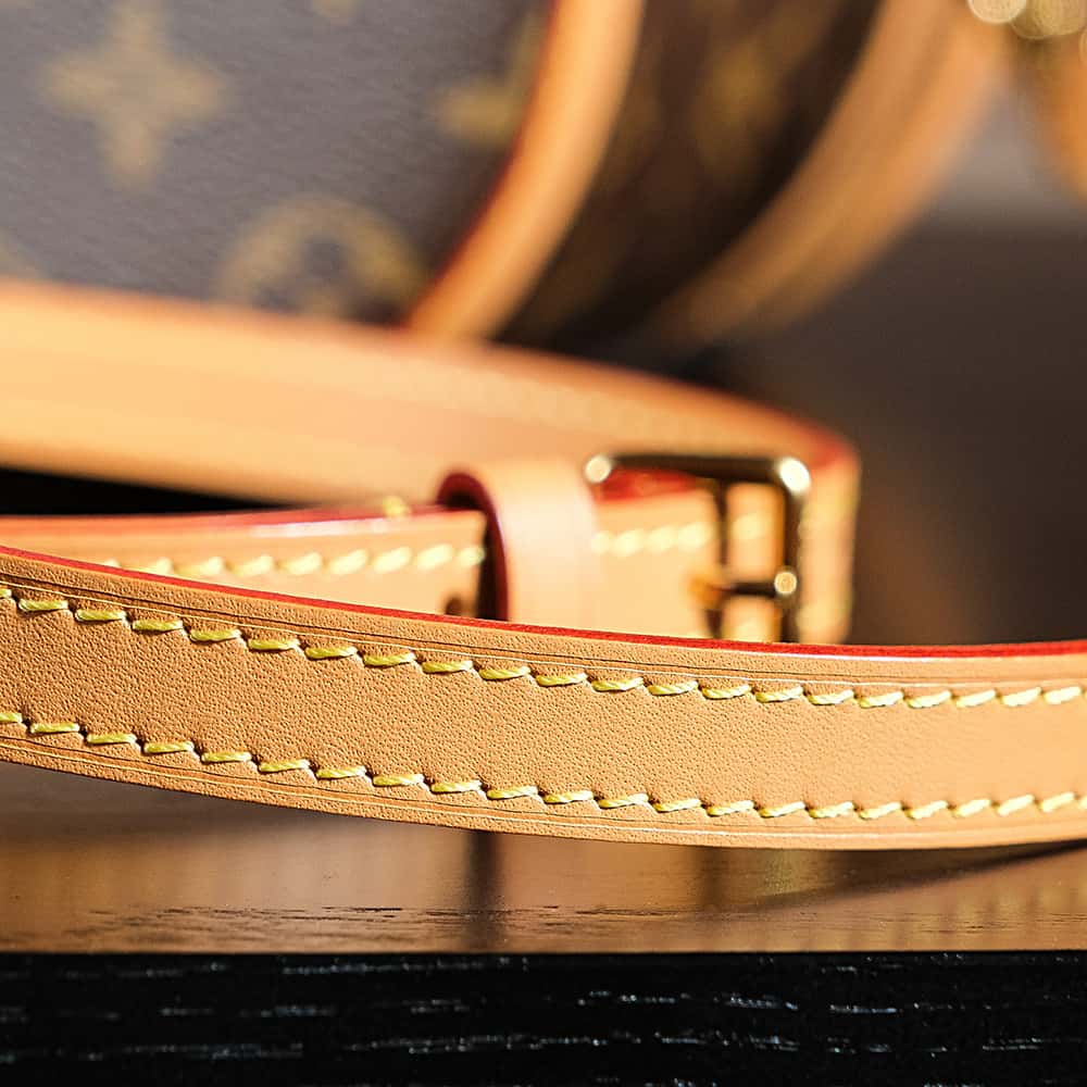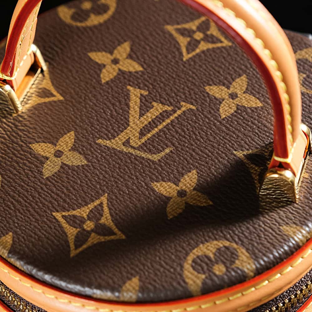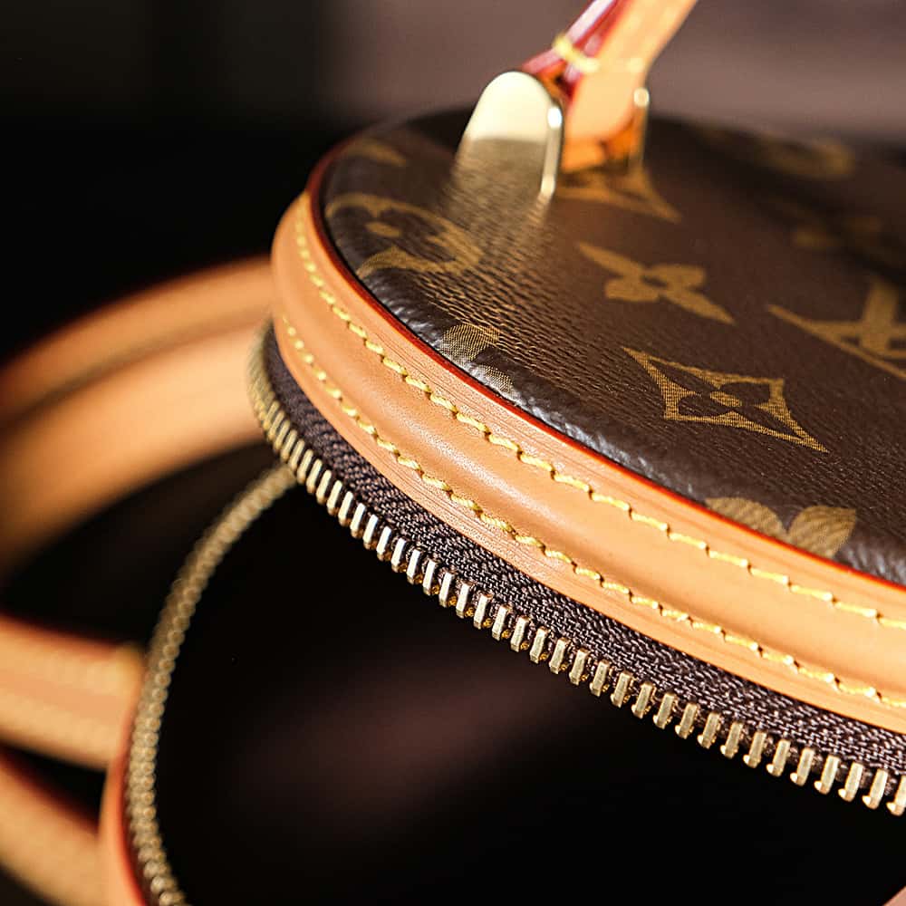 The Nano Cannes bag in Monogram canvas is notable for its cylindrical shape, which was inspired by a beauty case. This meticulously crafted piece is complemented by natural leather trim, including a tag embossed with the Louis Vuitton signature. Its top handle and adjustable, removable shoulder strap offer different carry options.