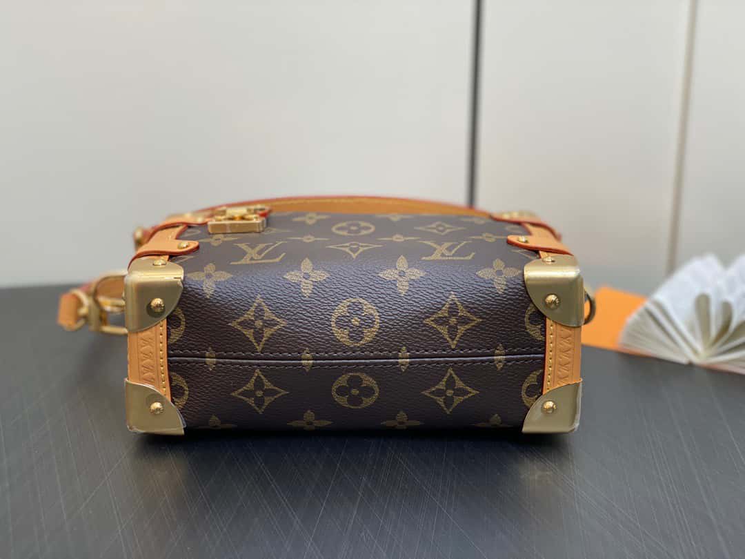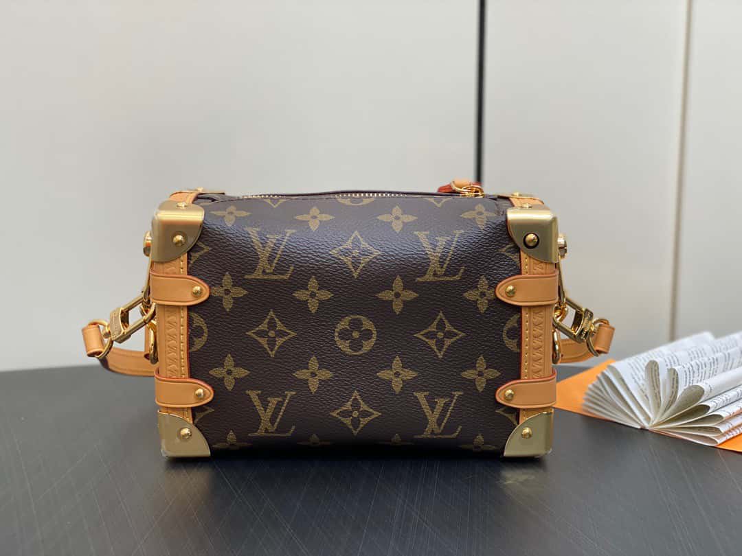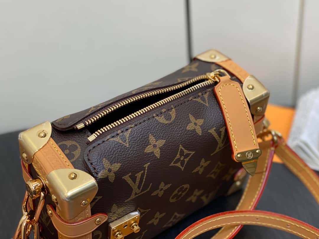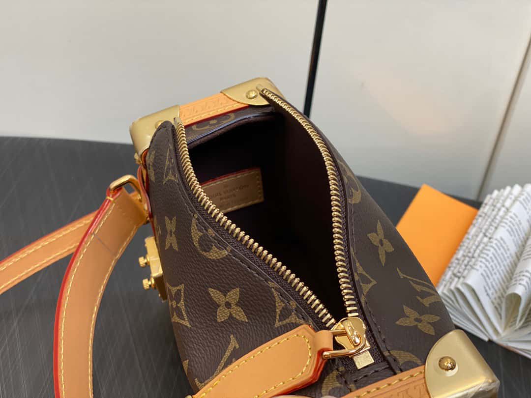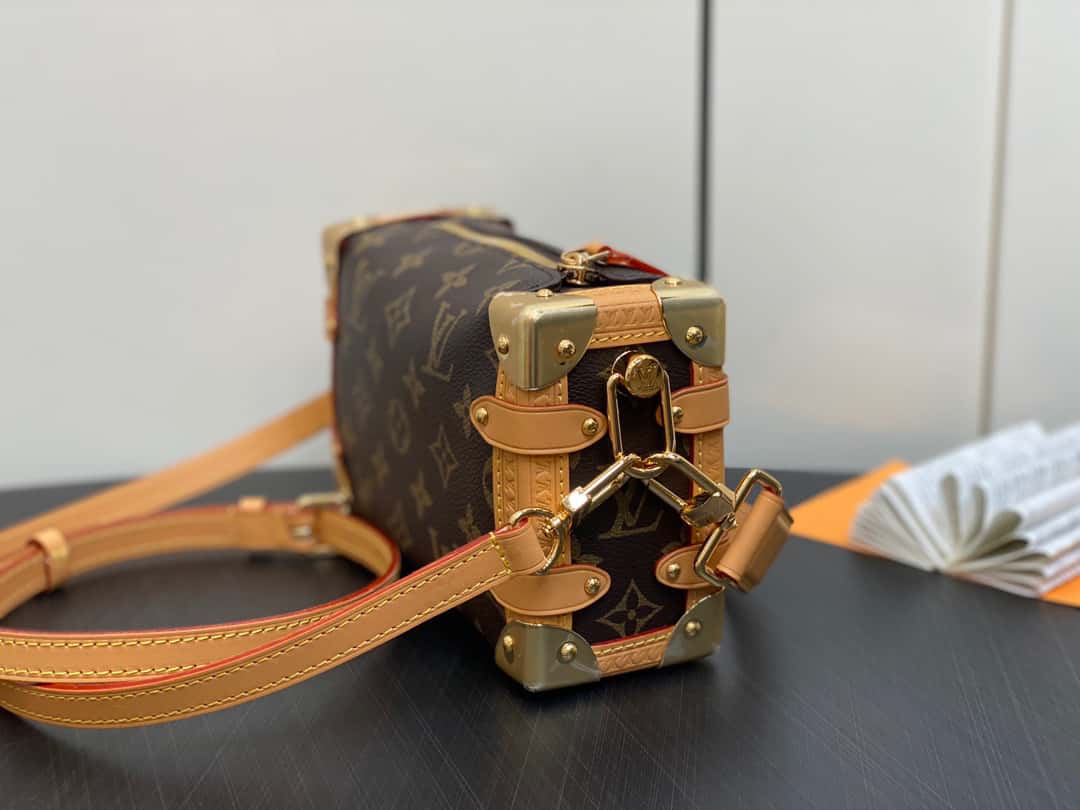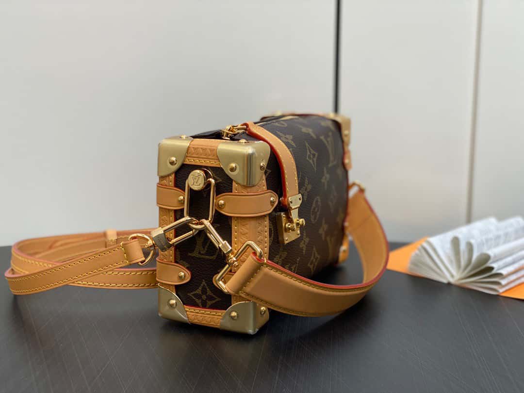 Evocative of the House’s historic trunks, the Side Trunk PM’s rectangular shape is fashioned from Monogram canvas with cowhide-leather trim and gold-color hardware. The reinforced corners and S-lock attached to the zipper are directly inspired by Louis Vuitton trunks. It can be carried by hand or on the shoulder thanks to the removable and adjustable leather strap.