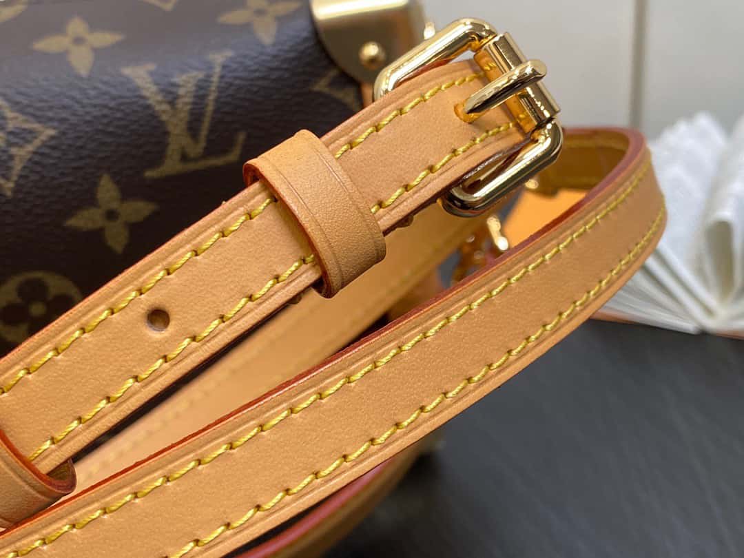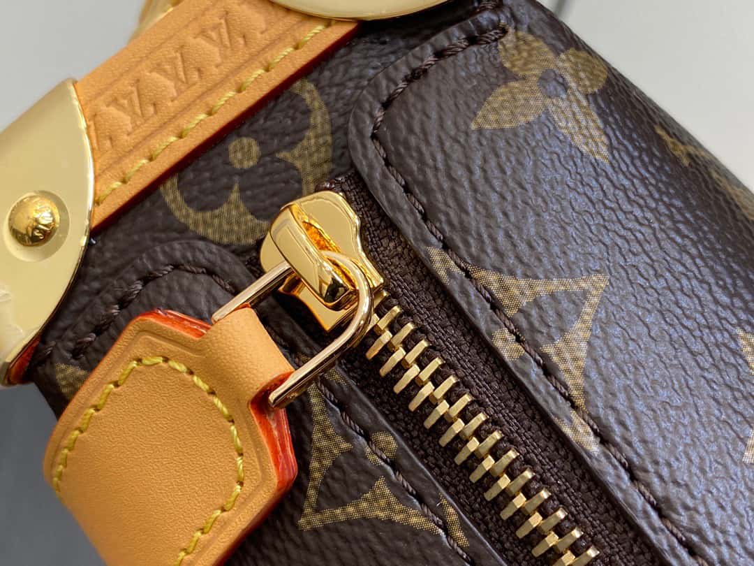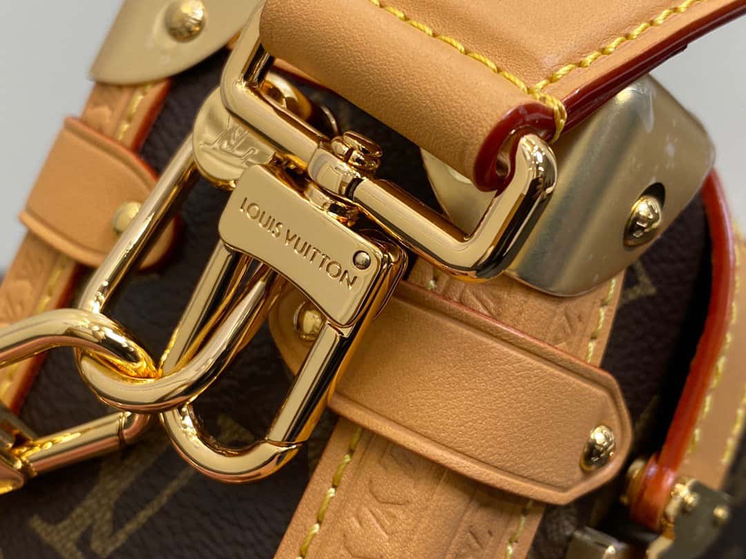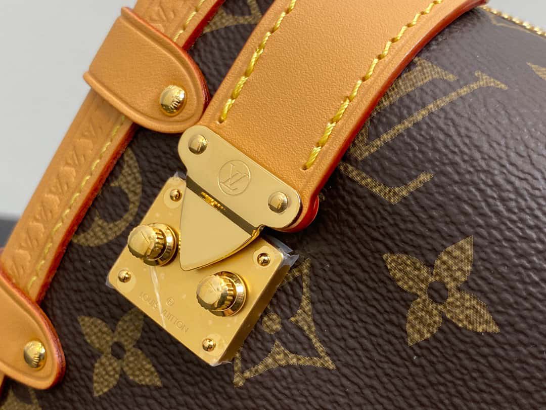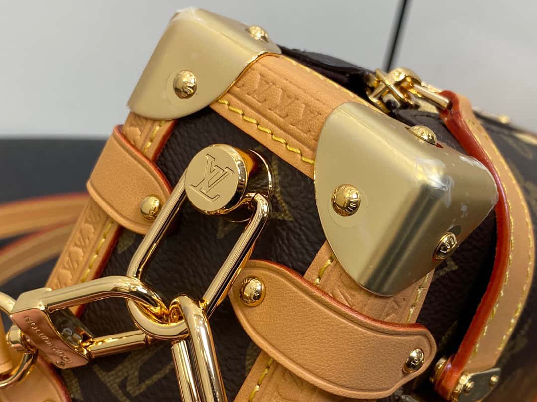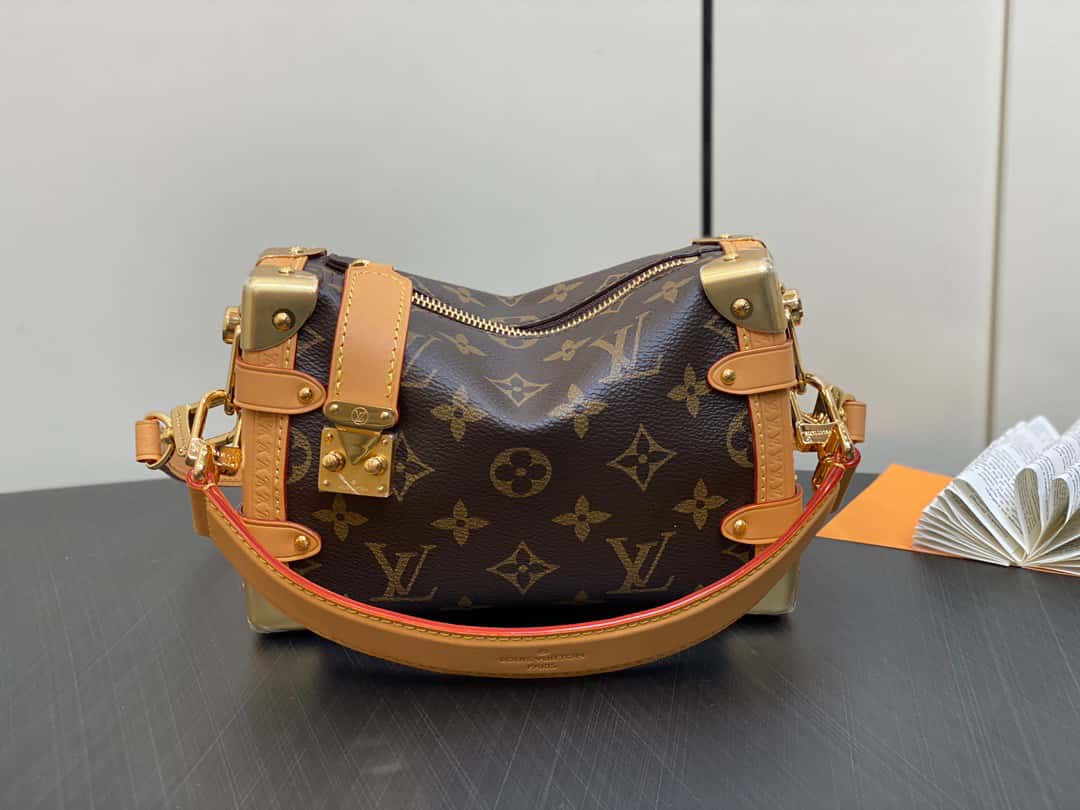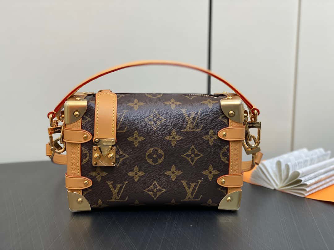 Evocative of the House’s historic trunks, the Side Trunk PM’s rectangular shape is fashioned from Monogram canvas with cowhide-leather trim and gold-color hardware. The reinforced corners and S-lock attached to the zipper are directly inspired by Louis Vuitton trunks. It can be carried by hand or on the shoulder thanks to the removable and adjustable leather strap.