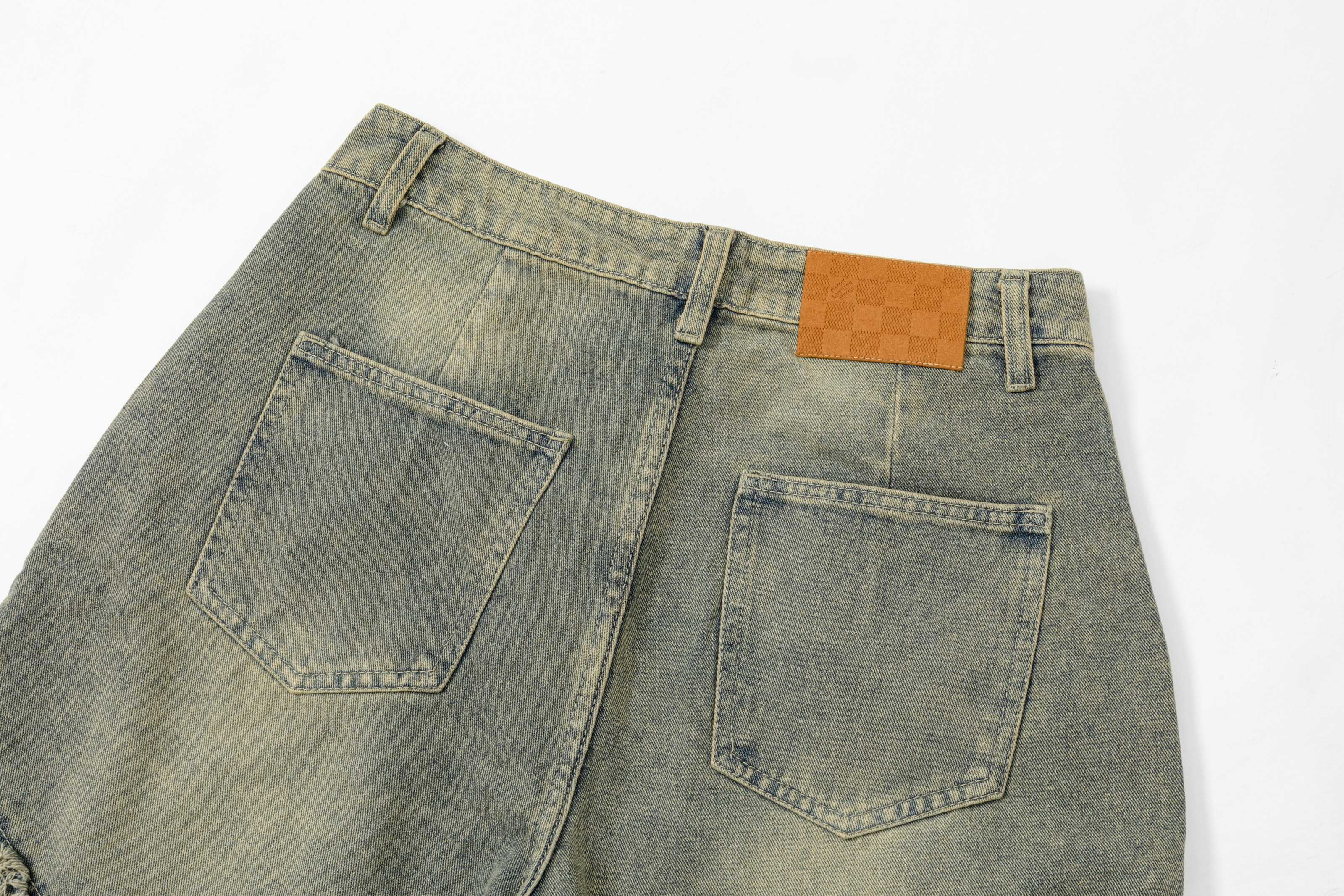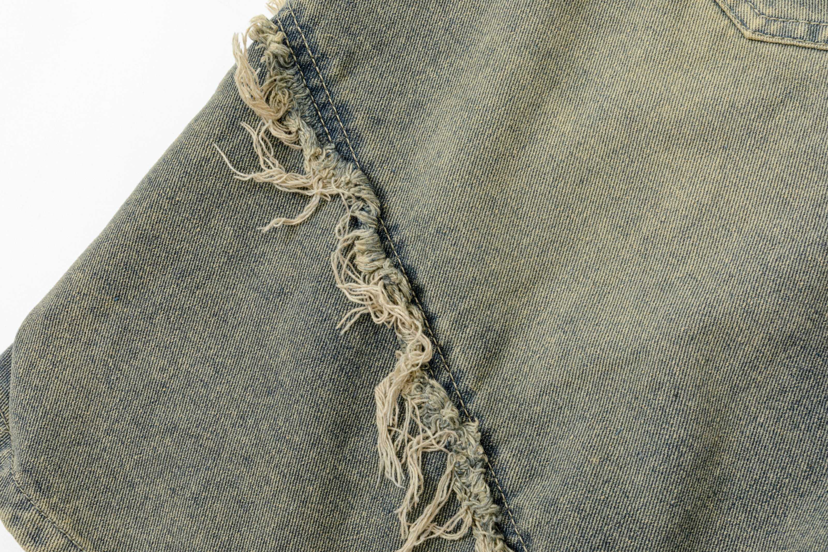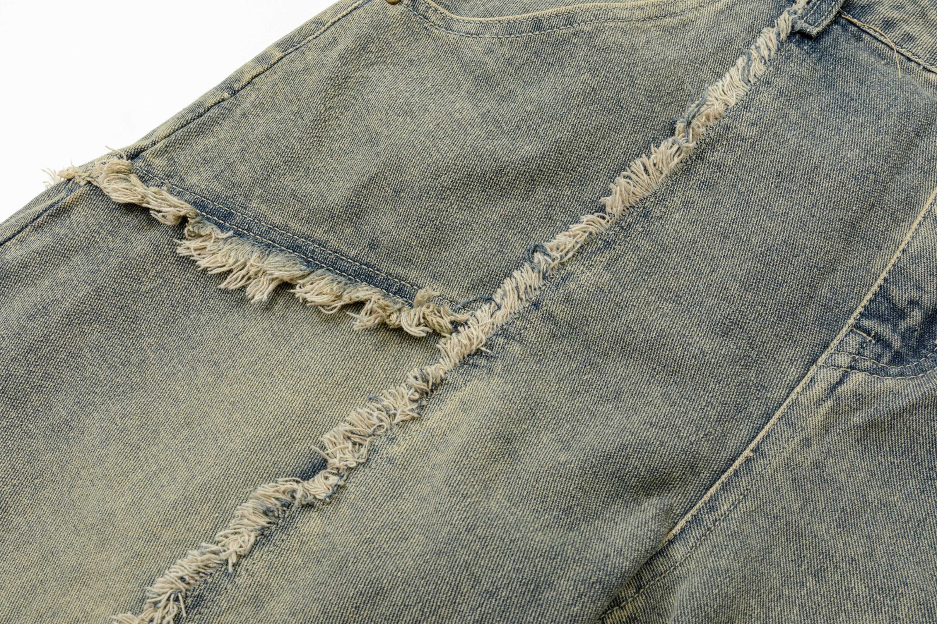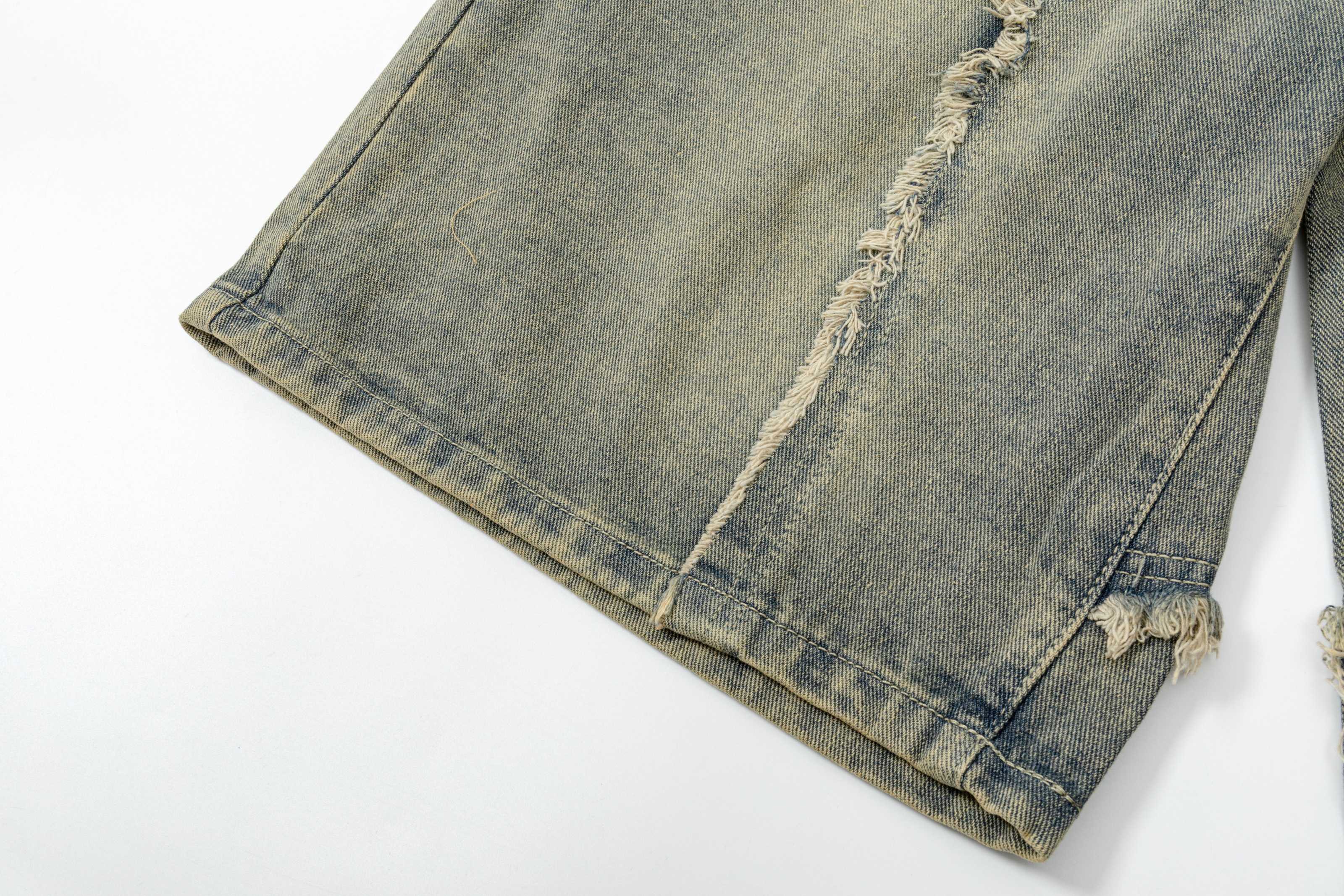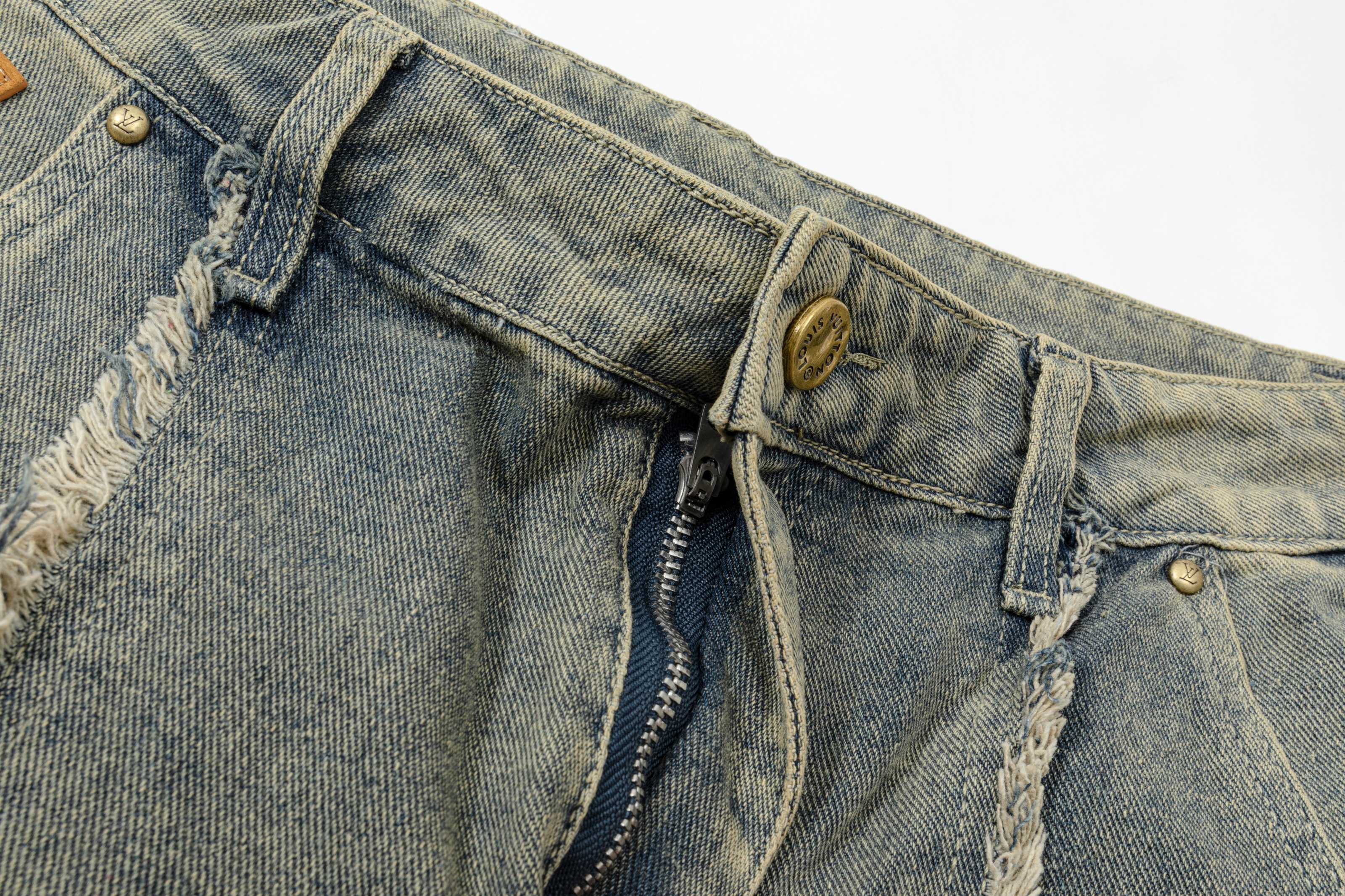 Heavy yellow mud washing, enzyme washing, hand-brushed edge and whisker process