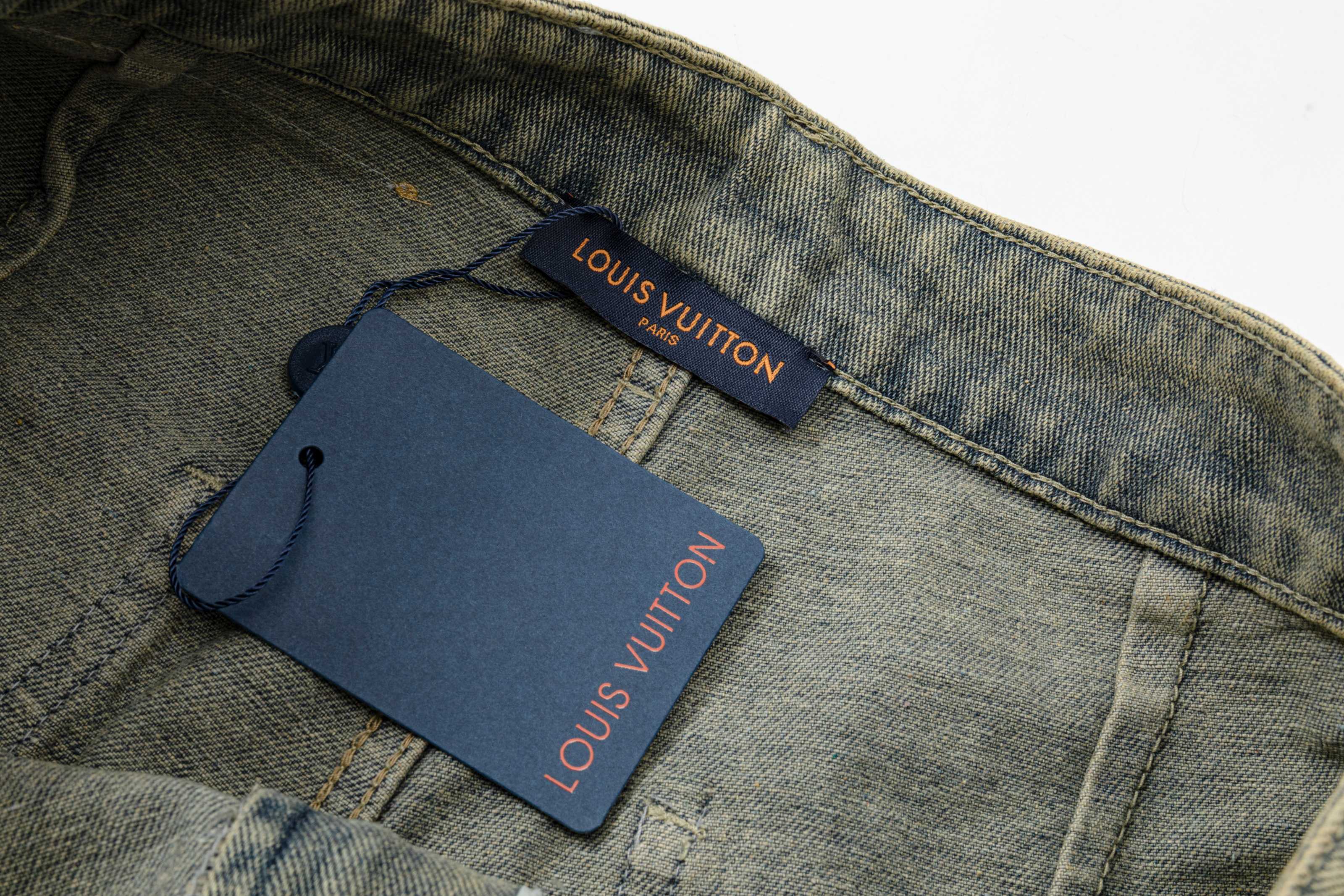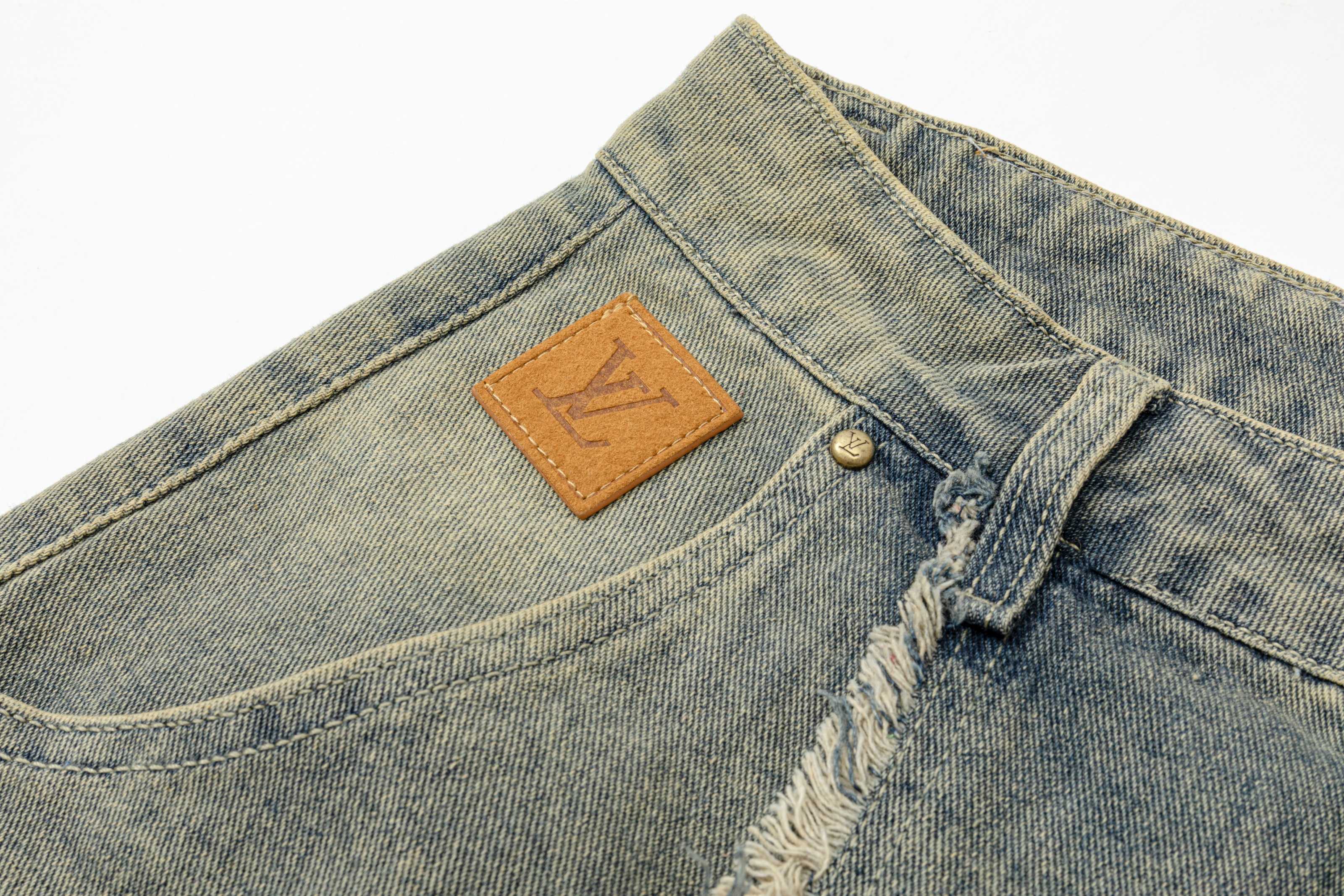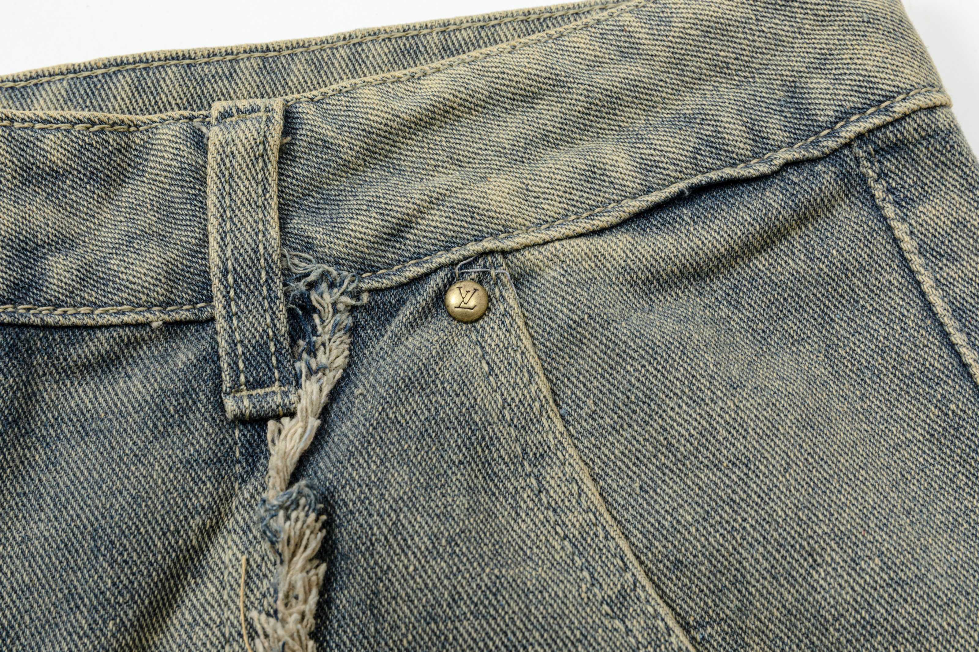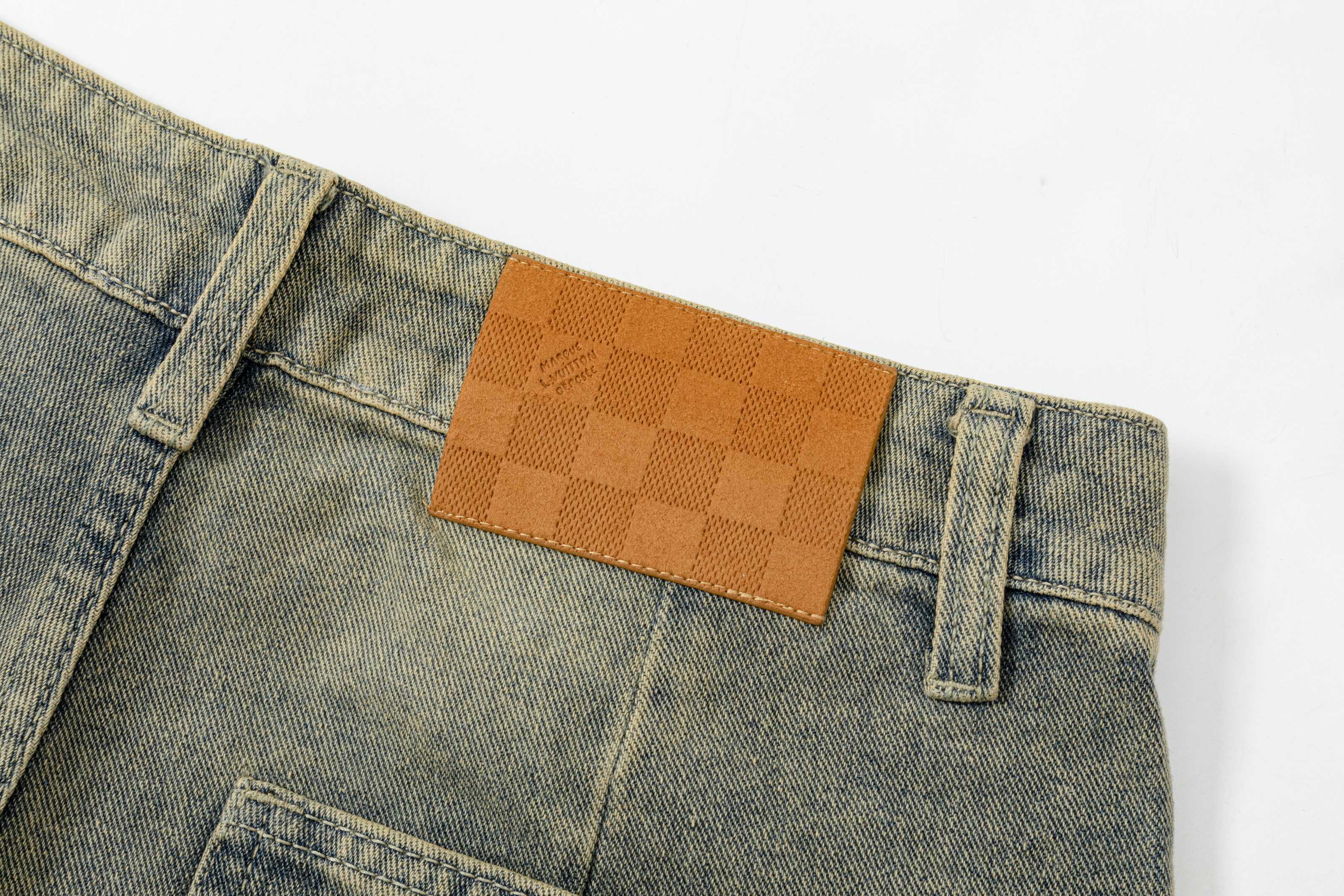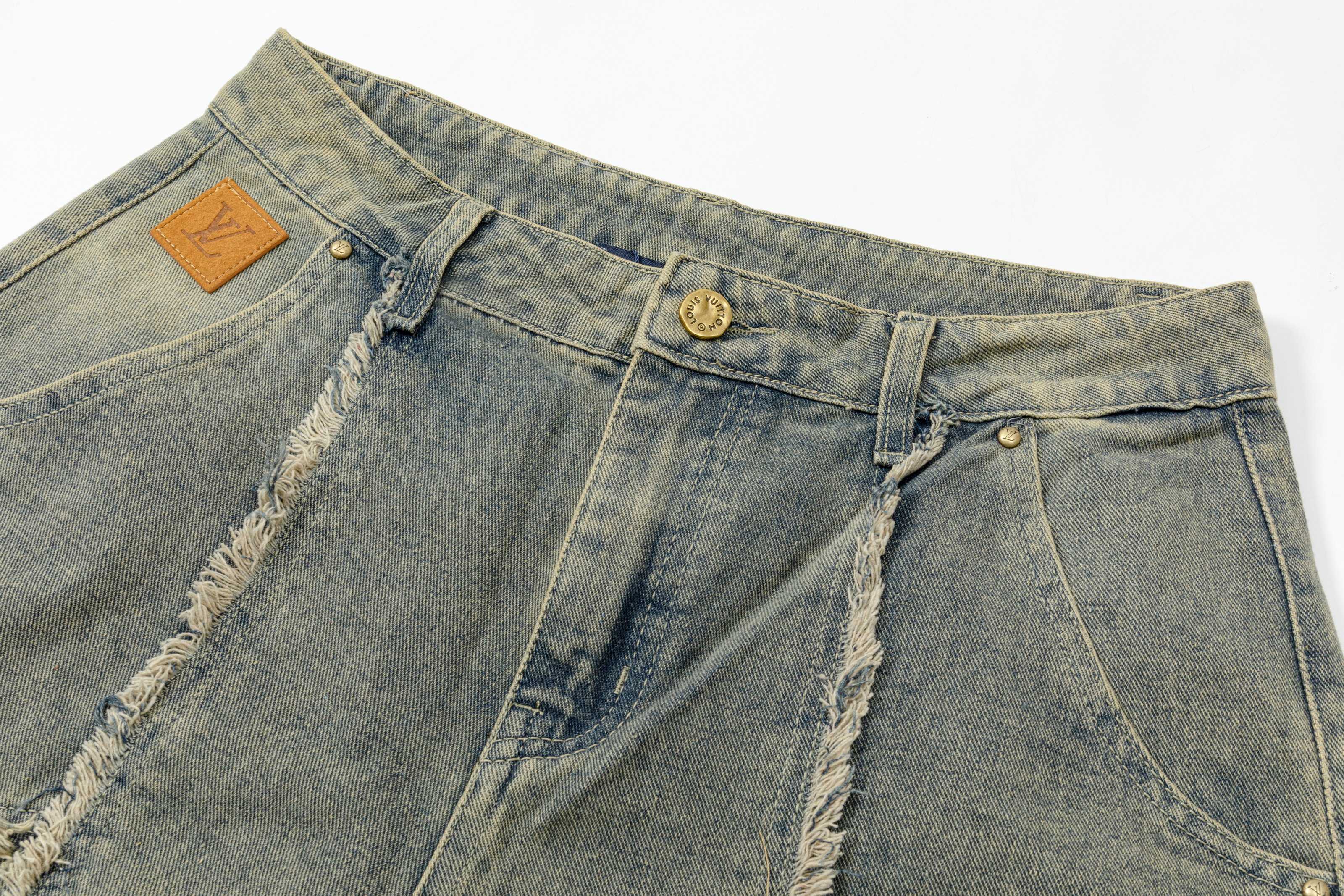 Heavy yellow mud washing, enzyme washing, hand-brushed edge and whisker process