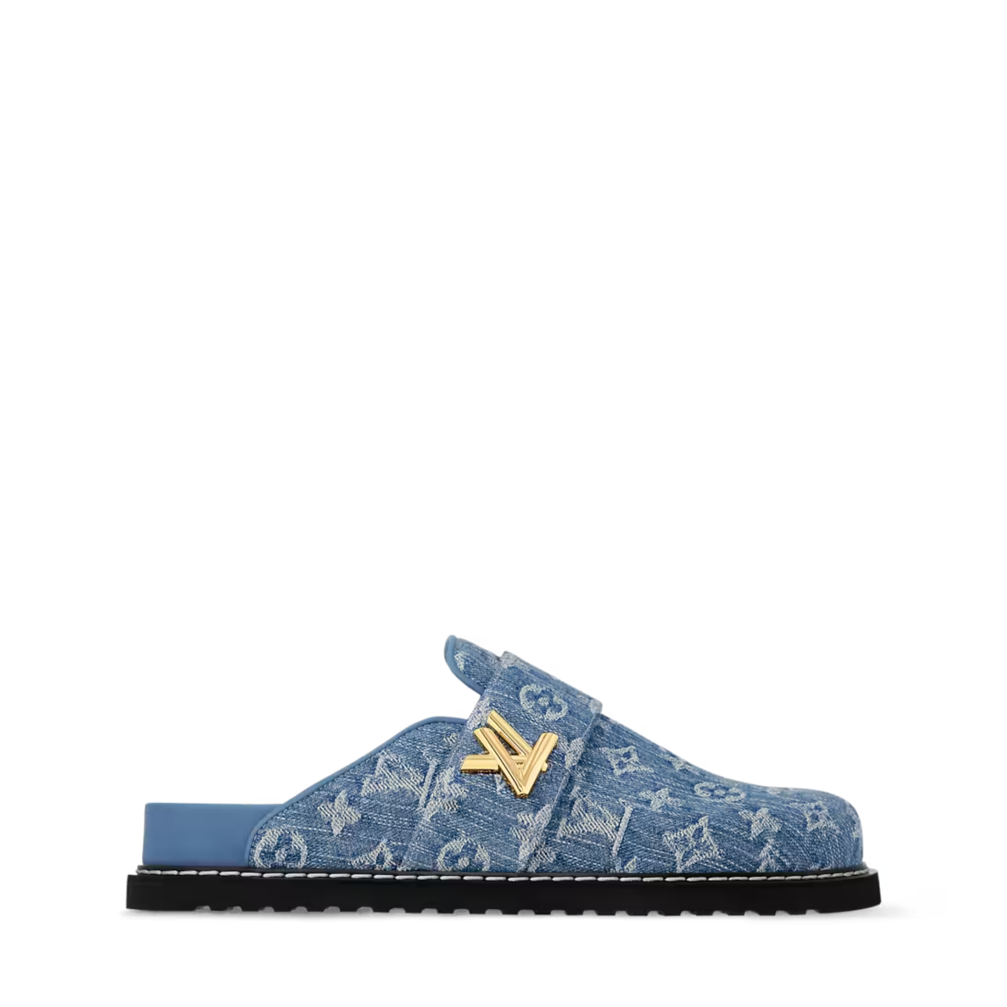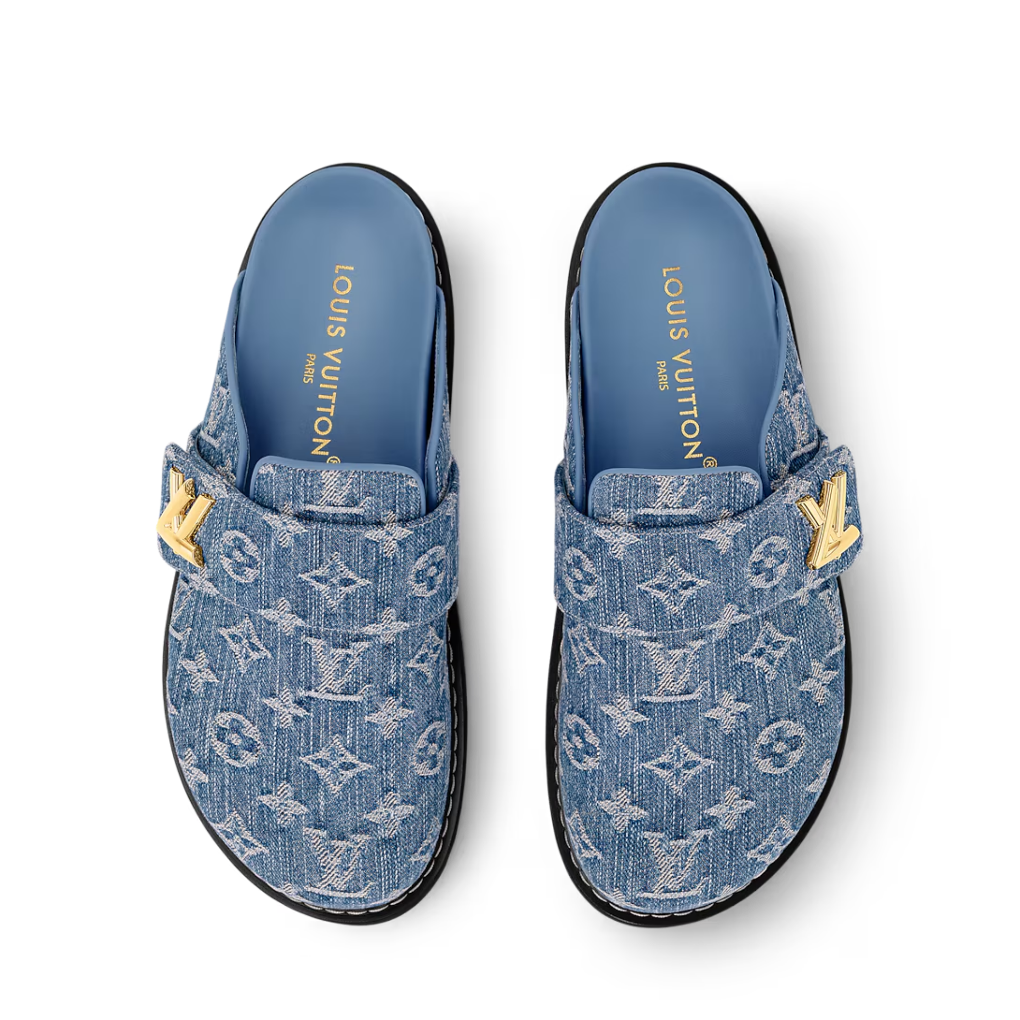 Monogram denim complements the relaxed design of the LV Cosy flat comfort clog. This easy-to-wear slip-on is elevated by refined details, including leather piping and an adjustable leather strap, which is signed with an LV Twist accessory. It has a comfortable anatomic footbed, which is covered in leather, and a lightweight micro outsole.