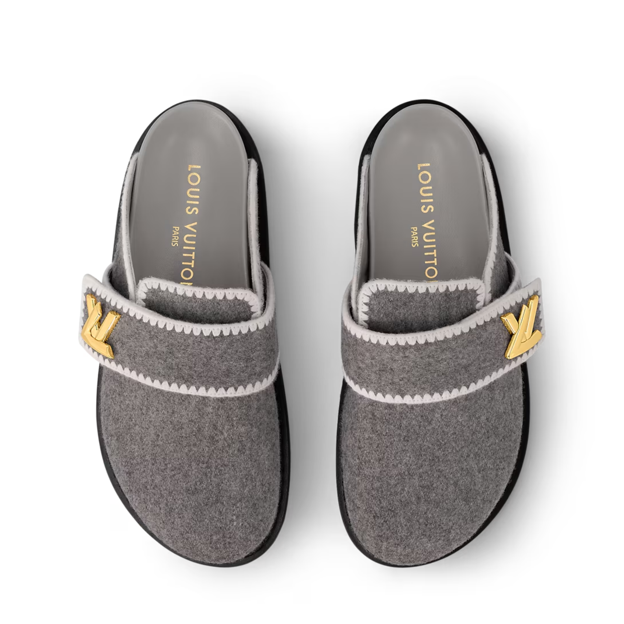 The LV Cosy flat comfort clog features an upper made of soft wool. This relaxed model is elevated by refined details, including contrast stitching around the edges and a gold-toned LV Twist accessory on the strap. It has an anatomic footbed and a lightweight rubber outsole for optimum comfort.