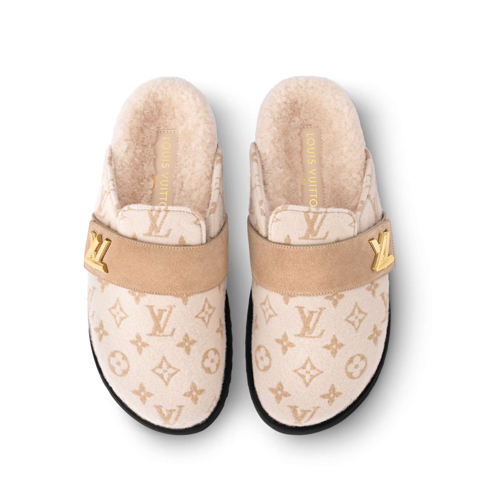 The LV Cosy flat comfort clog lives up to its name in soft Monogram cashgora wool, a material taken from the Women's Ready-to-Wear collection. A shearling-covered insole further enhances this casual-chic style, which comes on a lightweight micro outsole. On the upper, the adjustable strap in suede calf leather is signed with an LV Twist accessory.