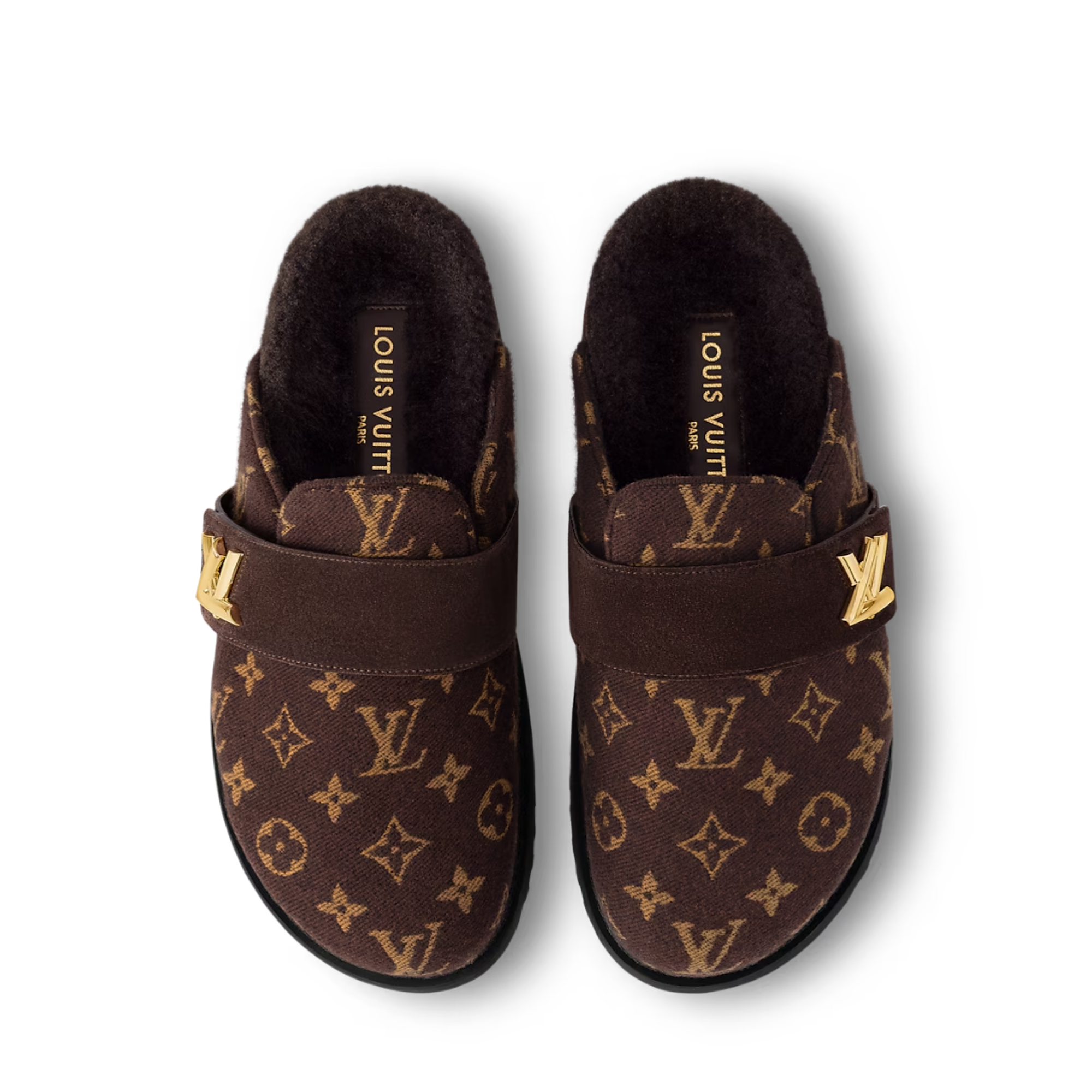 The LV Cosy flat comfort clog lives up to its name in soft Monogram cashgora wool, a material taken from the Women's Ready-to-Wear collection. A shearling-covered insole further enhances this casual-chic style, which comes on a lightweight micro outsole. On the upper, the adjustable strap in suede calf leather is signed with an LV Twist accessory.