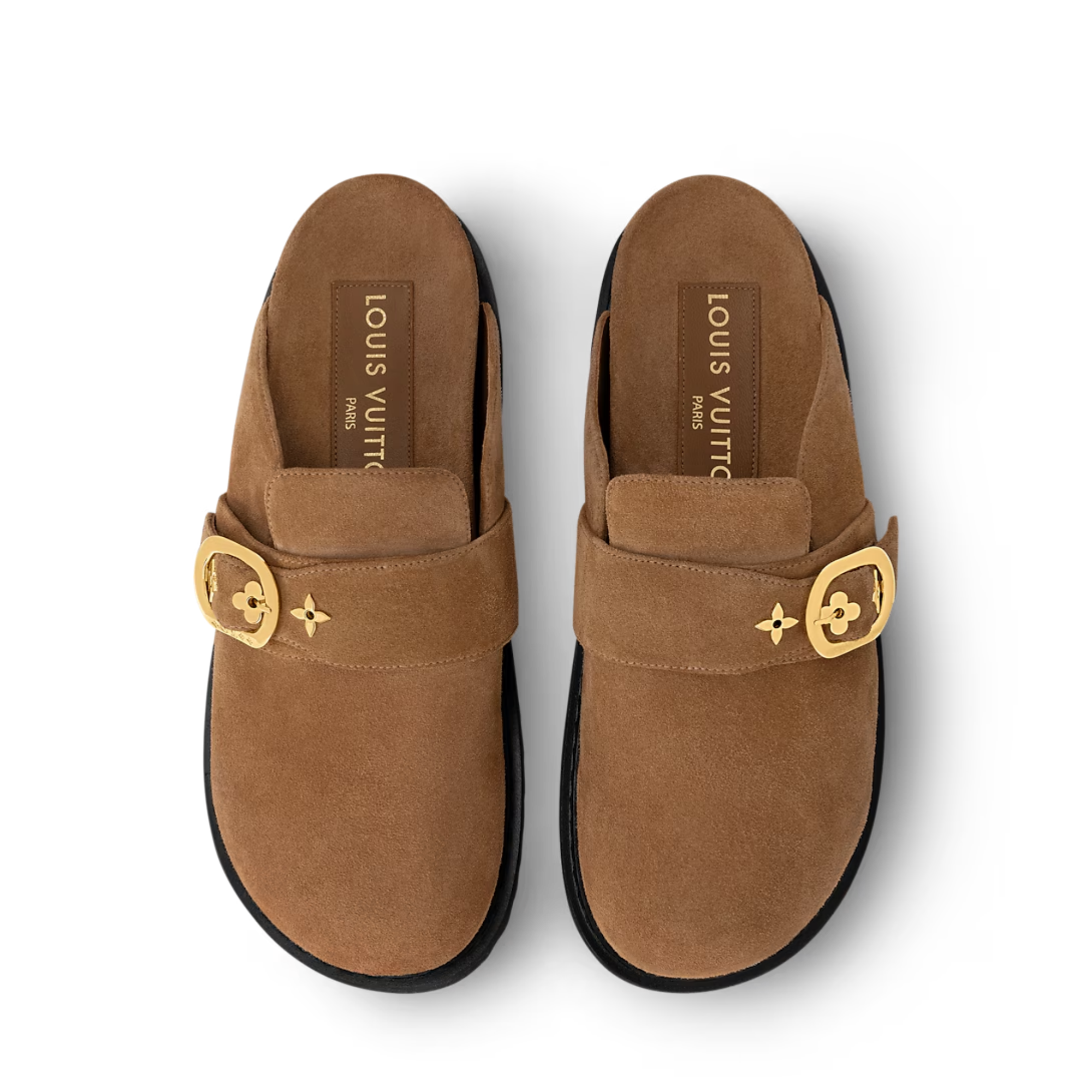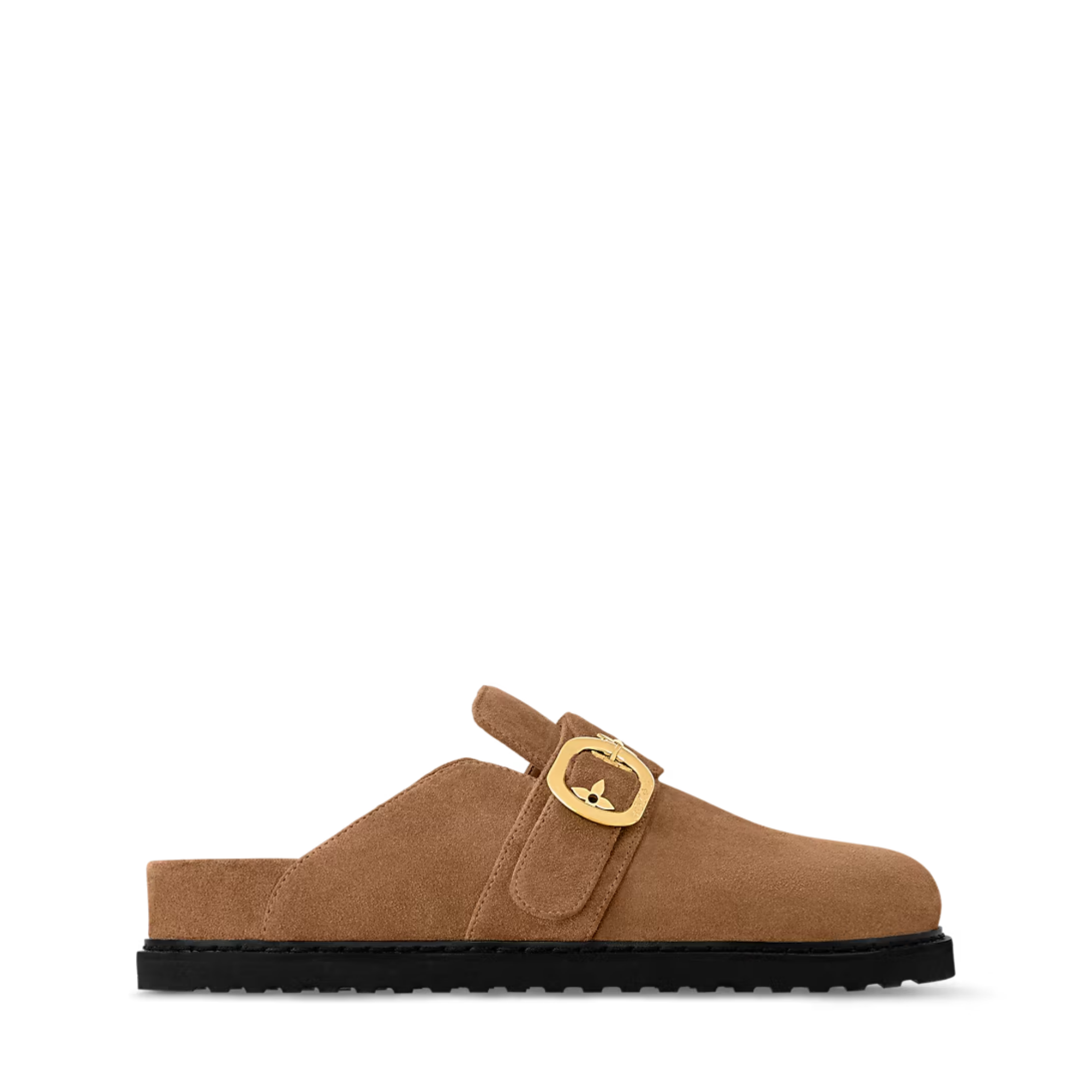 The LV Cosy flat comfort clog is an on-trend, easy-to-wear style in velvety suede calf leather. The upper features an adjustable strap with a large oval buckle and Monogram Flower eyelets in gold-toned metal. An extremely lightweight micro outsole finishes this slip-on model, which is suitable for both indoor and outdoor wear.