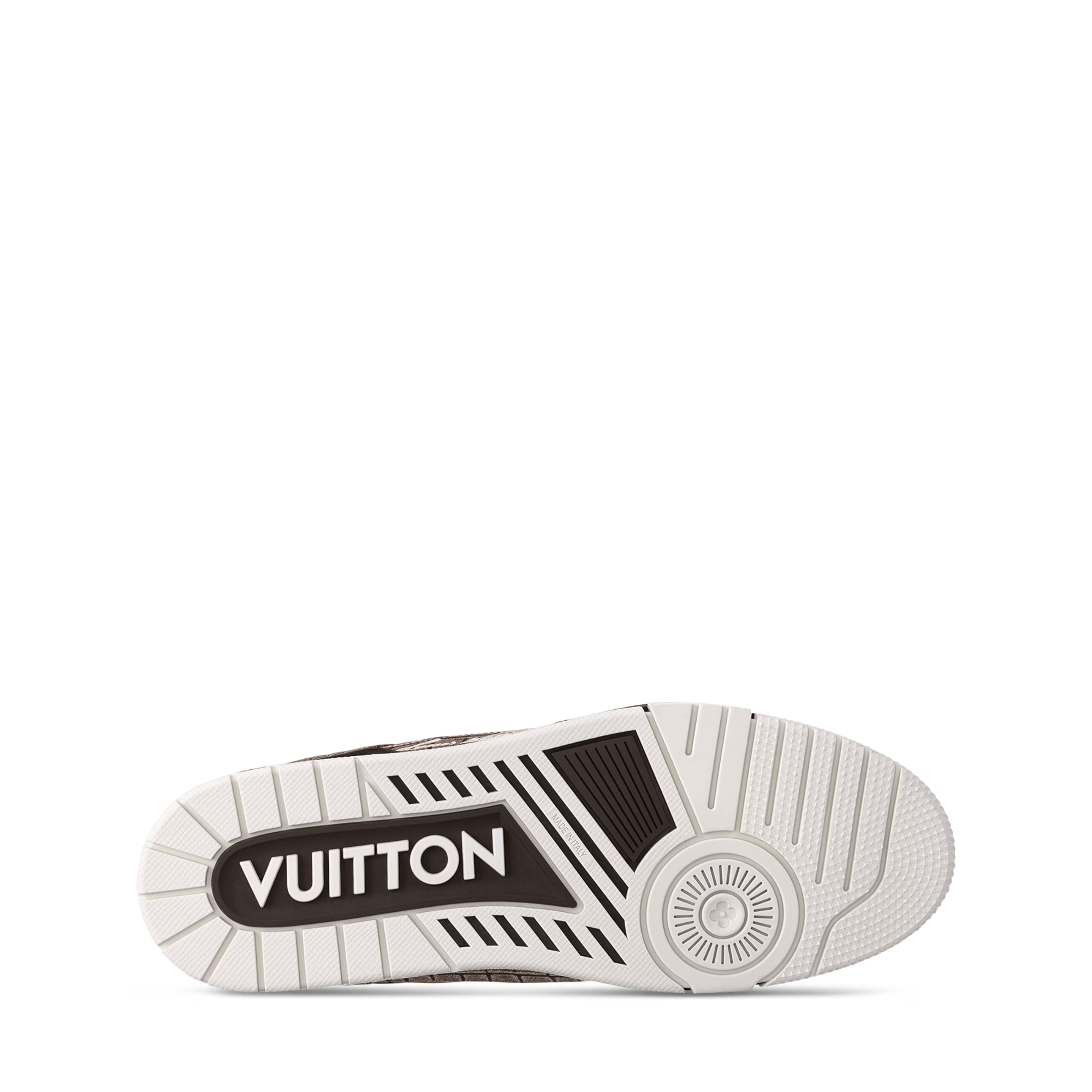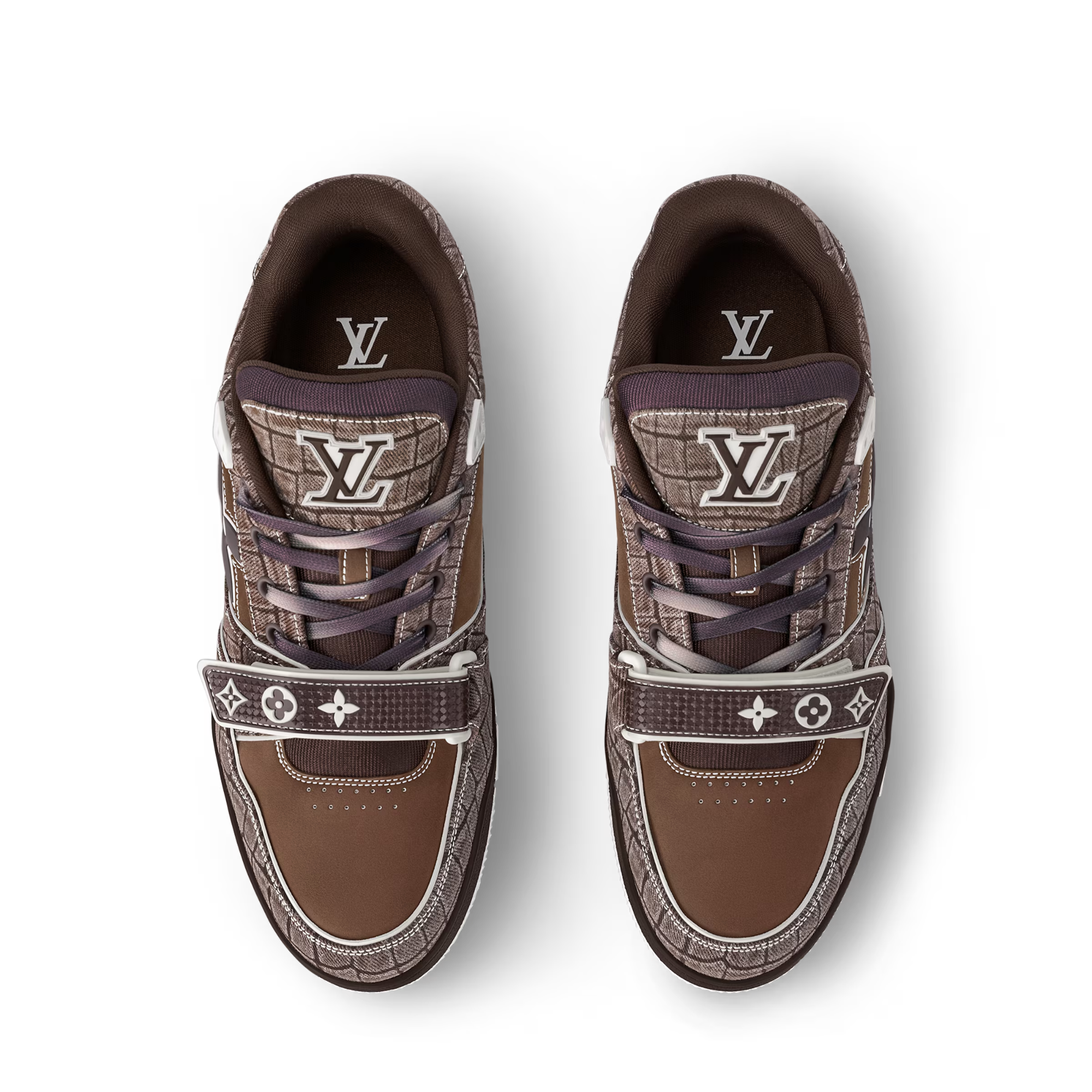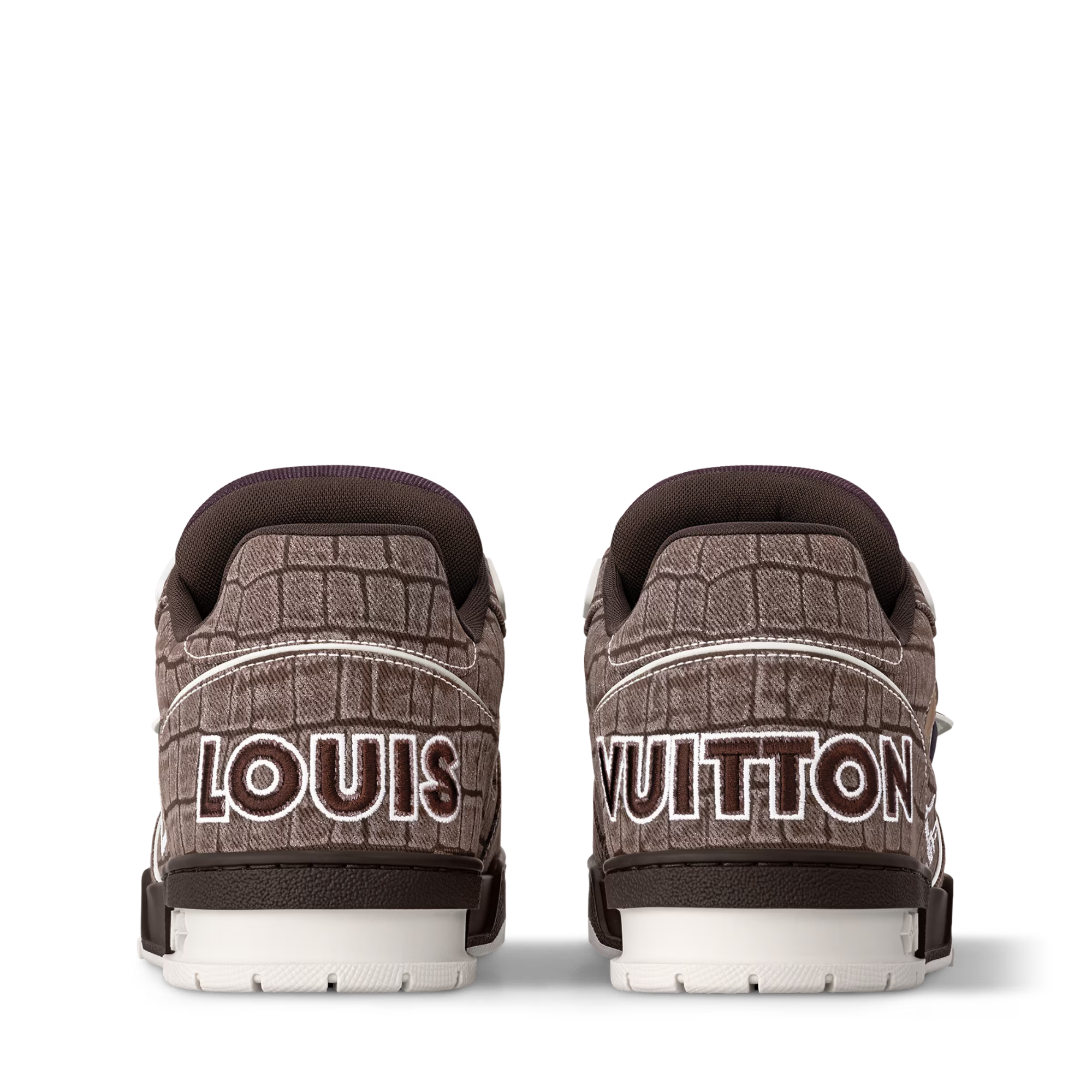 The iconic LV Trainer sneaker is revisited in denim embossed with a crocodile motif. Inspired by vintage basketball sneakers, this model displays an array of House emblems, including the Louis Vuitton script signature, while Monogram Flowers appear on both the upper and outsole. It is fastened with gradient laces and an adjustable velcro strap.