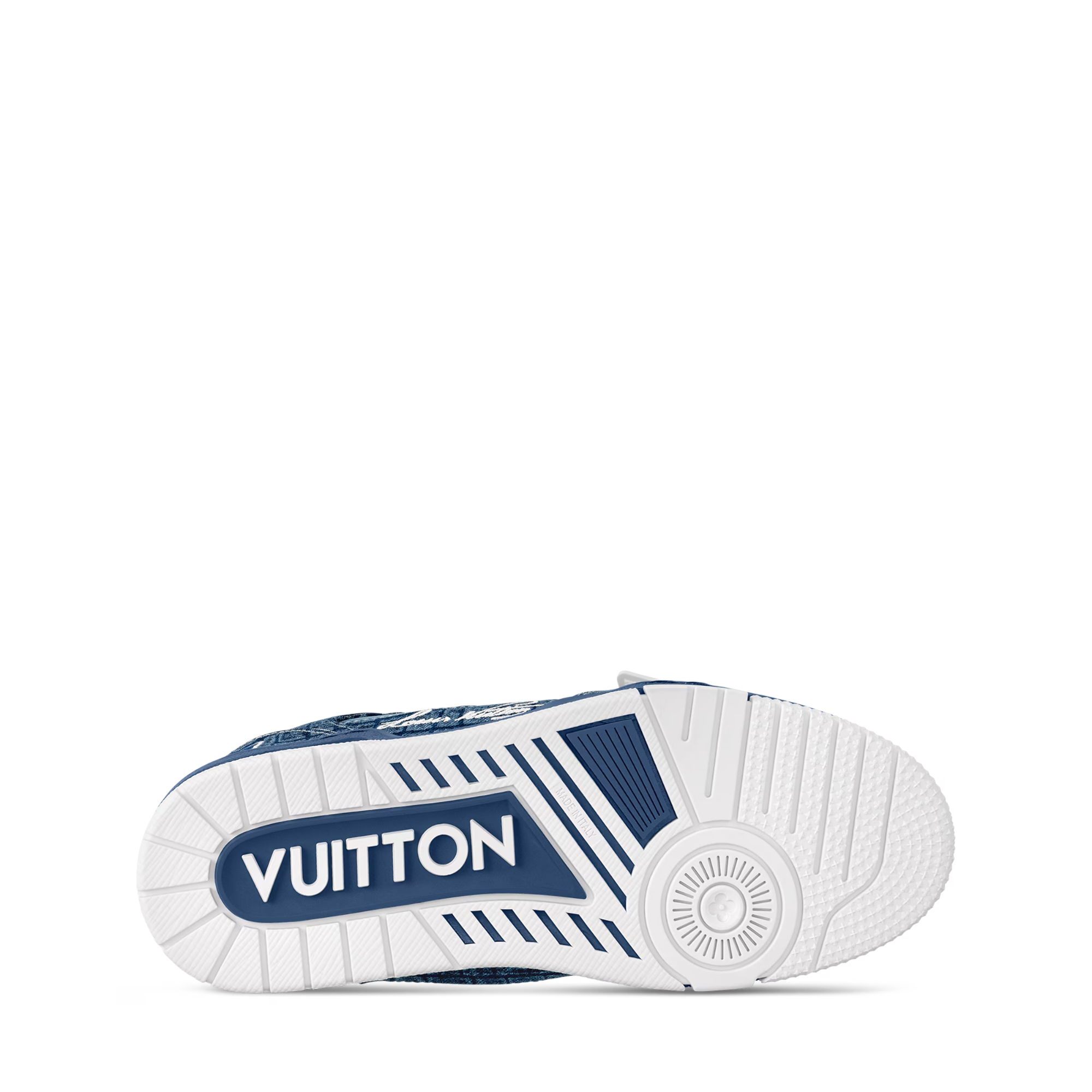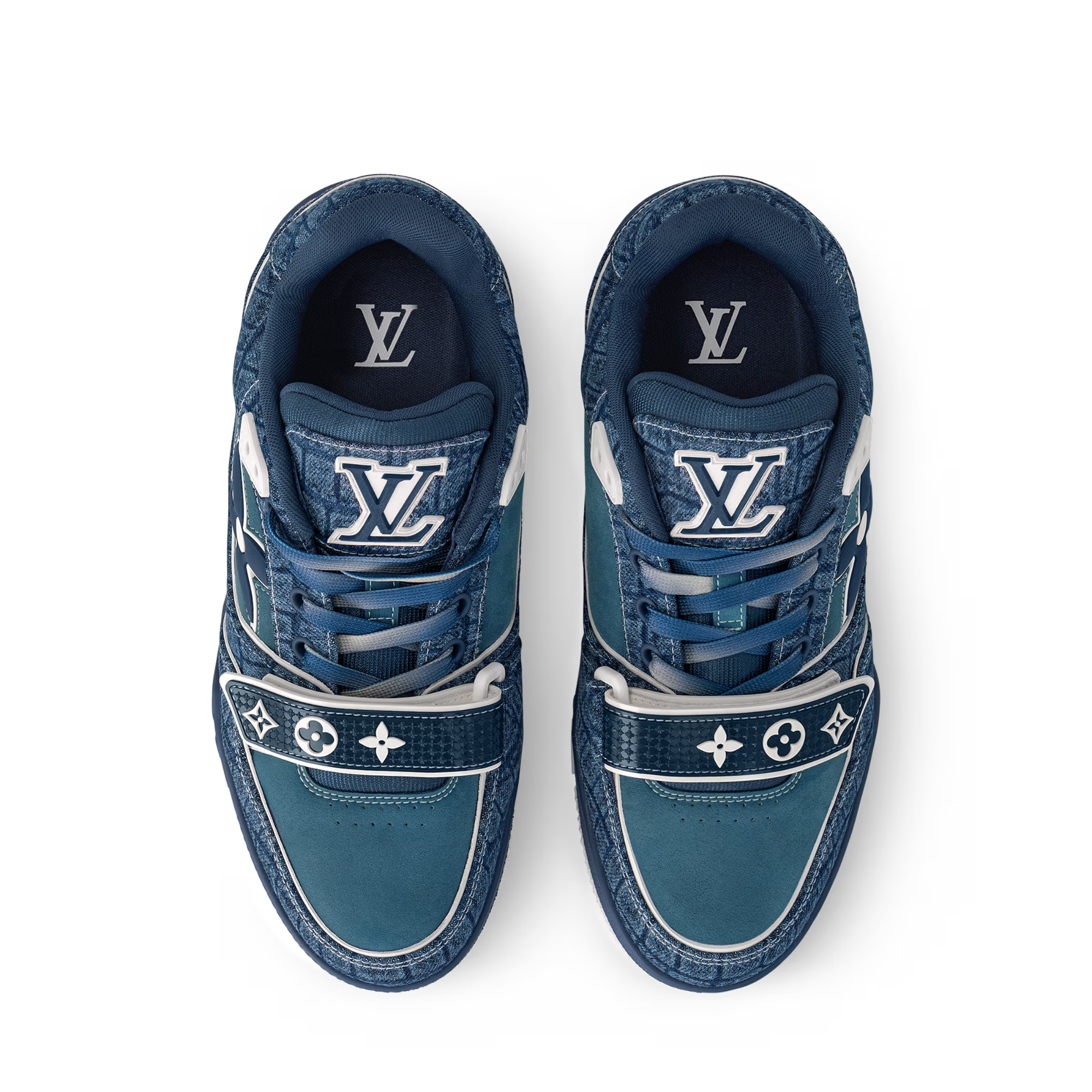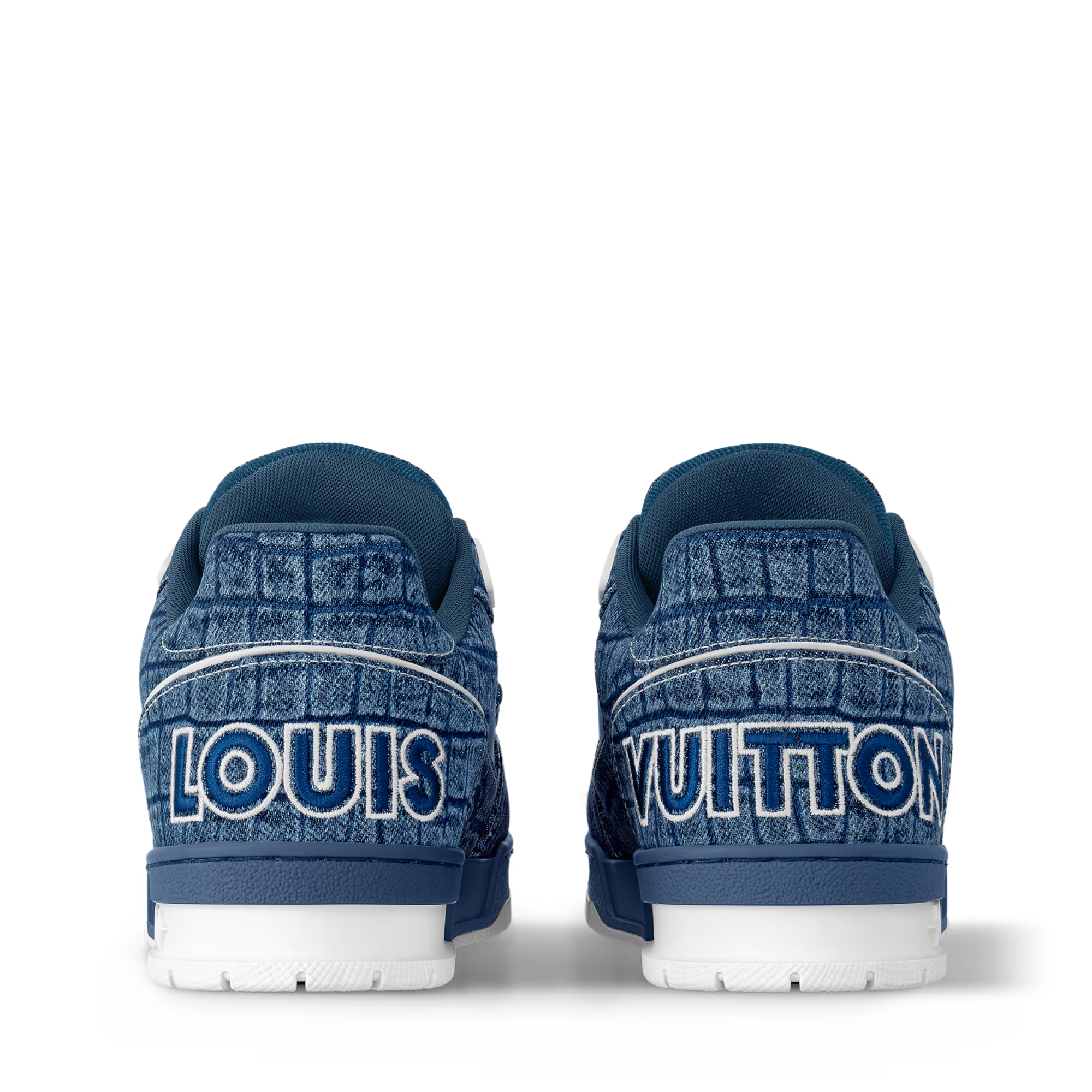 The iconic LV Trainer sneaker is revisited in denim embossed with a crocodile motif. Inspired by vintage basketball sneakers, this model displays an array of House emblems, including the Louis Vuitton script signature, while Monogram Flowers appear on both the upper and outsole. It is fastened with gradient laces and an adjustable velcro strap.