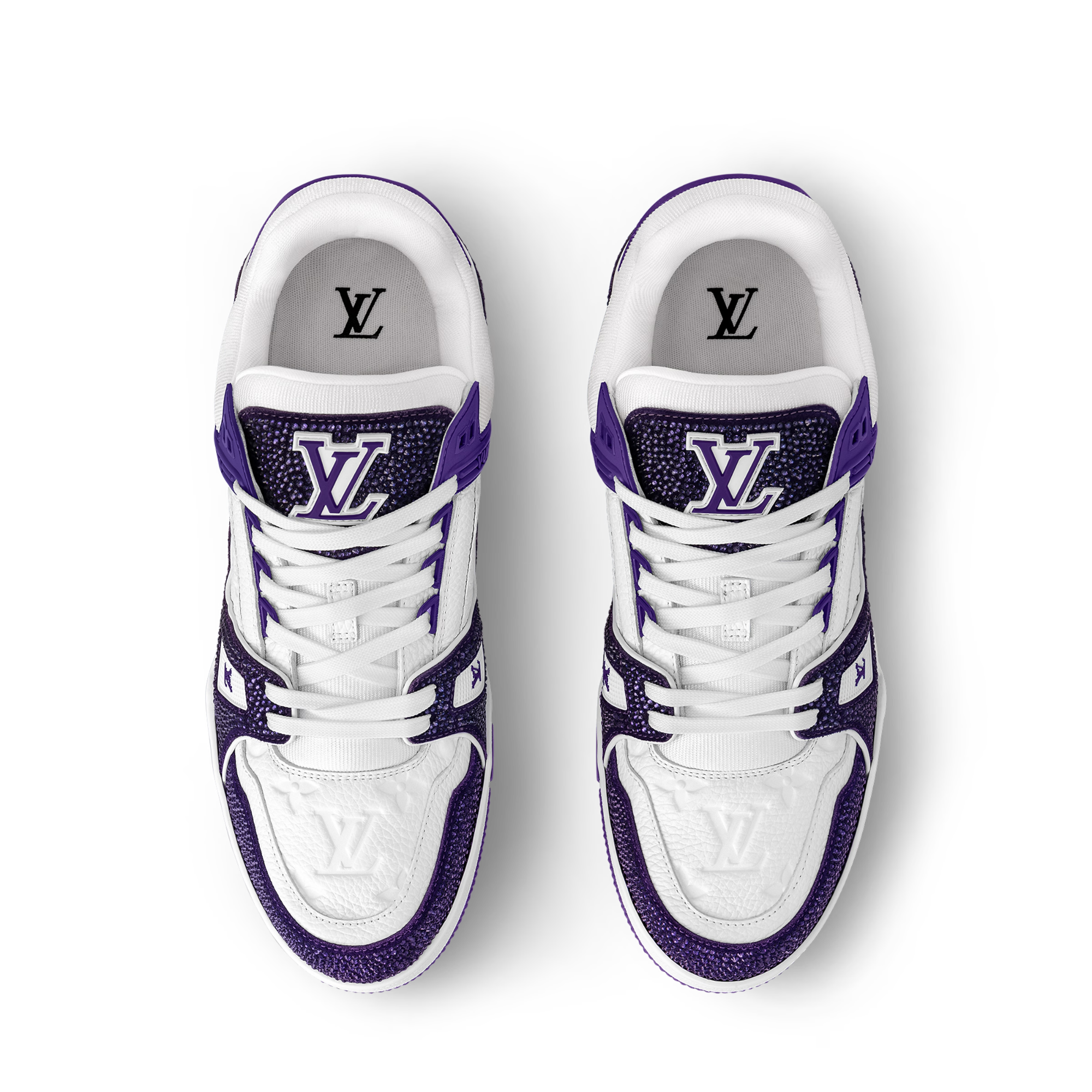 The LV Trainer sneaker is reinterpreted this season in grained calf leather and shimmering Swarovski™ crystals for an eye-catching, two-tone look. Originally designed by Virgil Abloh, this cult model was inspired by vintage basketball sneakers and features an elaborately constructed upper. It is finished with a technical rubber outsole.