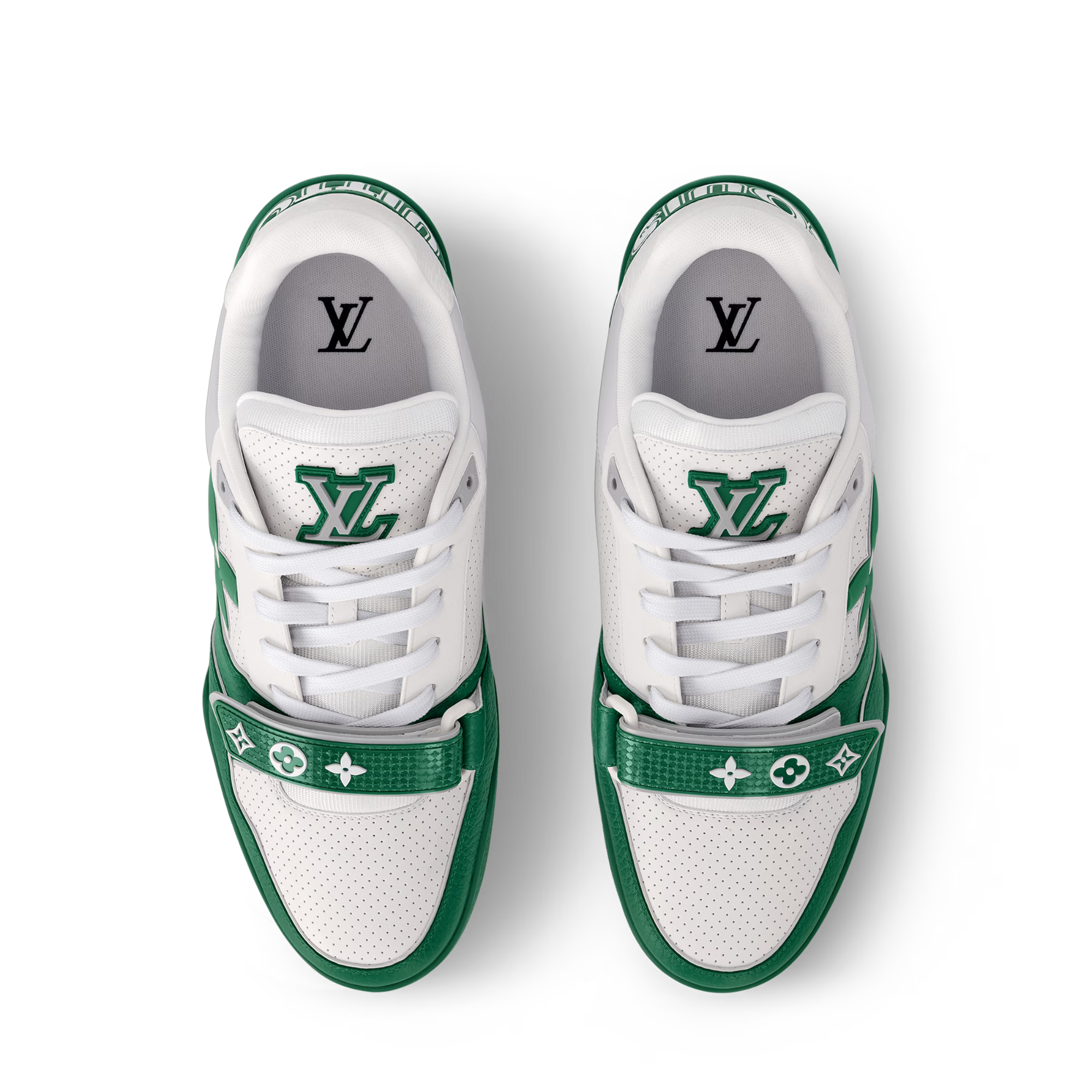 The iconic LV Trainer sneaker is revisited this season in smooth calf leather decorated with pinpoint perforations. Inspired by vintage basketball sneakers, this model is notable for its elaborately constructed upper and its multiple signature details. These include a Monogram Flower on the side and an asymmetric Louis and Vuitton signature at the back.