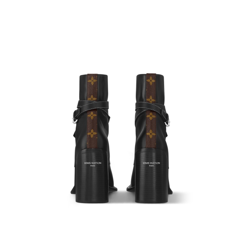 The Berlin ankle boot was a highlight of Nicolas Ghesqui猫re��s 10th anniversary show for Louis Vuitton. This version comes in smooth calf leather embellished with a signature knot detail and silver-toned buckle. Other key details are the trim in Monogram canvas at the back and the Louis Vuitton signature hot-stamped on the high block heel.