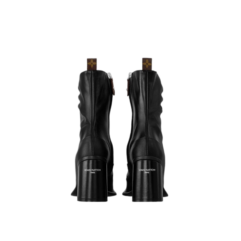 The Berlin ankle boot was one of the key looks at Nicolas Ghesqui猫re��s 10th anniversary fashion show for Louis Vuitton. This retro-futuristic style comes in smooth calf leather with quilted and perforated details inspired by biker jackets. Its high block heel features a half-Monogram Flower detail and a hot-stamped Louis Vuitton signature.