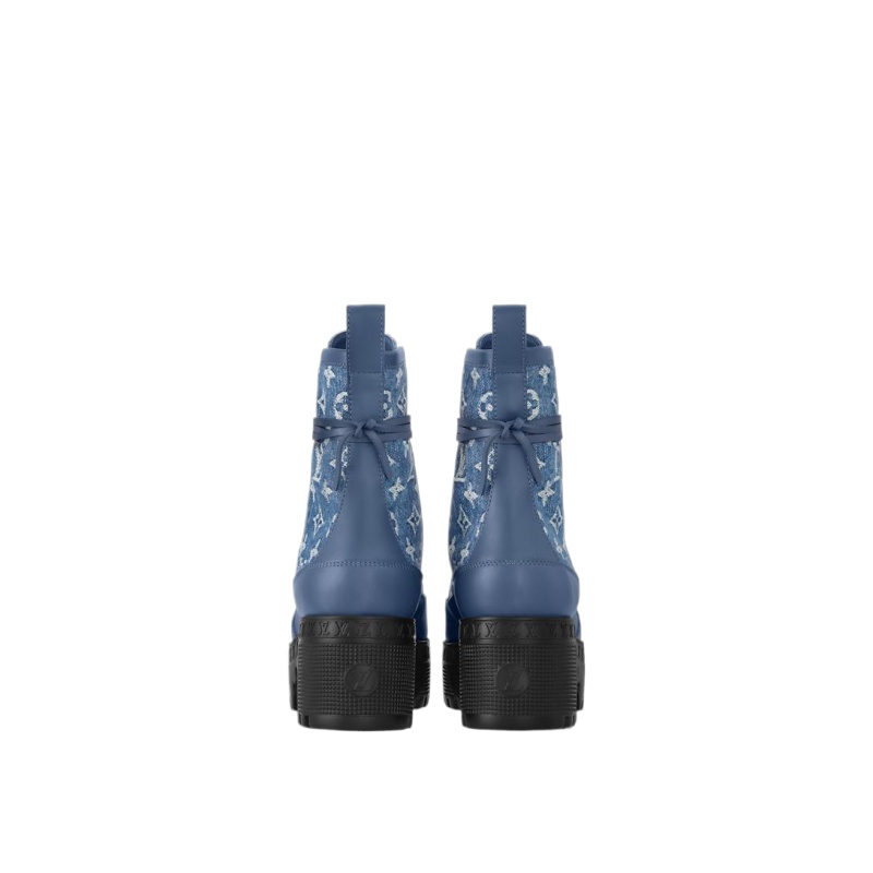 The iconic Laureate platform desert boot is revisited in bleached Monogram denim with coordinating leather trim. On the tongue, a natural leather label is embossed with the Louis Vuitton signature. The treaded rubber outsole, which matches the upper, is decorated with a row of LV Initials inspired by the lozine edging of the House��s historic trunks.