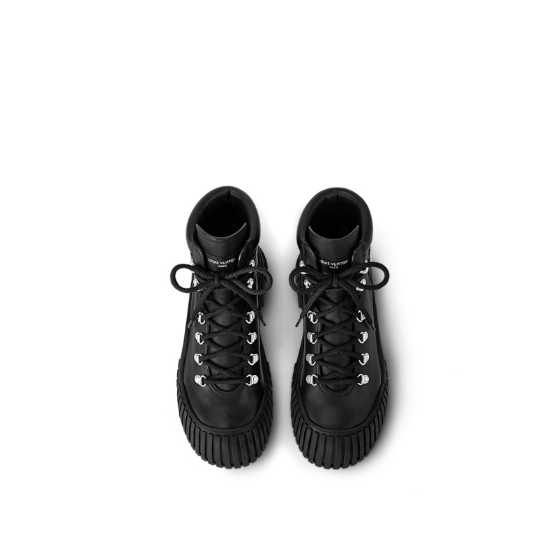 Crafted from smooth calf leather, the Ruby flat ranger combines masculine and feminine codes for a fashion-forward look. This easy-to-wear ankle boot has a chunky yet lightweight rubber outsole, which adds extra height. This model is finished with technical, bicolor laces and the LV Circle signature on a rubber patch on the side.