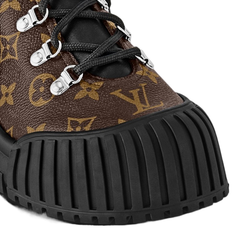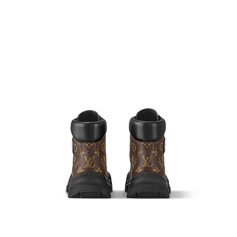 The Ruby flat ranger combines Louis Vuitton��s iconic Monogram canvas with a tongue and collar in smooth calf leather. This versatile ankle boot balances masculine and feminine codes for a fashion-forward look. It is finished with technical, bicolor laces and a chunky yet lightweight rubber outsole, which adds extra height.